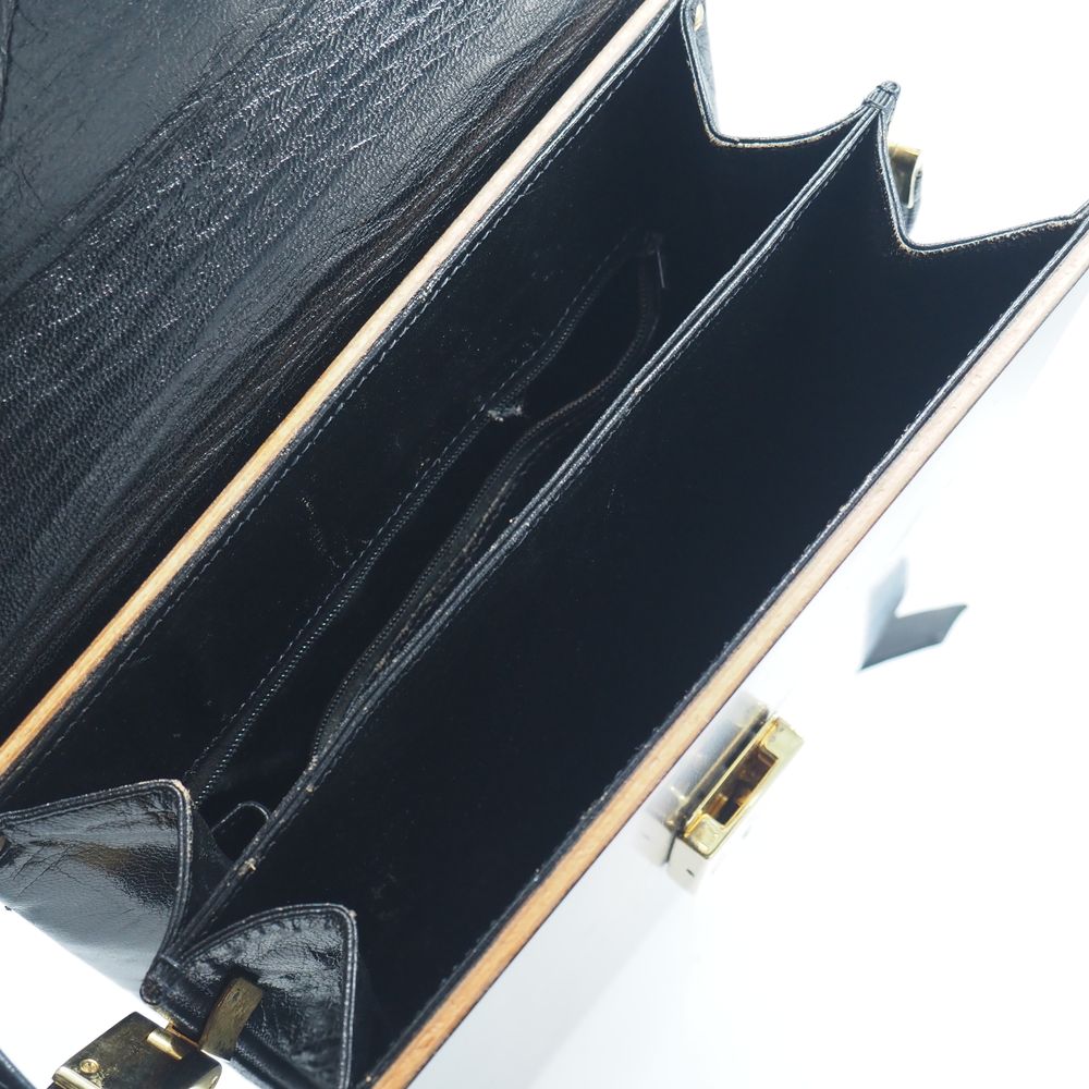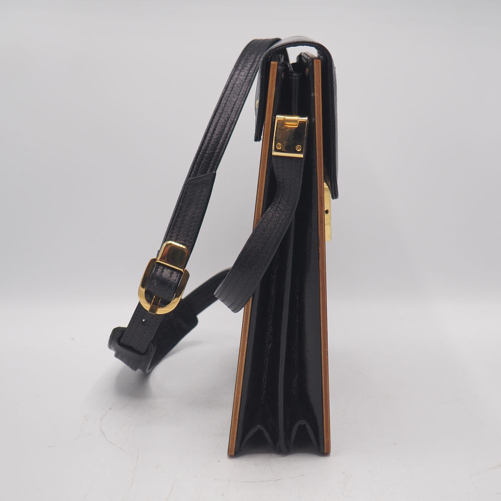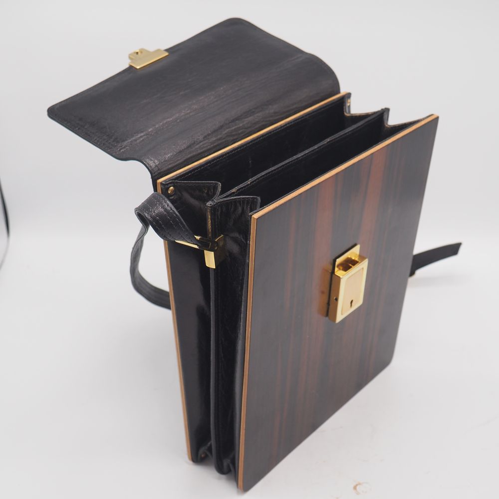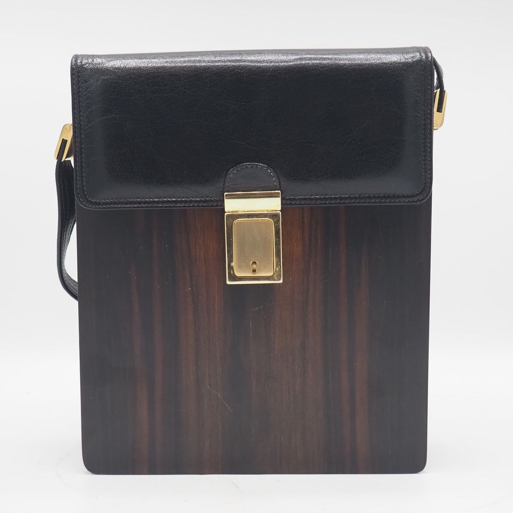 Sac de dame vers 1970 : Cuir, palissandre et métal doré, 2 parties intérieur + pochettes et bandoulière, dim: 27 x 234, P: +/- 10 cm