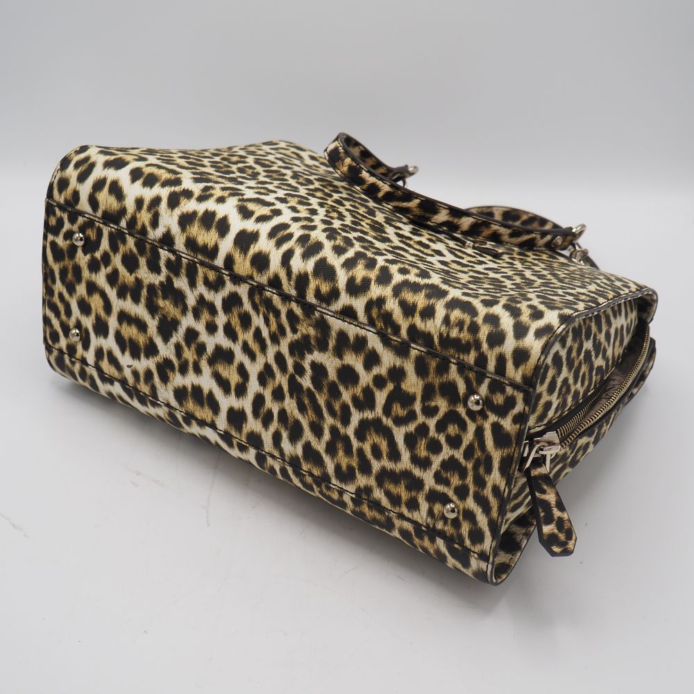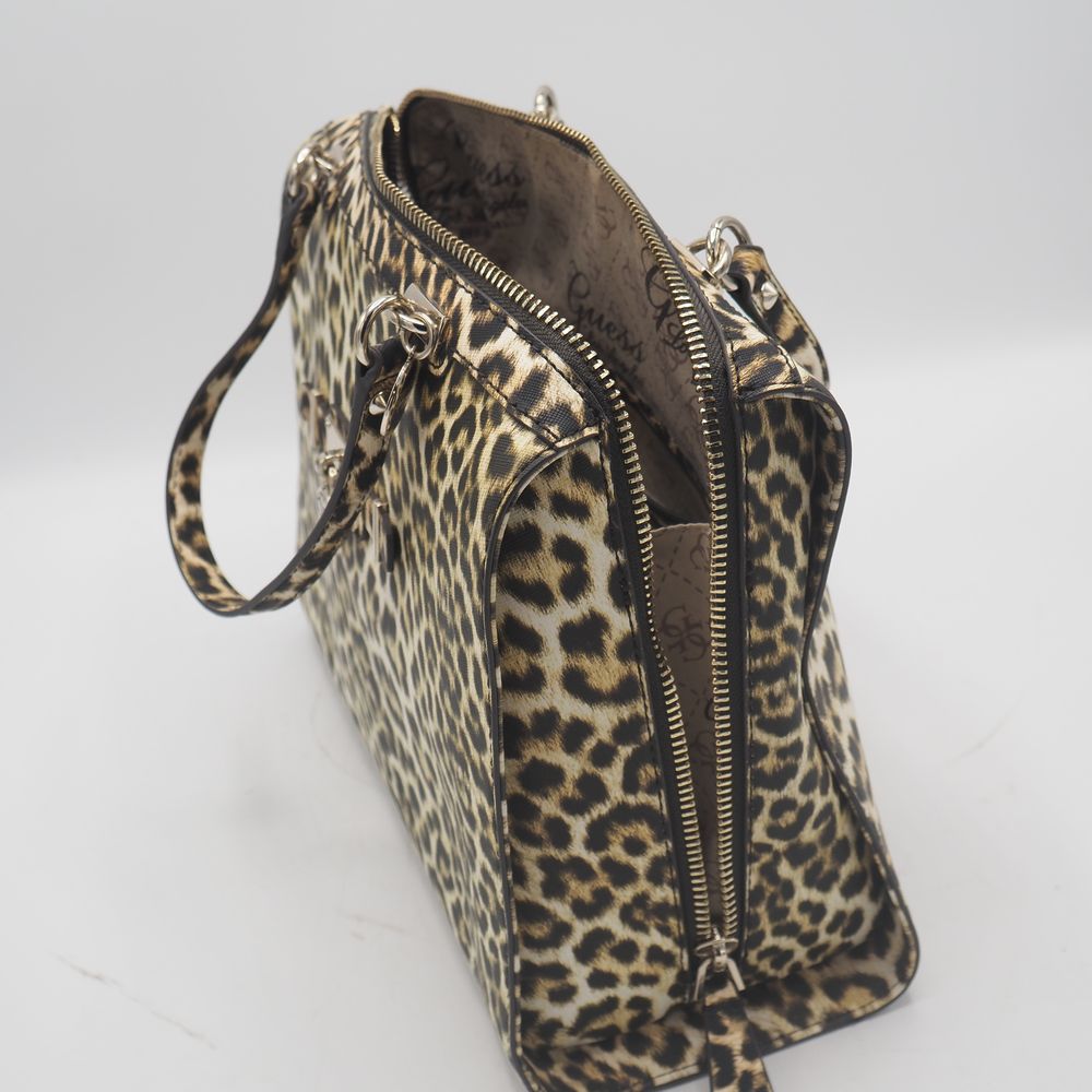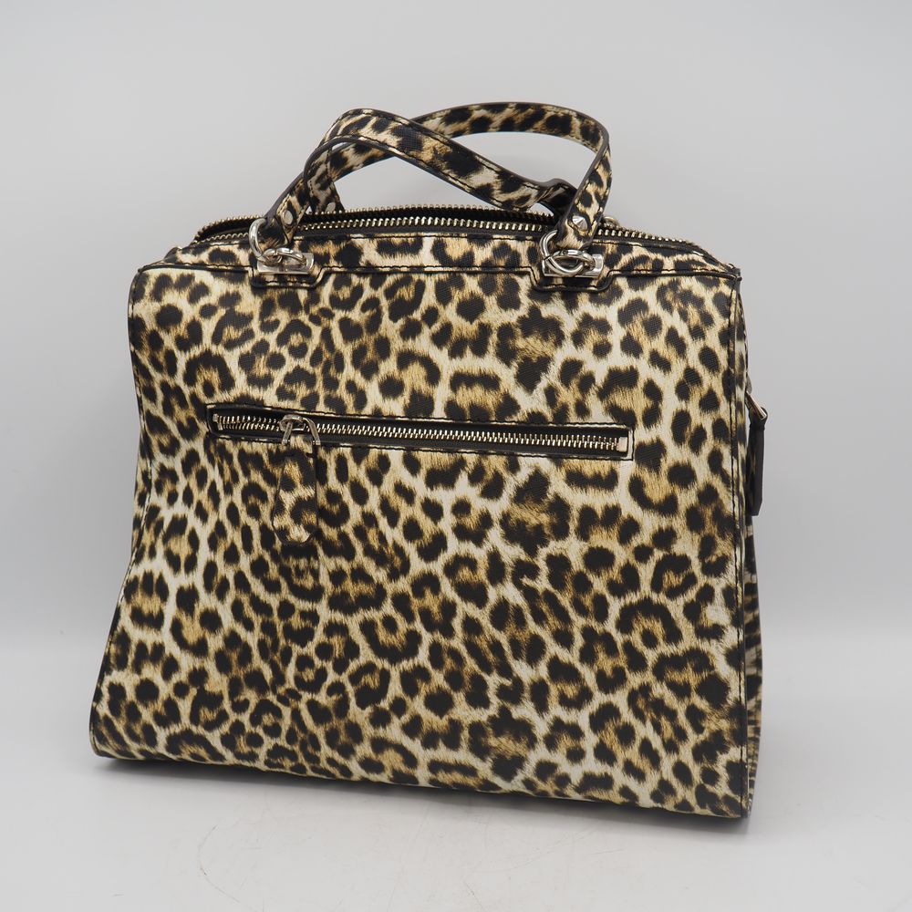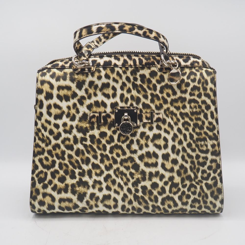 Sac de dame : Vinyle imitation léopard, 2 anses, 1 poche extérieur avec zip et compartiments et pochette intérieure, parfait état, H: 27, L: 31, P: 15 cm