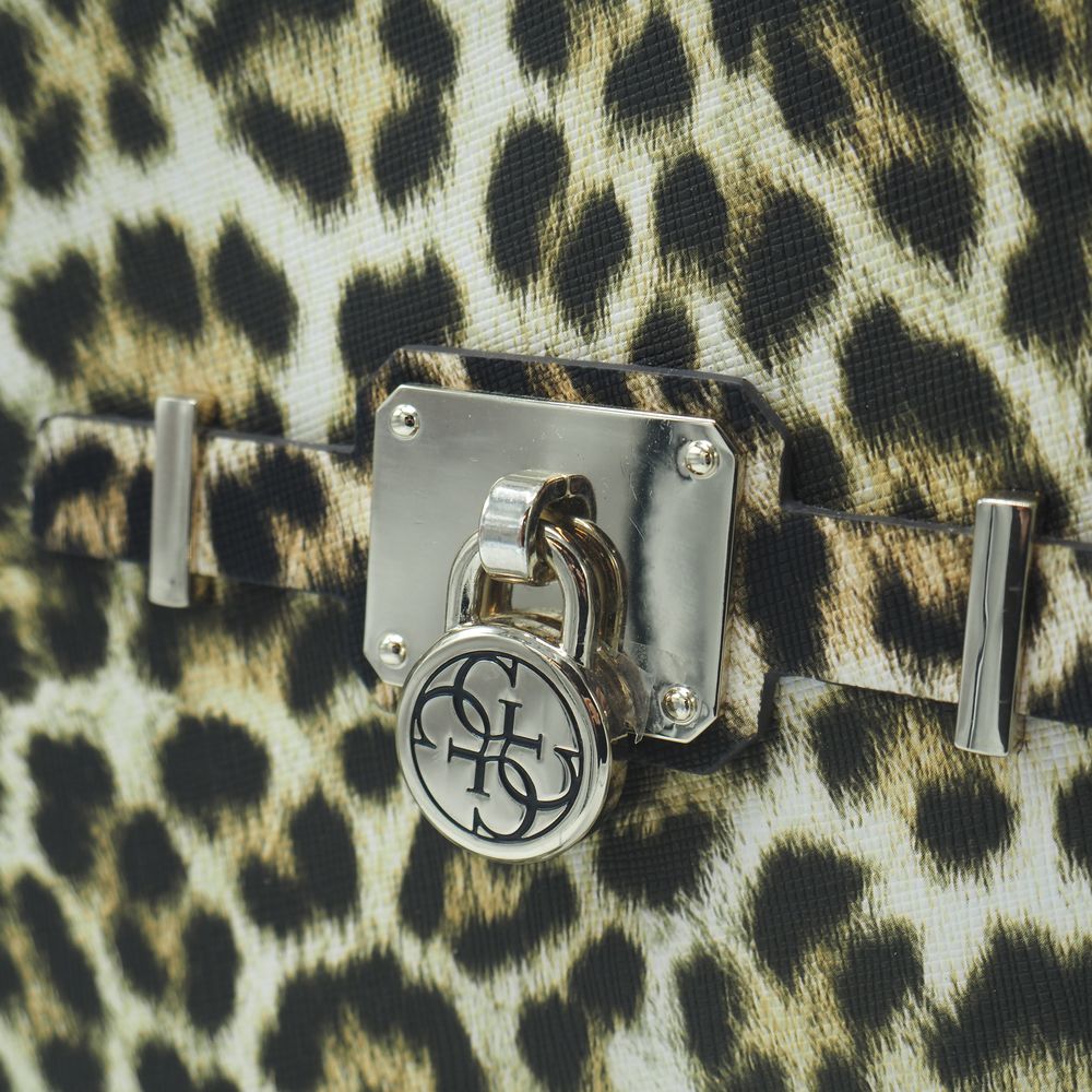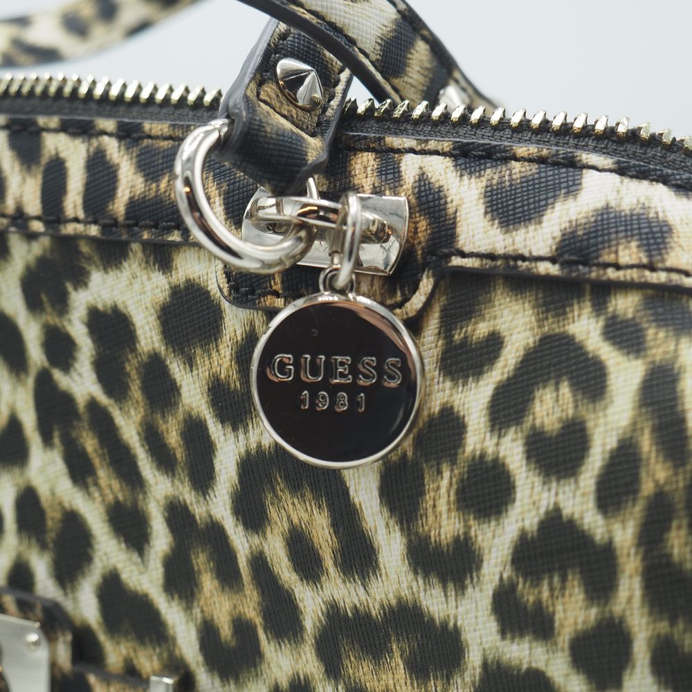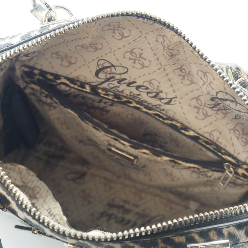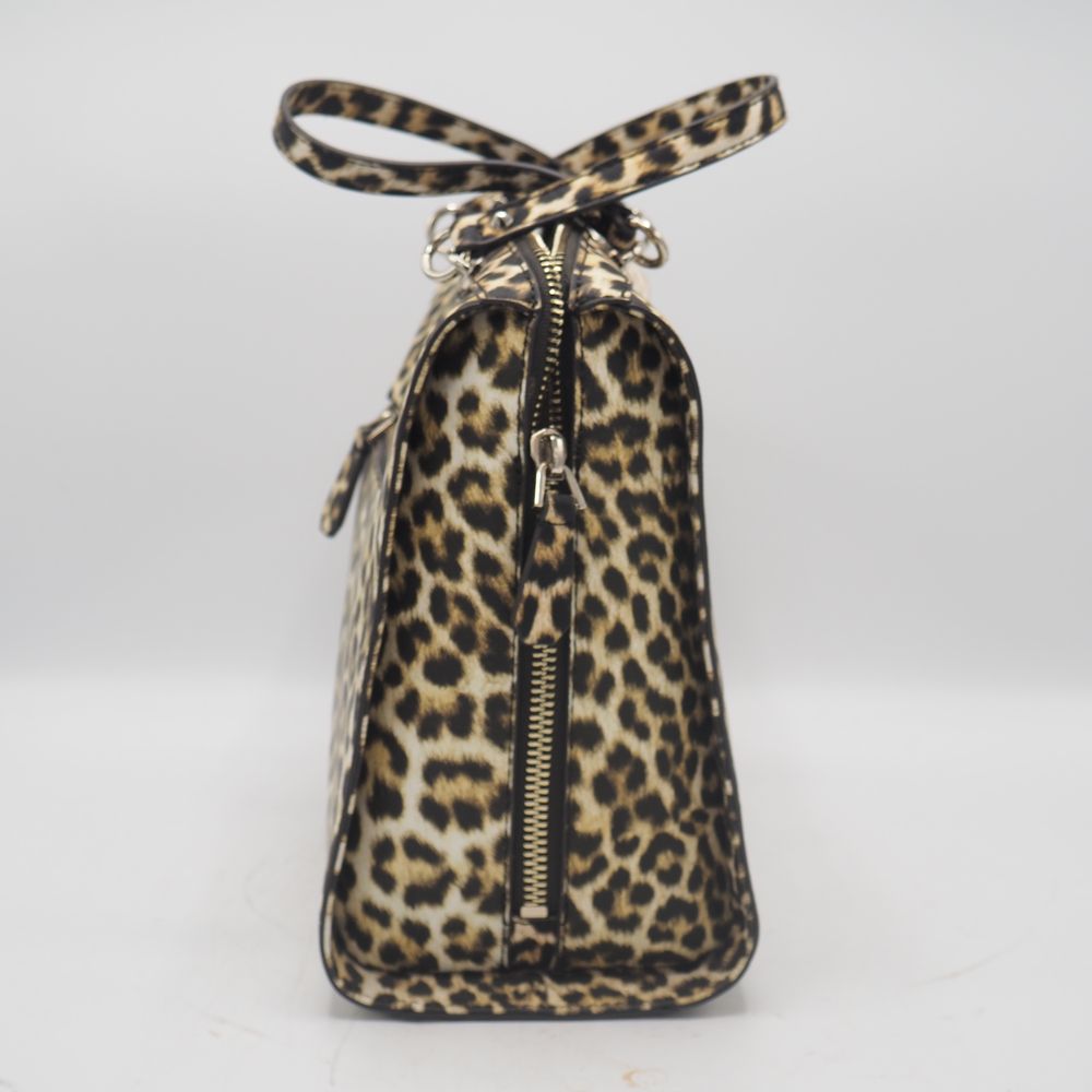Sac de dame : Vinyle imitation léopard, 2 anses, 1 poche extérieur avec zip et compartiments et pochette intérieure, parfait état, H: 27, L: 31, P: 15 cm