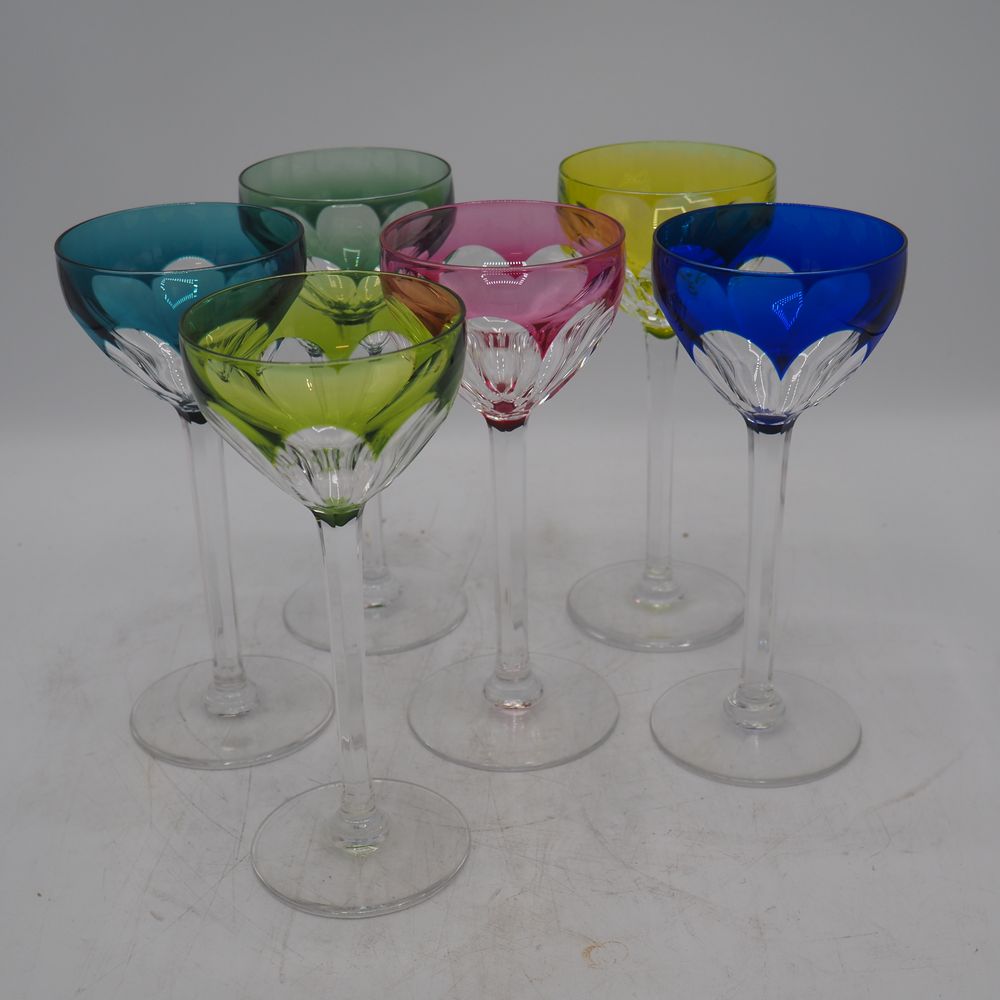 Val Saint-Lambert : Série de 6 verres de couleurs différentes, cristal clair taillé doublé, coupe ovoide, jambe à section hexagonale, pied disque, H: 19 cm
