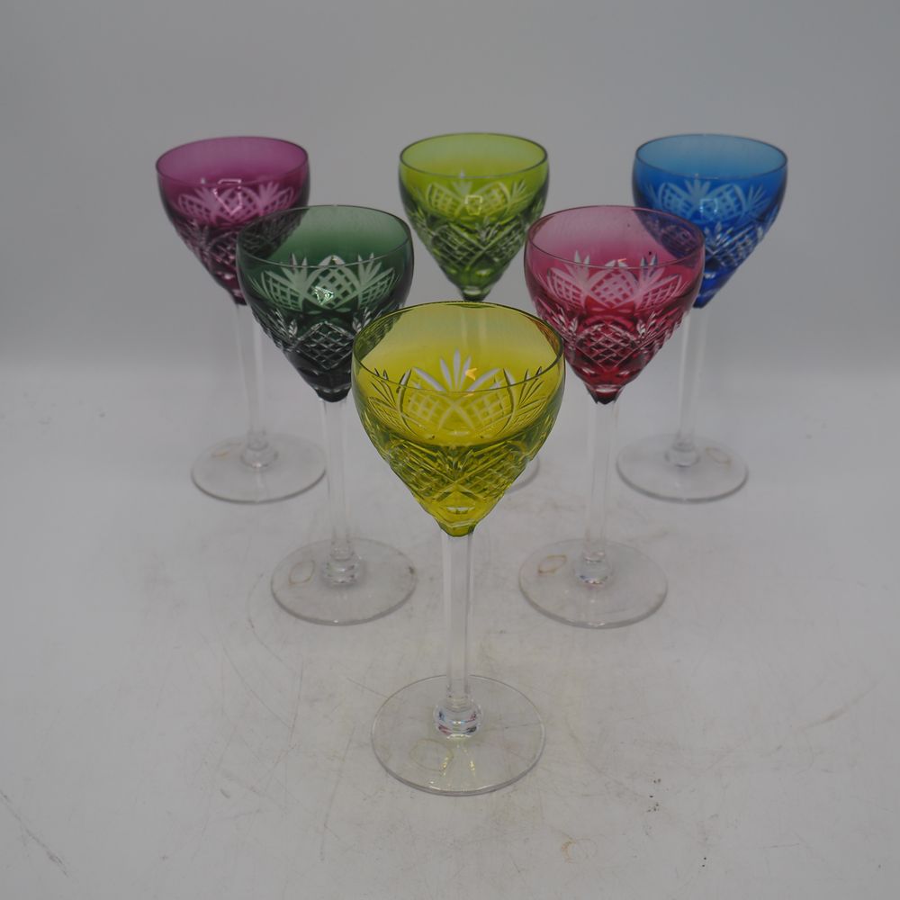 Val Saint-Lambert : Suite de 6 verres, cristal clair taillé et doublé de 6 couleurs différentes, coupe ovoide, jambe à section hexagonale, pied disque, trace de l’ancienne étiquetté VSL, H: 18,7, diam: 7,7 cm