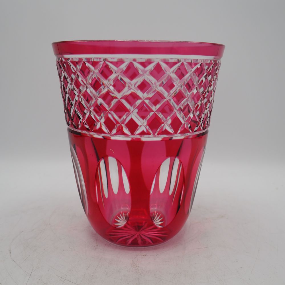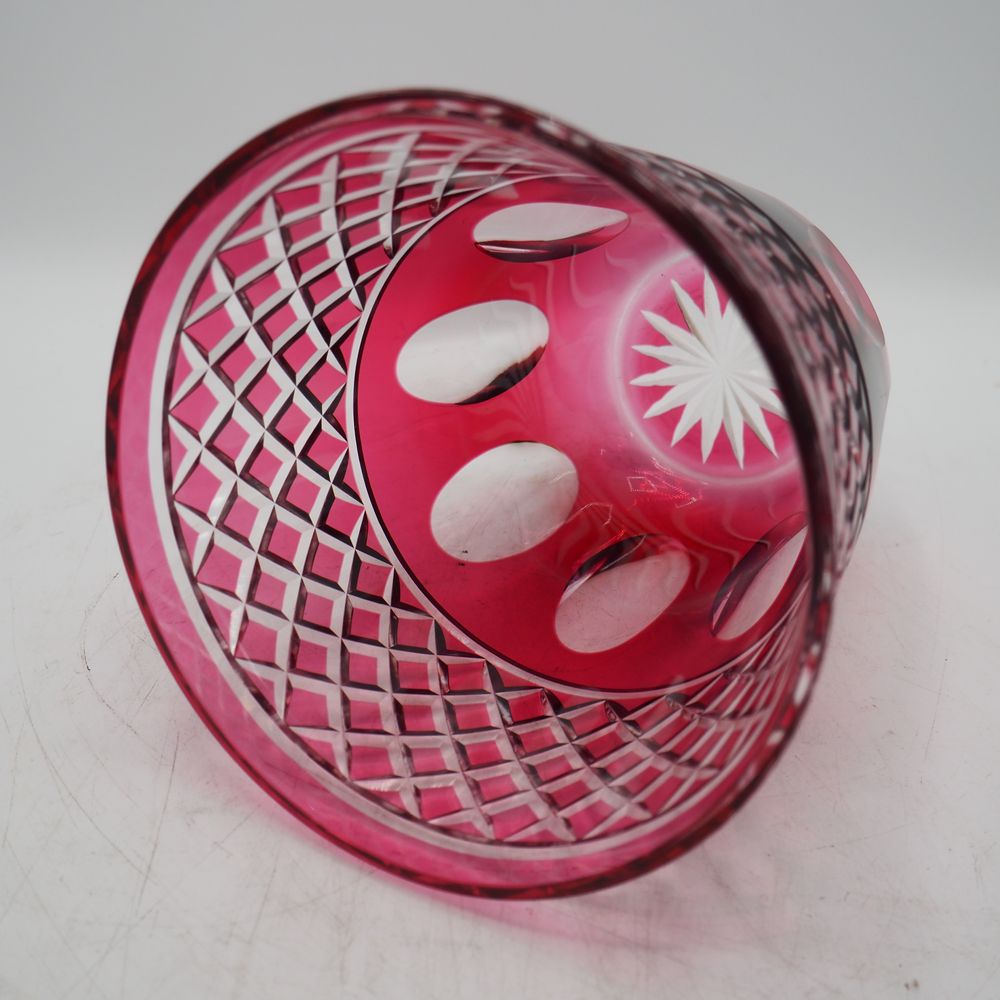 Val Saint-Lambert : Vase vers 1950, cristal soufflé bouche taillé couleur rubis, motifs de losanges et olives, H: 18,6, diam: 16 cm