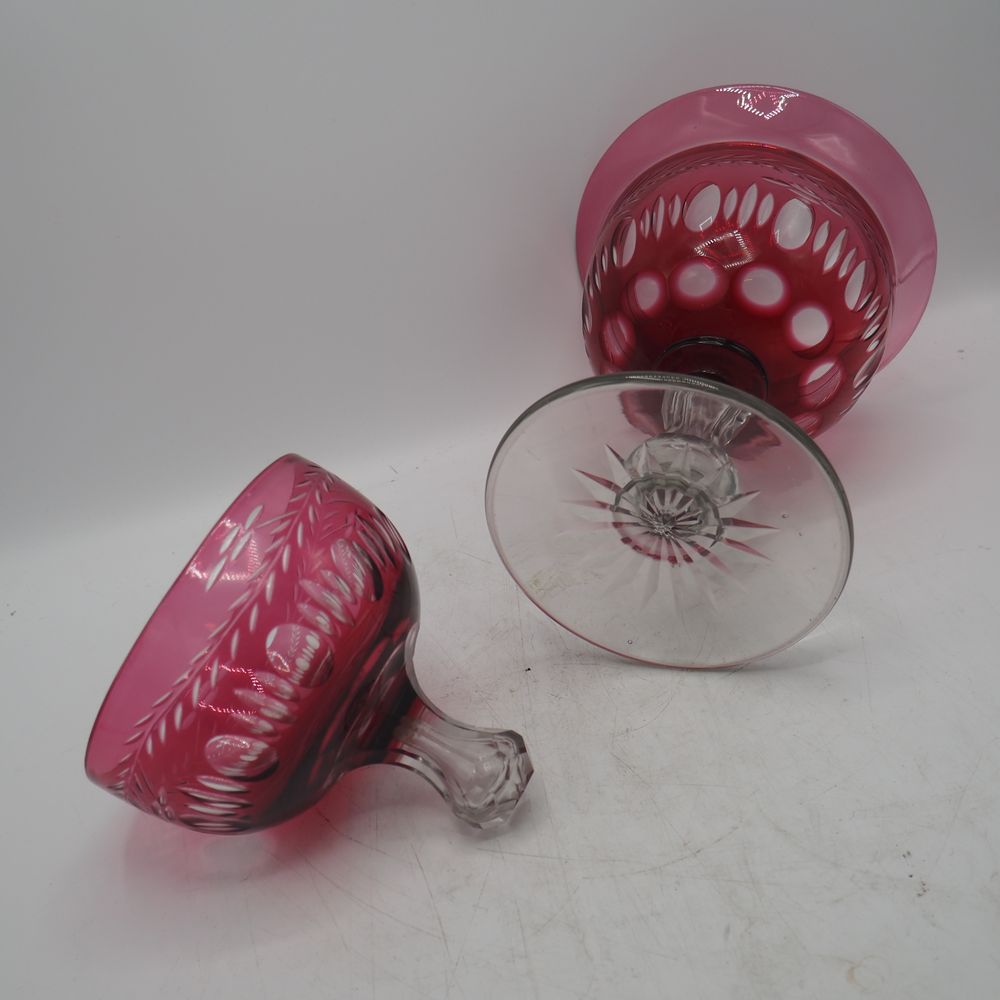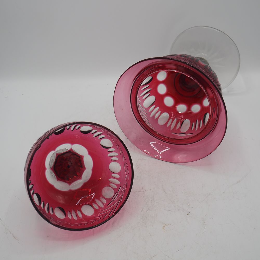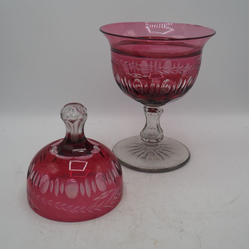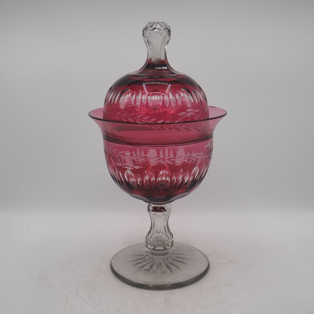 Val Saint-Lambert : Drageoir vers 1950, cristail clair soufflé bouche, dtaillé et doublé rouge, décor à l’épi avec olives, jambe de forme balustre, pied disque avec étoile, H: 34, diam: 17,9 cm
