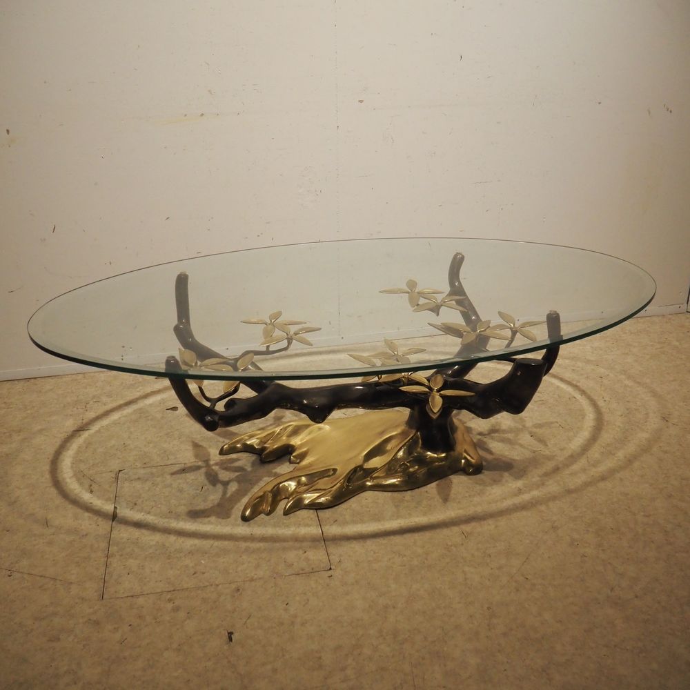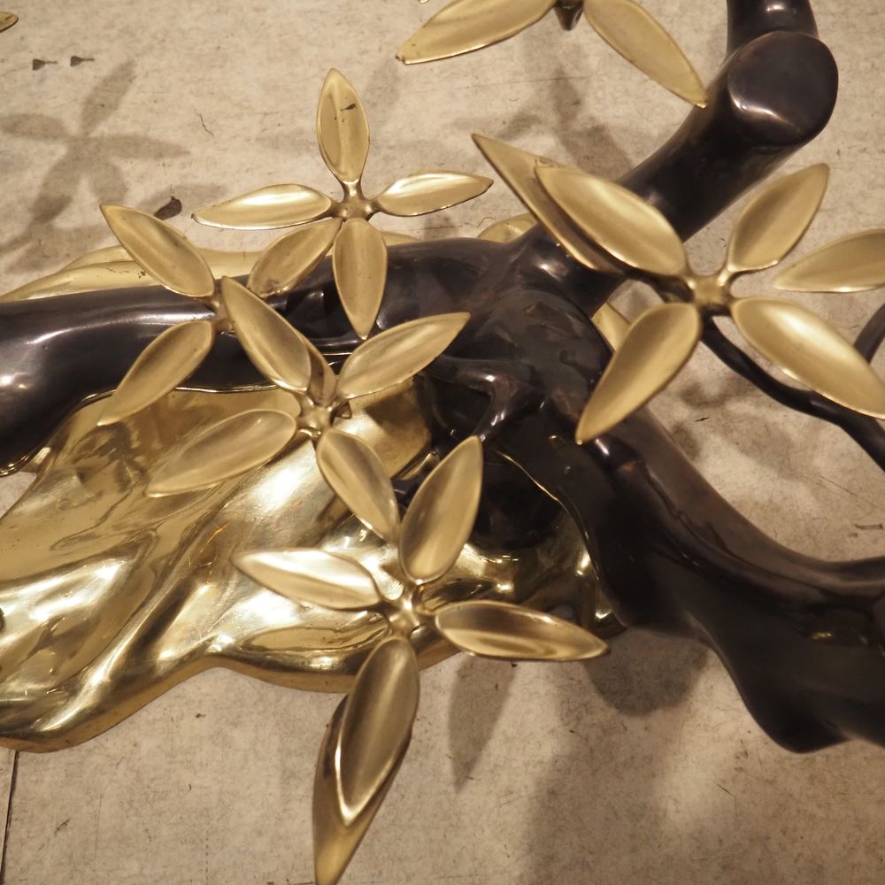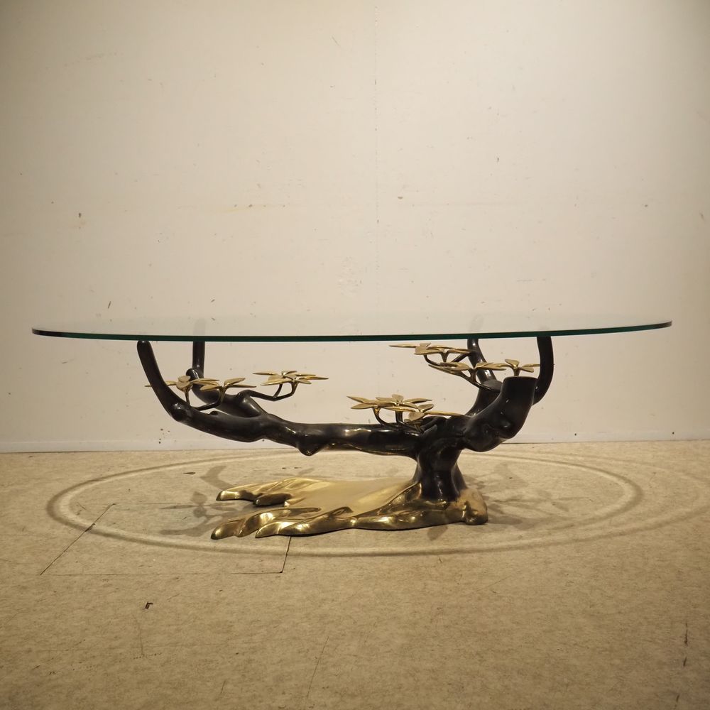 Willy Daro 1918 – 1990 : Table basse vers 1970, modèle Bonzaï, plateau élipticale en cristal clair biseauté, posé sur un piétement en bronze de forme végétal à patine foncée et dorée, édition vers 1970, H: 43, L: 140, P: 80 cm