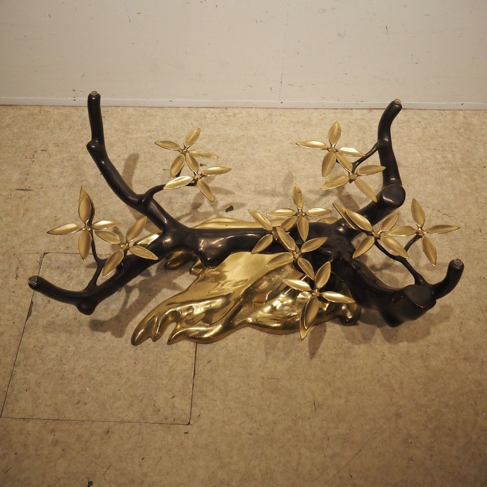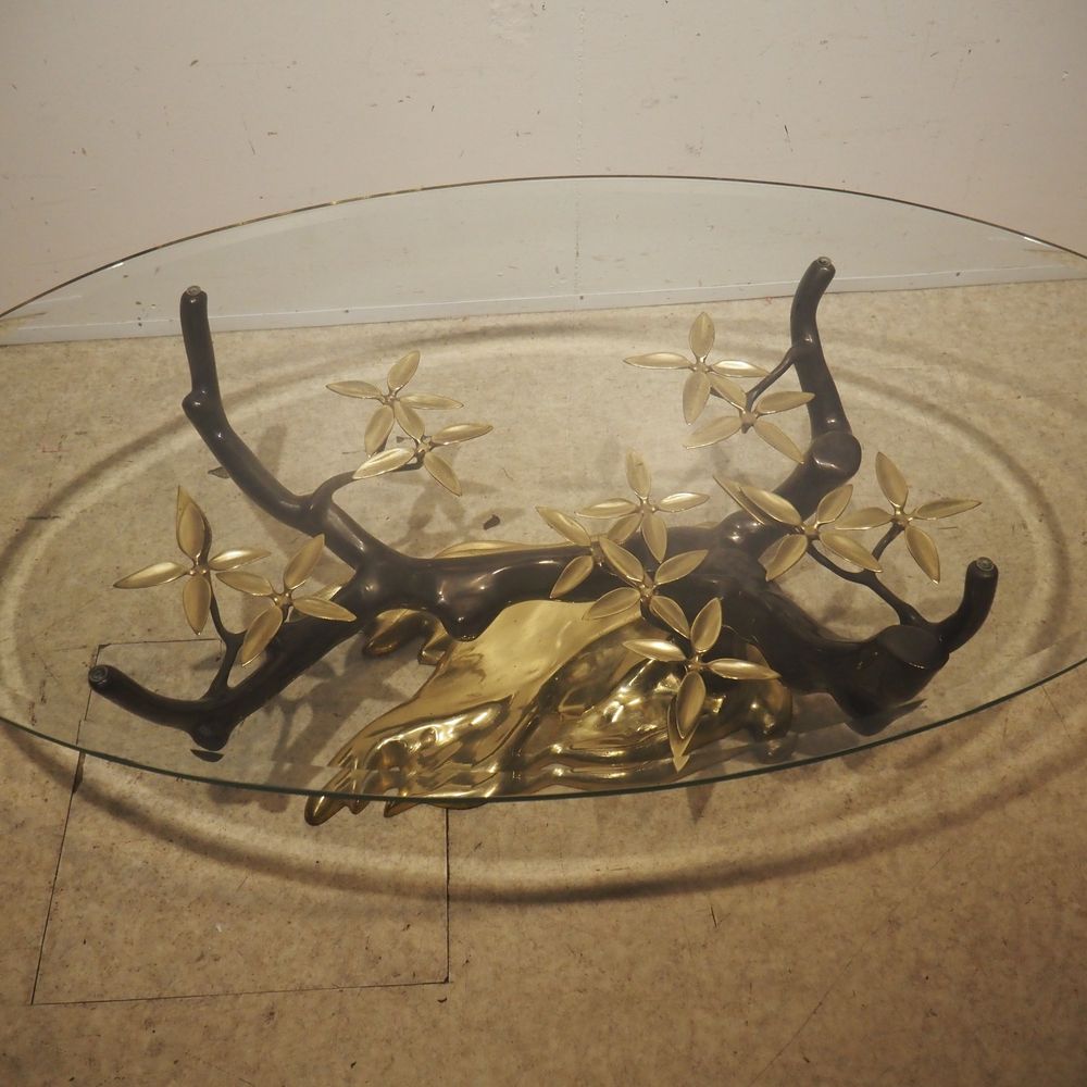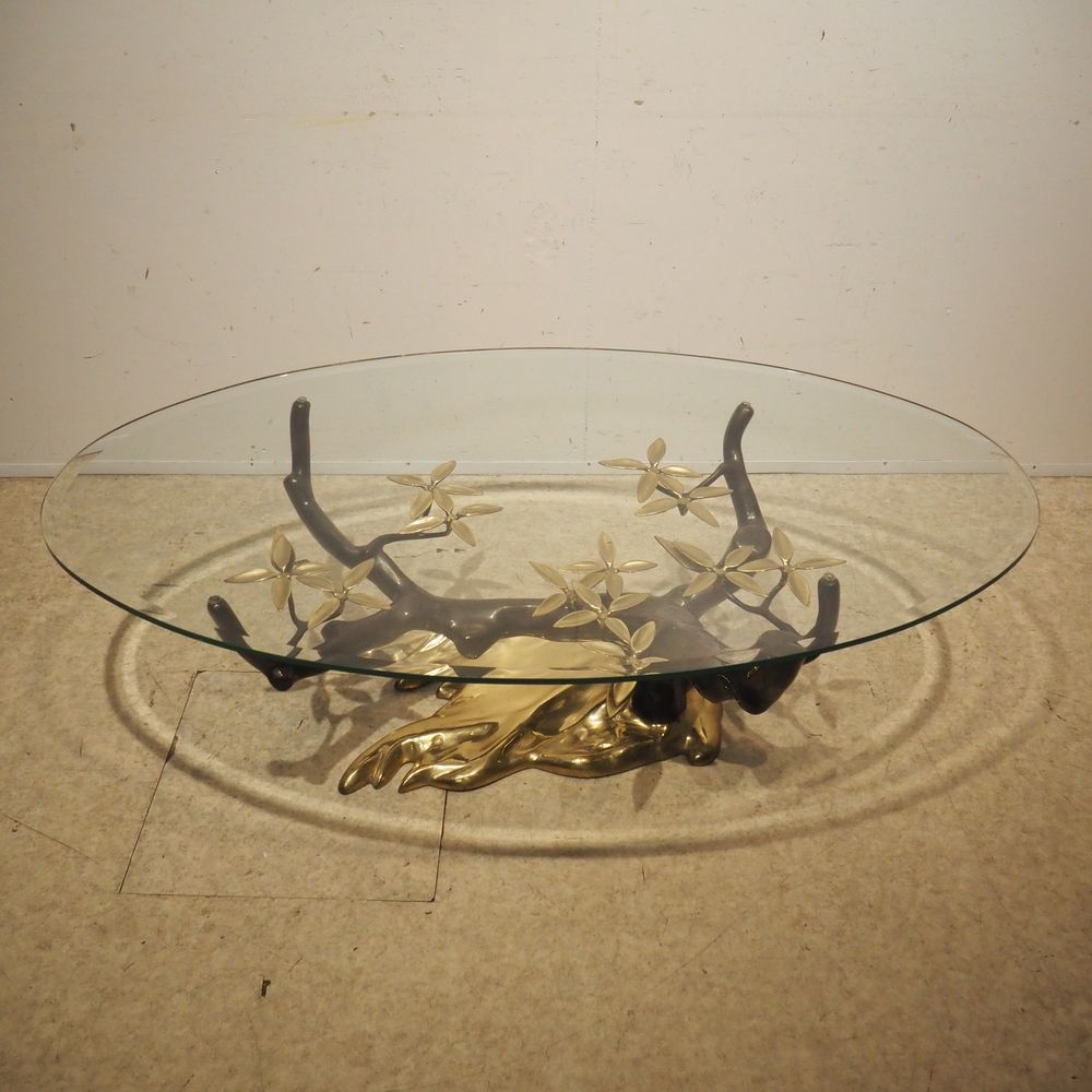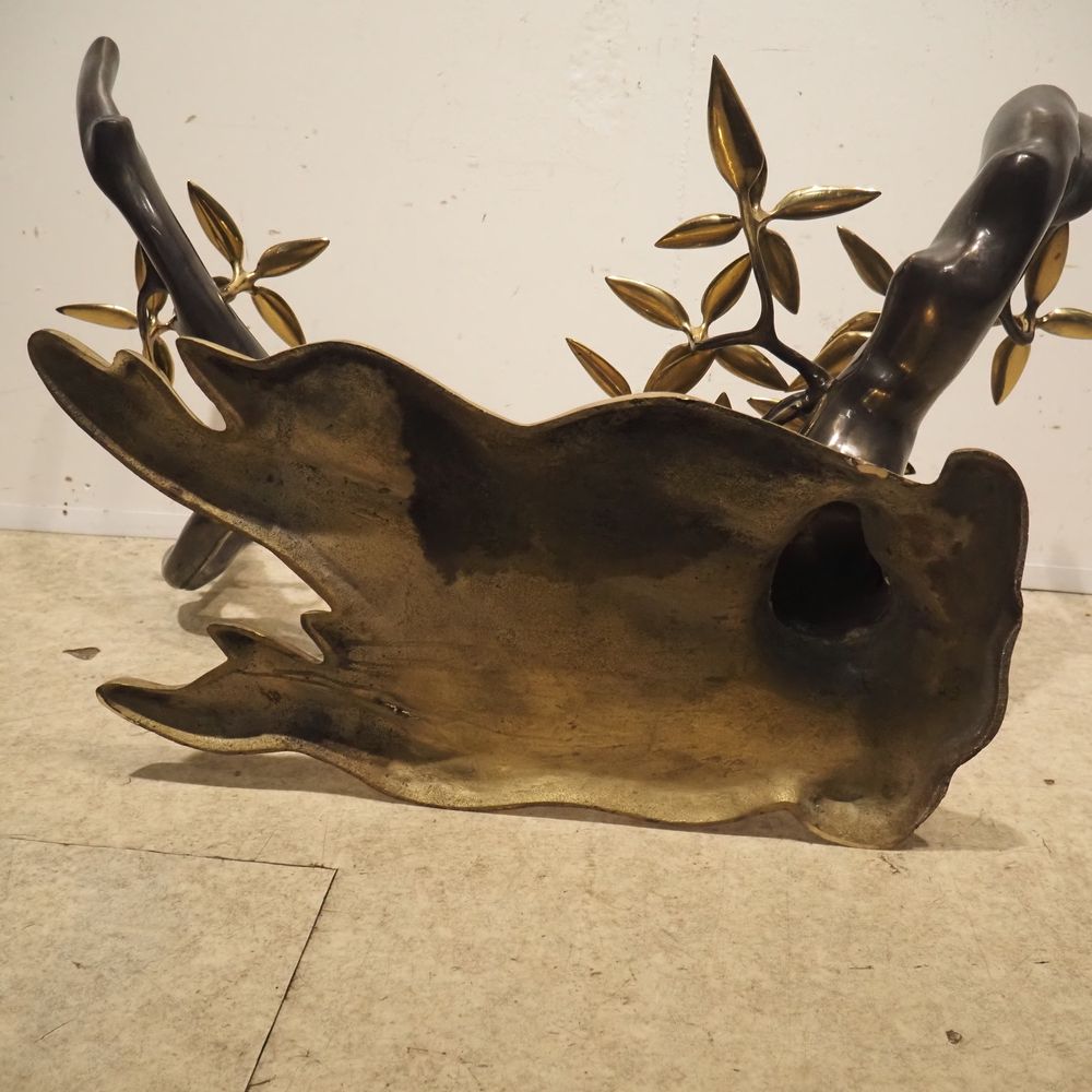 Willy Daro 1918 – 1990 : Table basse vers 1970, modèle Bonzaï, plateau élipticale en cristal clair biseauté, posé sur un piétement en bronze de forme végétal à patine foncée et dorée, édition vers 1970, H: 43, L: 140, P: 80 cm