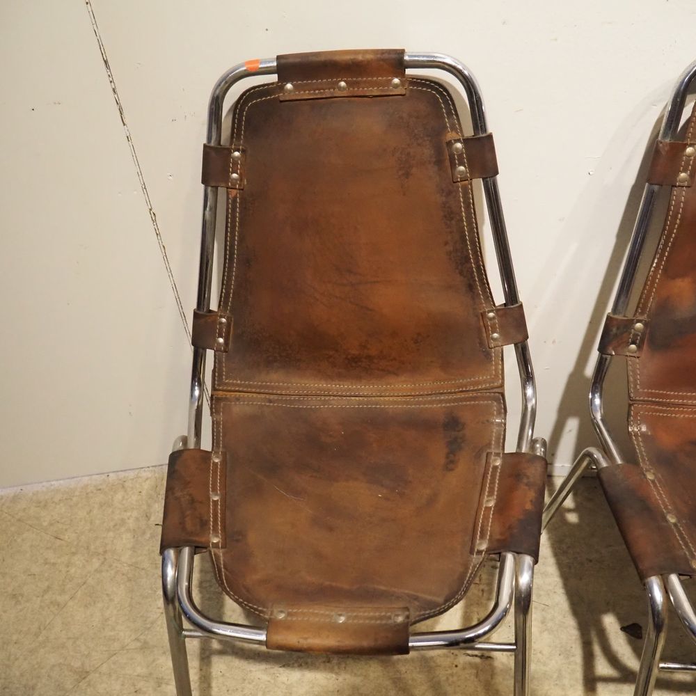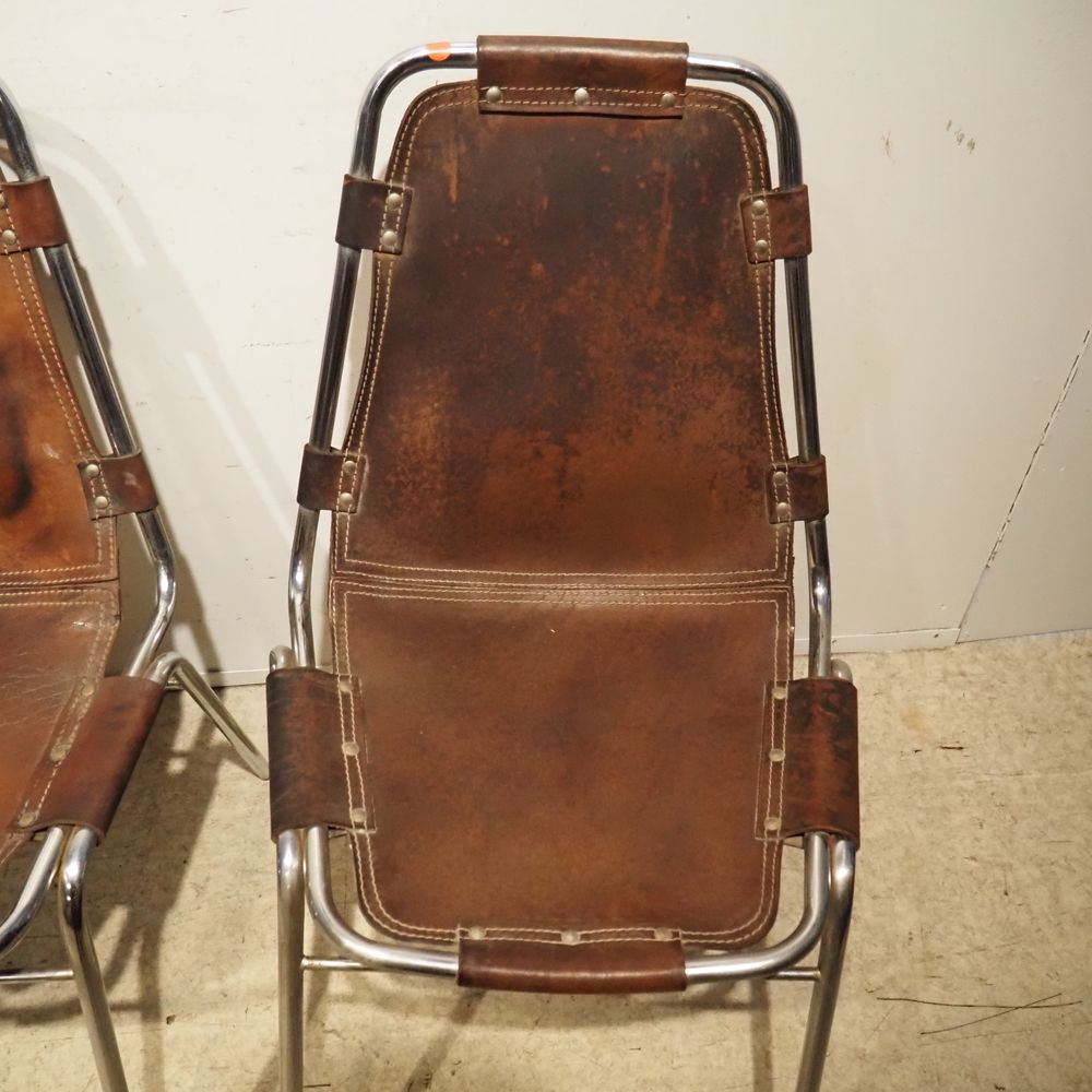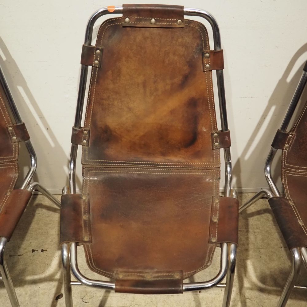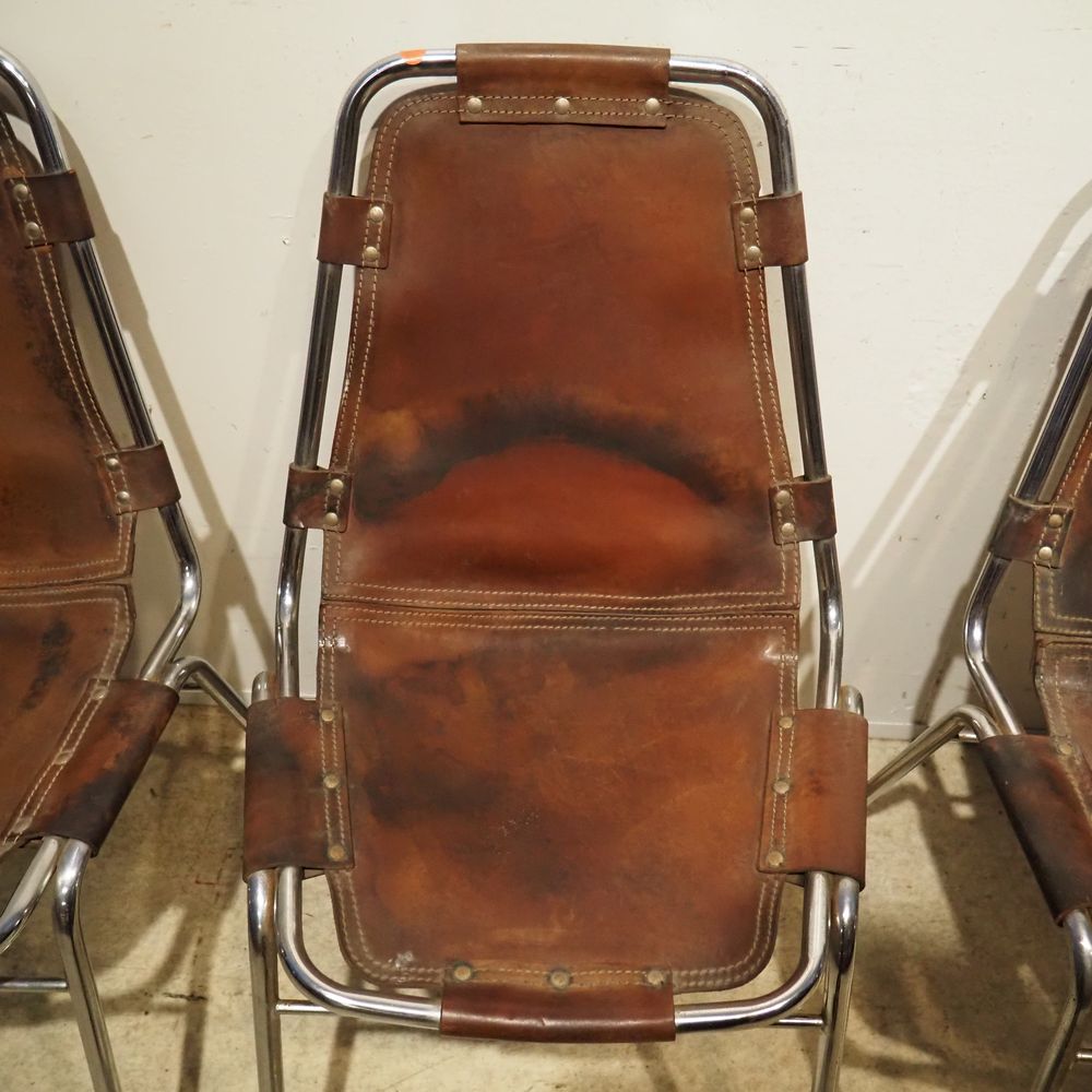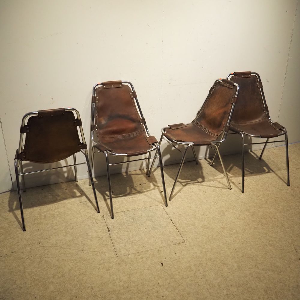 Charlotte Perriand (1903-1999) – Dal Vera pour Les Arcs : Suite de 4 chaises vers 1960, assise et dossier gainés de cuir marron clouté et serti dans une structure tubulaire en acier chromé, piétement quadripode, cuir avec auréoles et structure avec oxydation