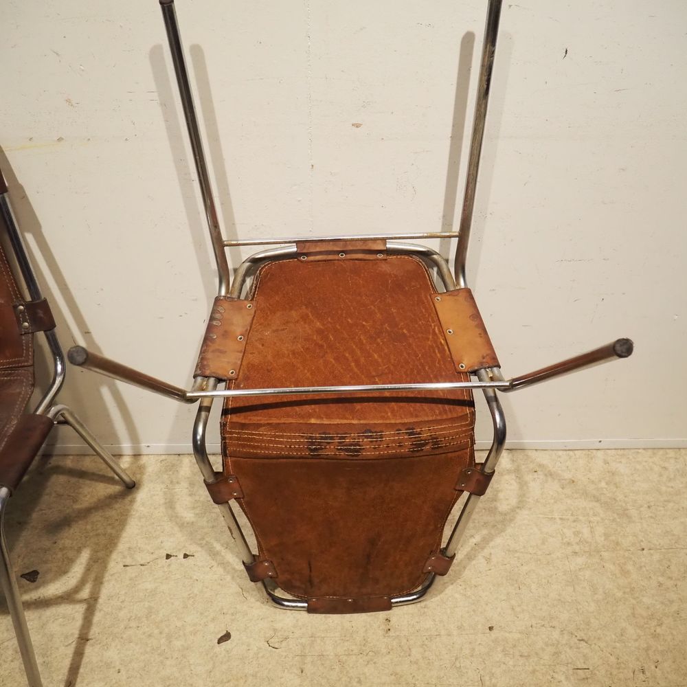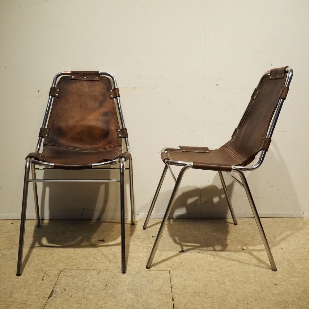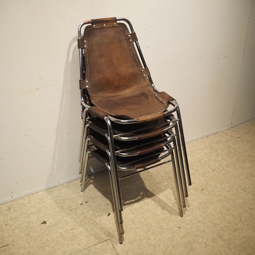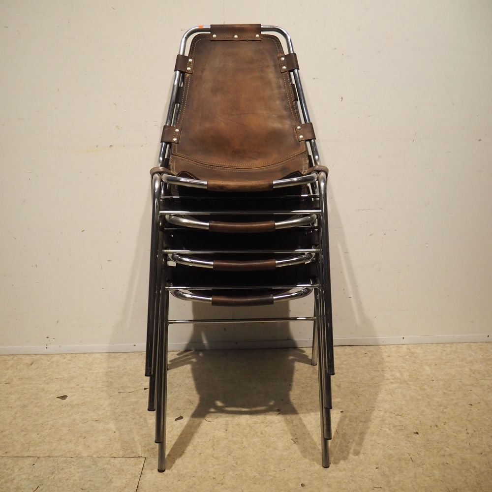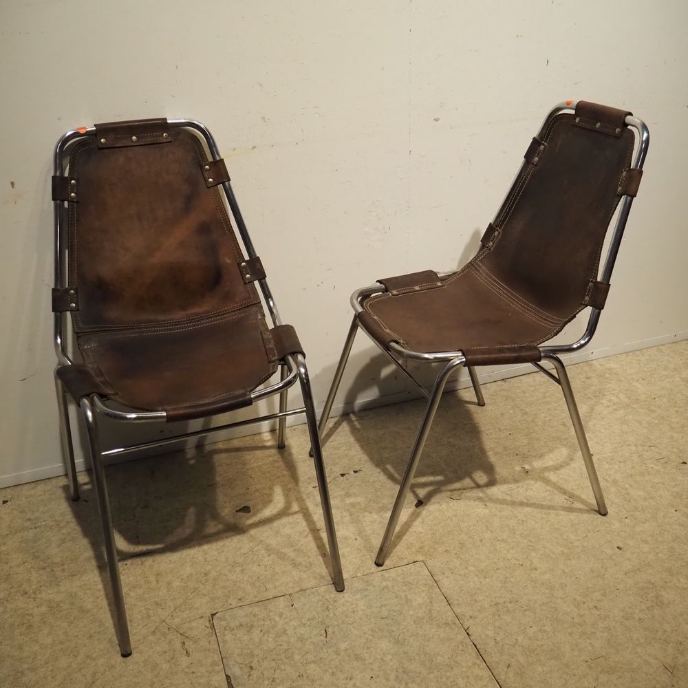 Charlotte Perriand (1903-1999) – Dal Vera pour Les Arcs : Suite de 4 chaises vers 1960, assise et dossier gainés de cuir marron clouté et serti dans une structure tubulaire en acier chromé, piétement quadripode, cuir avec auréoles et structure avec oxydation