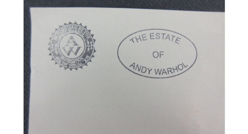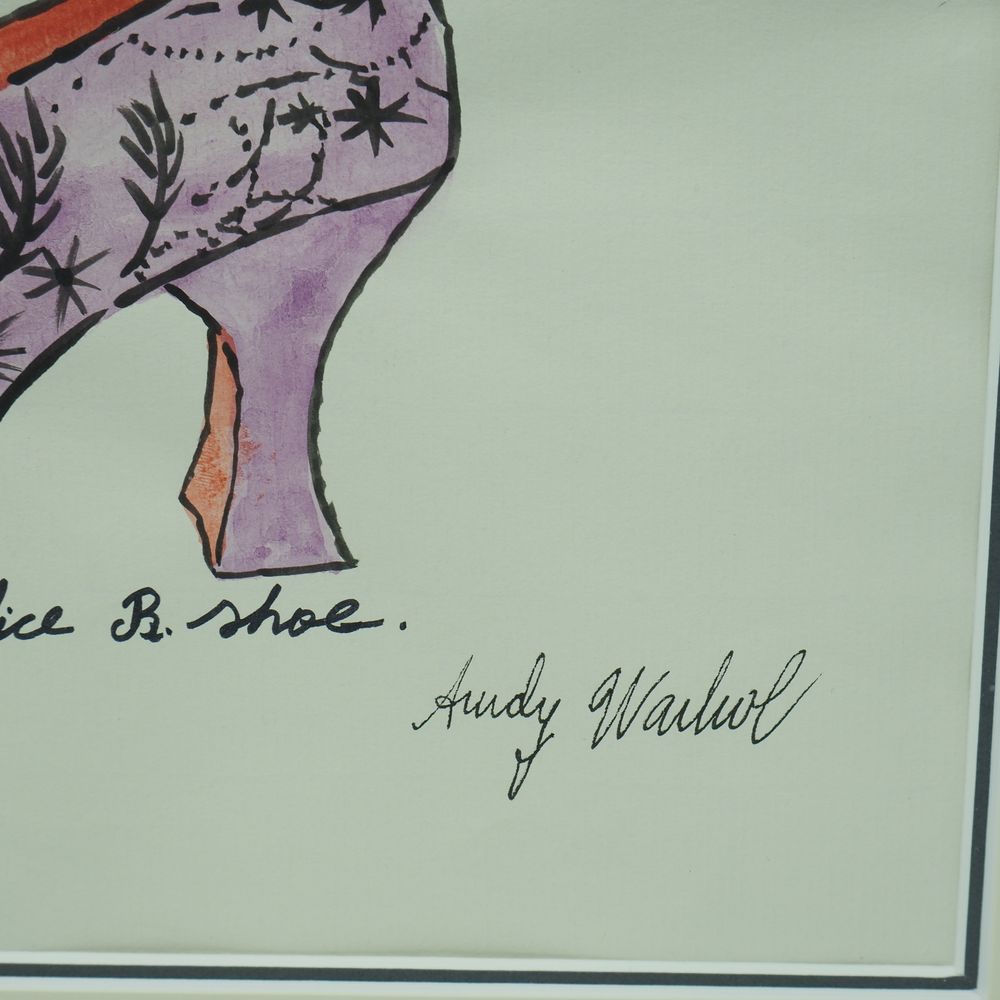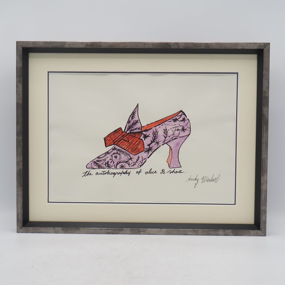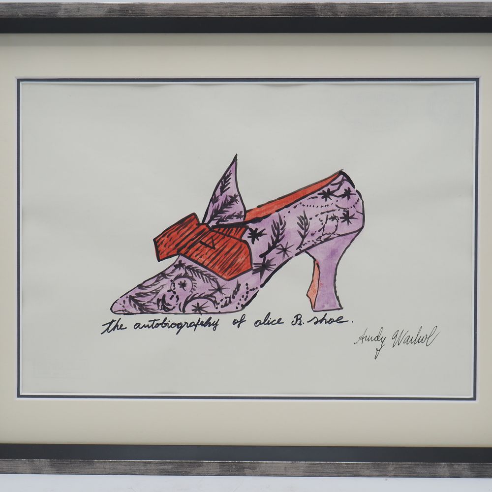 Warhol Andy 1928 / 1987 : Aquarelle, « The autobiography of Alice B.Shoe », ( Droits de suites + 4% ) signée à l’encre à la main en bas à droite, 3 cachets au verso, encadrée sous verre, dim à vue: 20 x 28,8 cm
