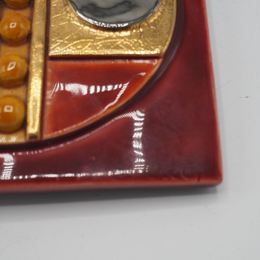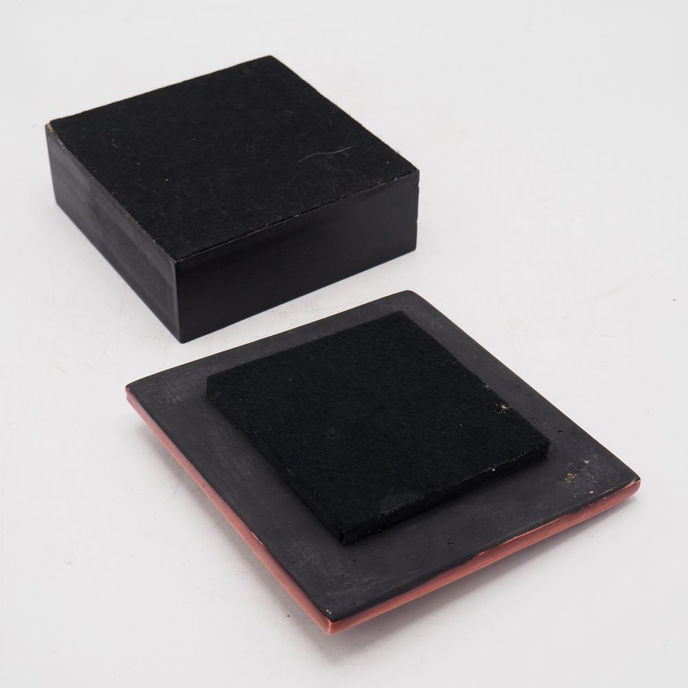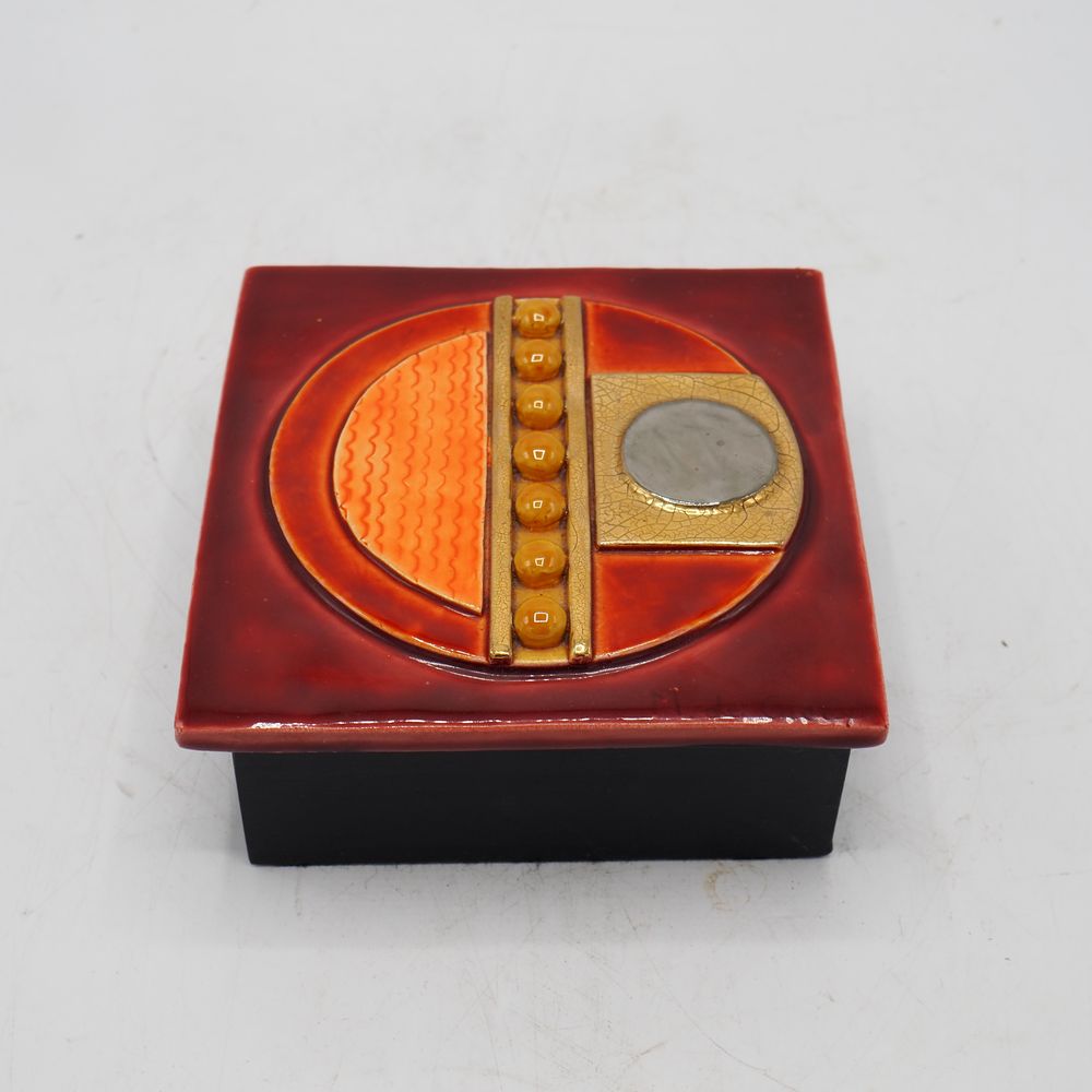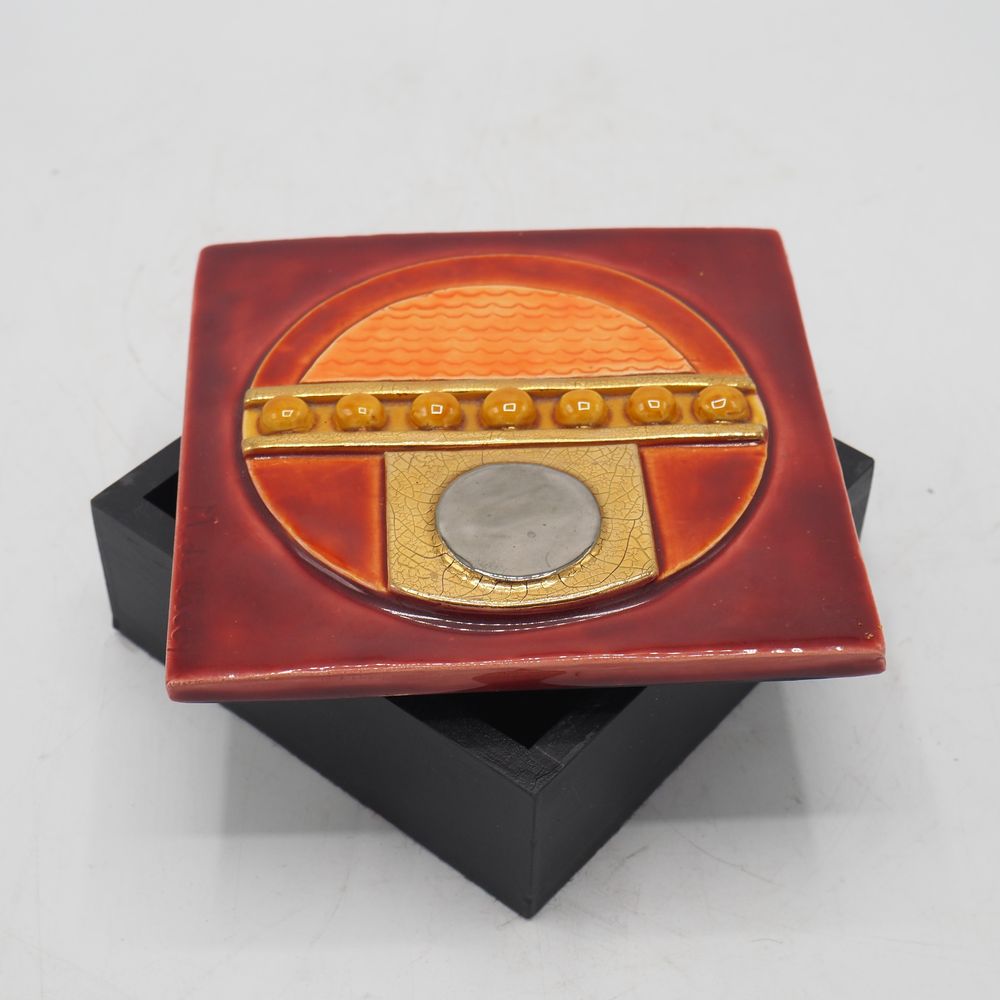 Marion de Crécy 1954 ( fille et héritière de Mithé Espelt ) : Boite en céramique émaillée et dorée, bois laqué noir, décor géométrique, signée, H: 6,5, L: 15, P: 15 cm