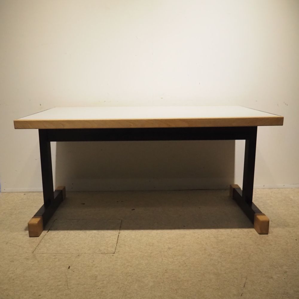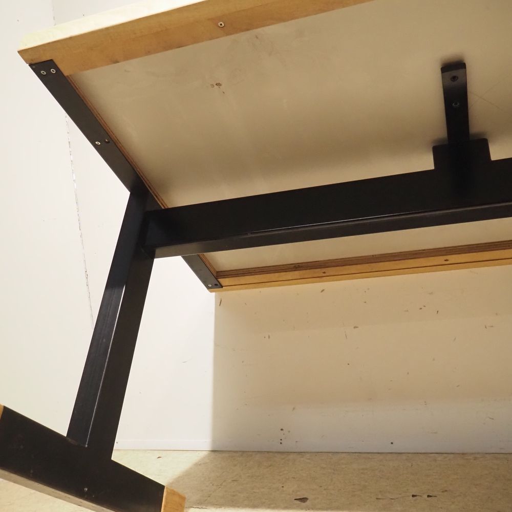 Christophe Gevers (1928-2007) : Table de réfectoire, modèle CG66,vers 1970, plateau en bois stratifié gris clair à bordure en chêne enchassé dans une structure en métal laqué noir avec sabots de chêne, très bel état d’origine, H: 70, L: 140, P: 86 cm