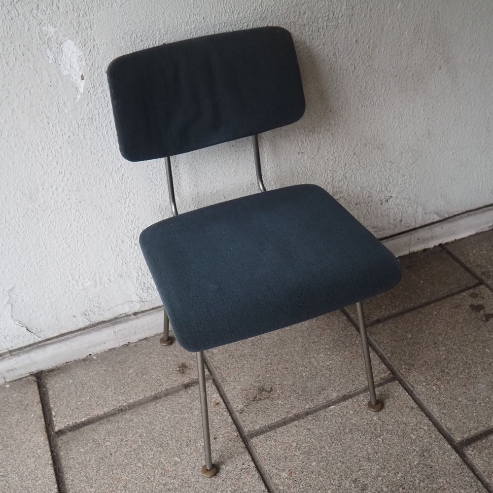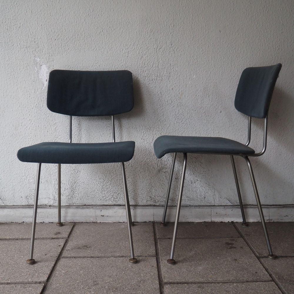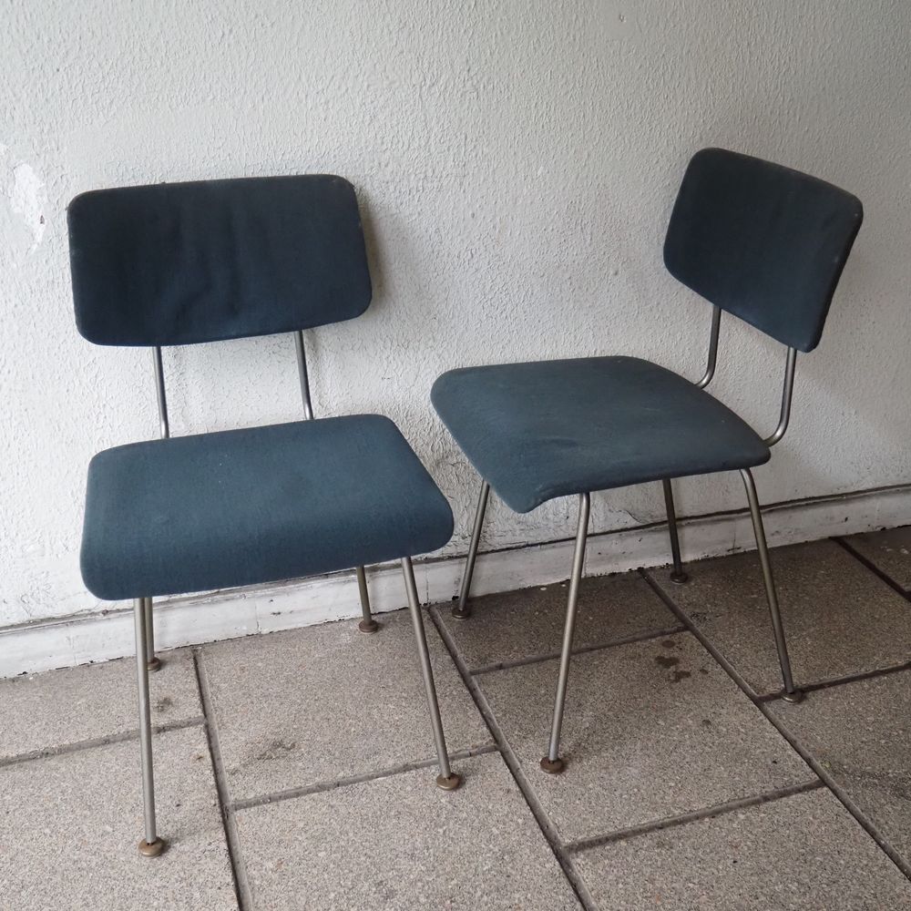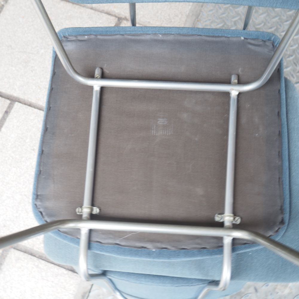 Suite de 4 chaises vers 1950, structure en fils d’acier cintré nickelé, piétement quadripode avec sabots, assise et dossier en contre plaqué cintré, garnis de tissu bleu, très bon état d’origine