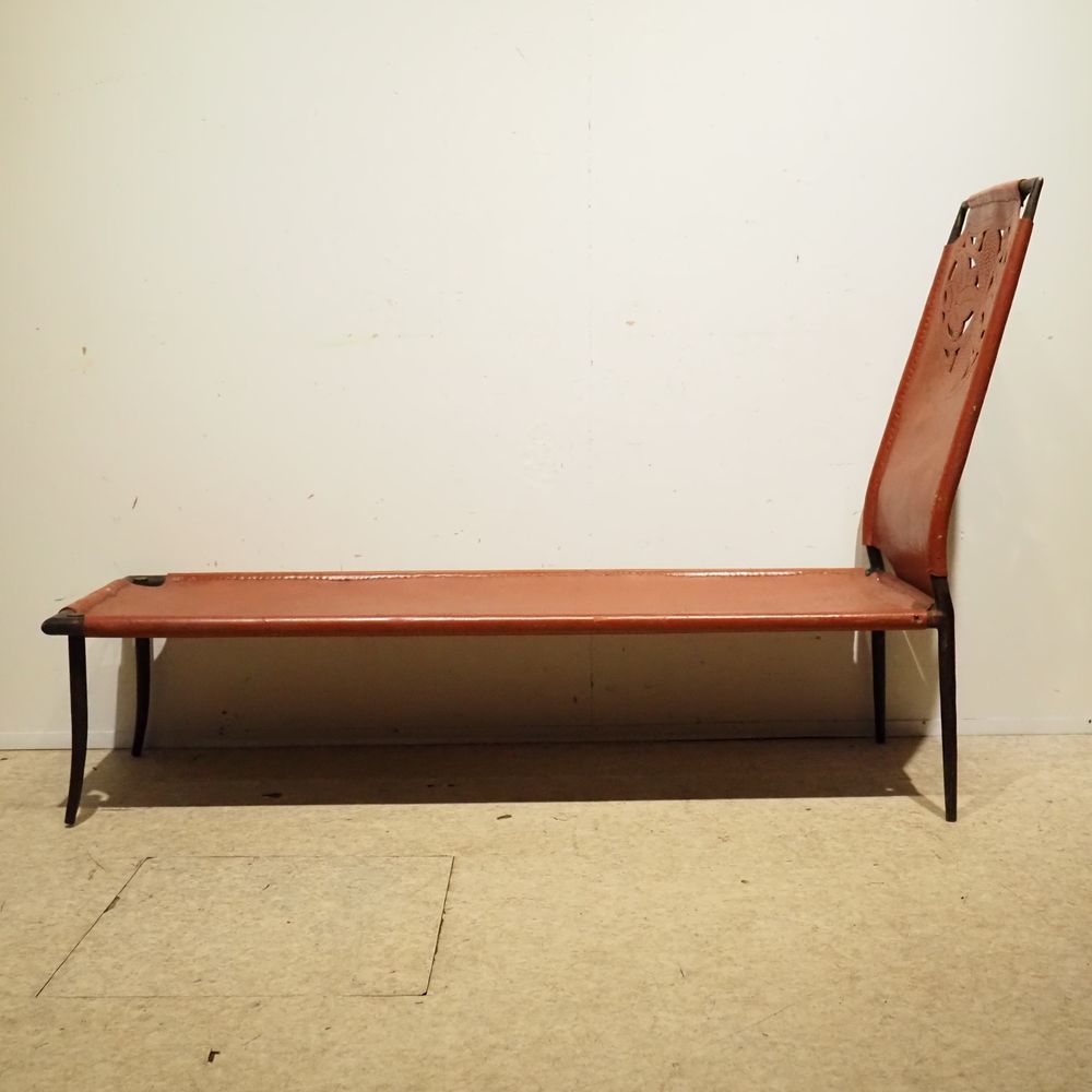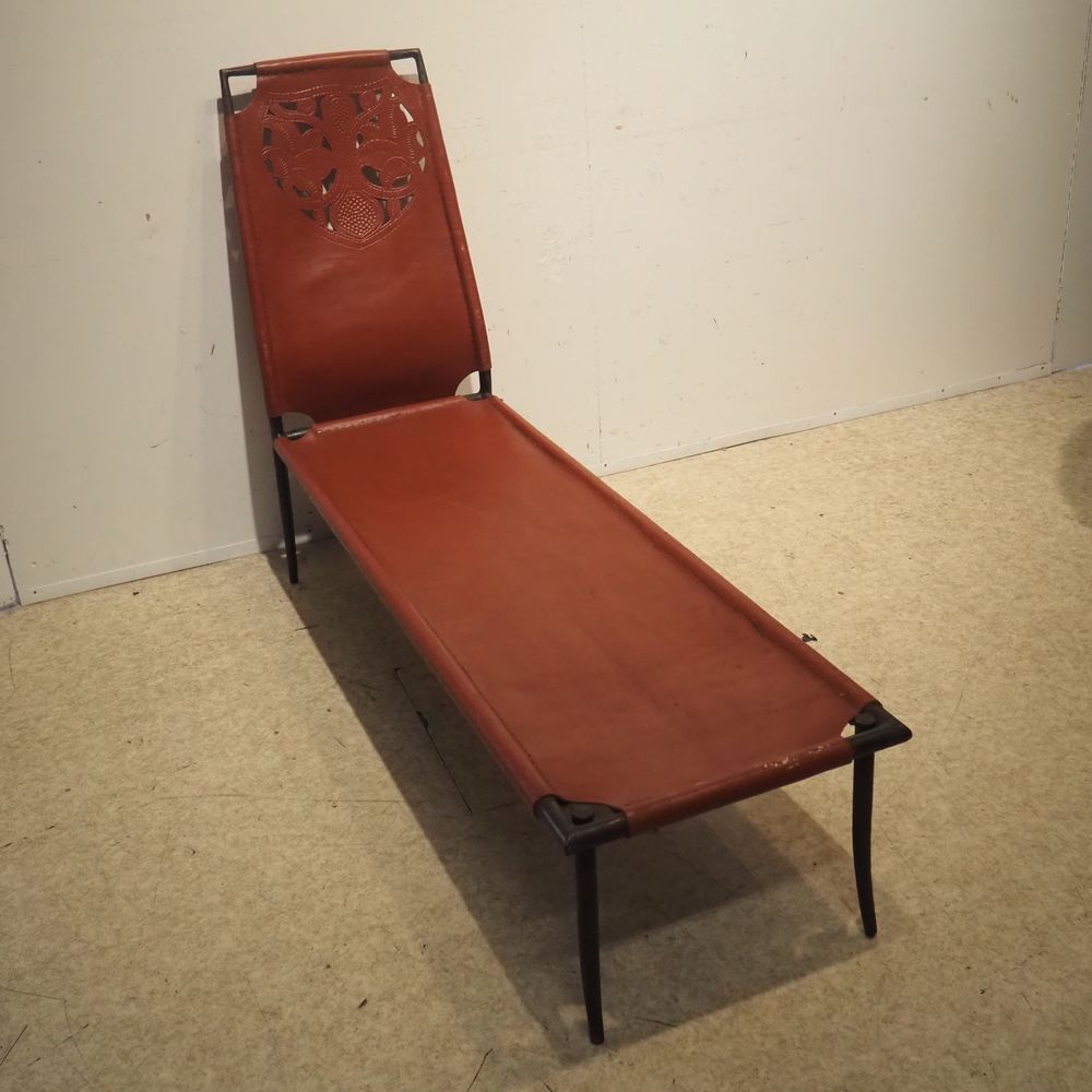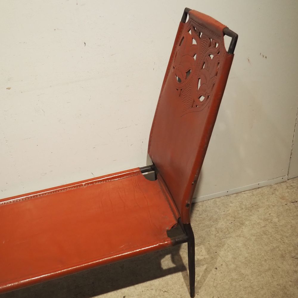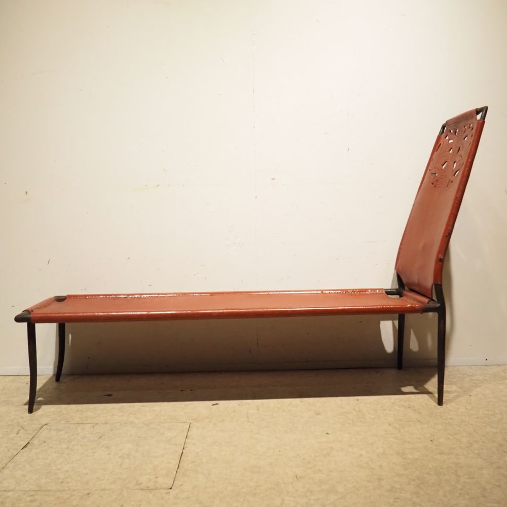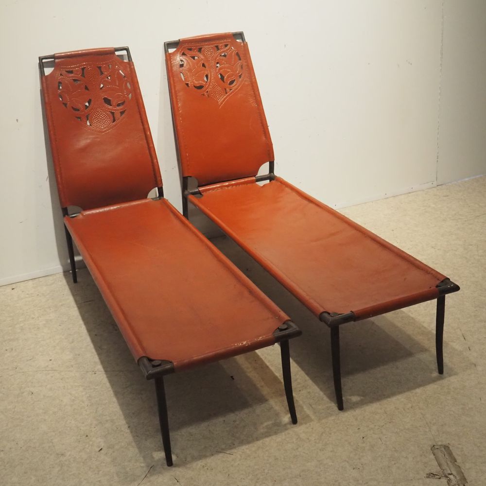 Travail des Indes : Paire de transats vers 1980, structure en fer forgé brut, soudé à la main, assise et dossier en cuir ajouré couleur lie de vin, H: 96/32, L: 160, P: 45 cm