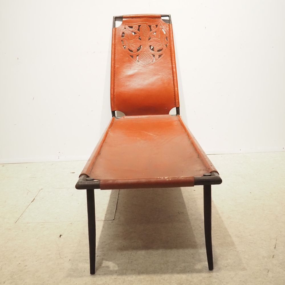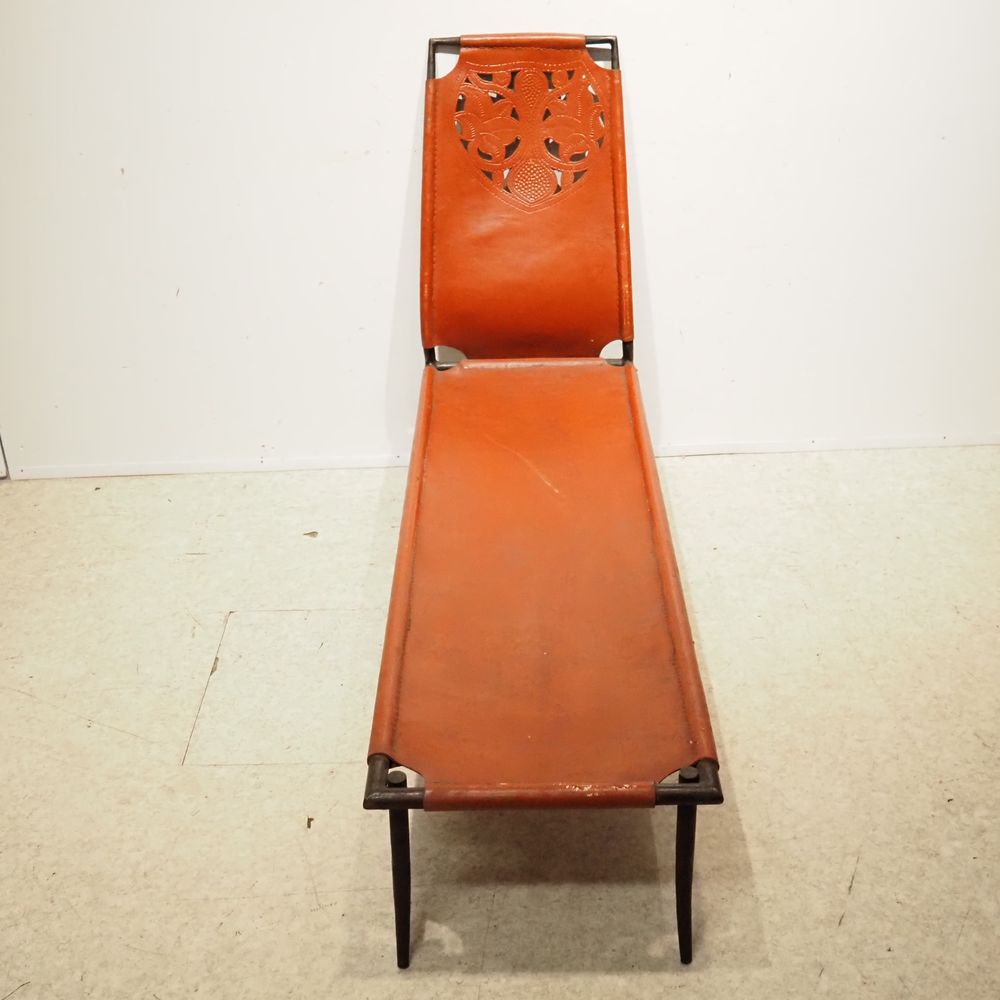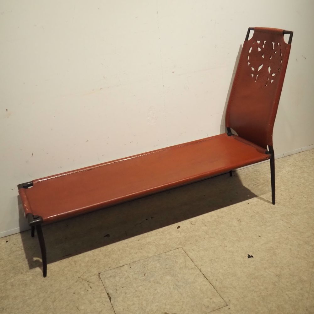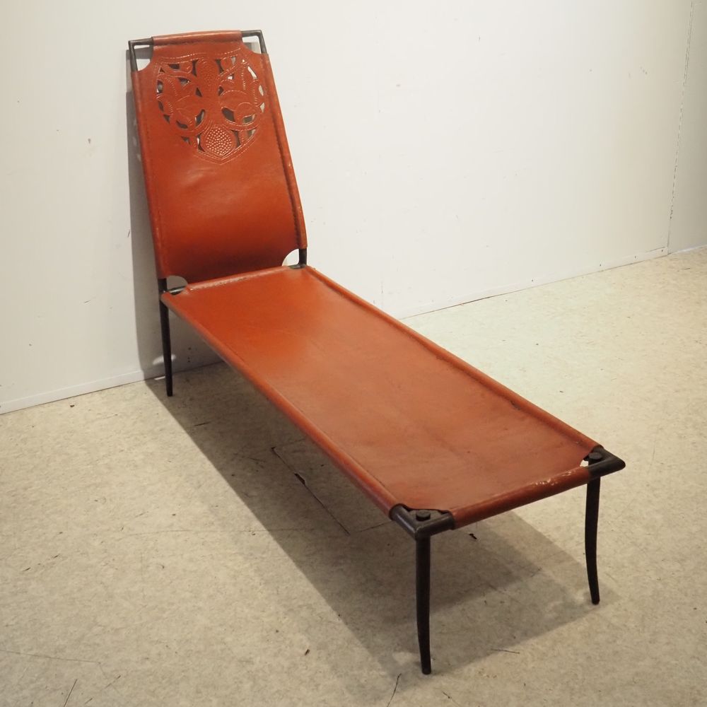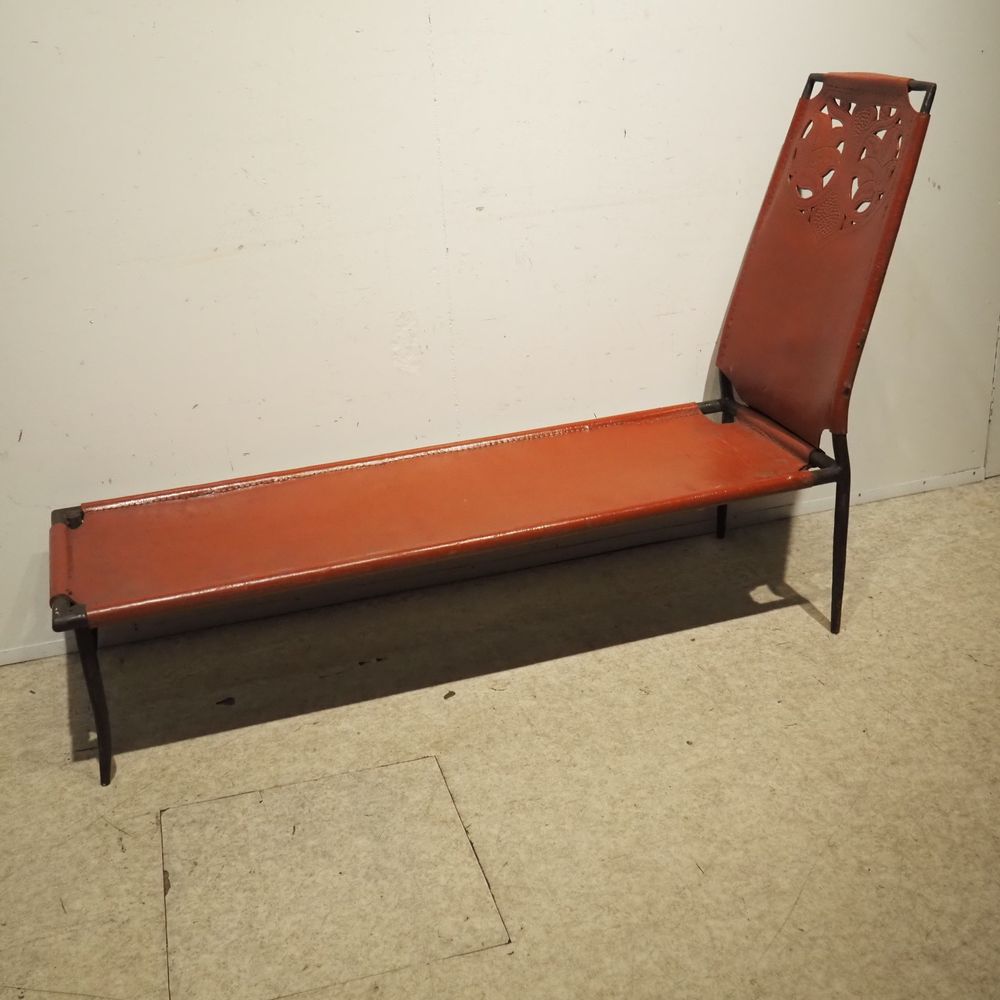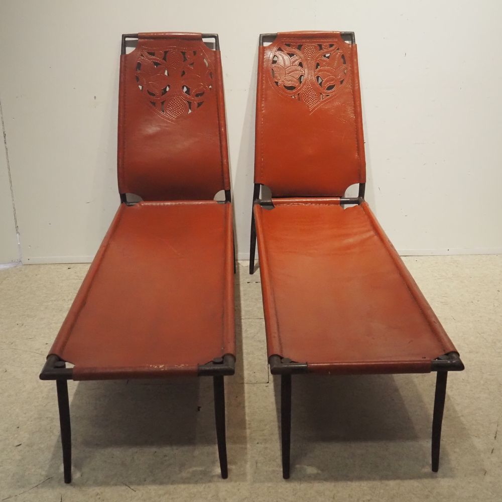 Travail des Indes : Paire de transats vers 1980, structure en fer forgé brut, soudé à la main, assise et dossier en cuir ajouré couleur lie de vin, H: 96/32, L: 160, P: 45 cm