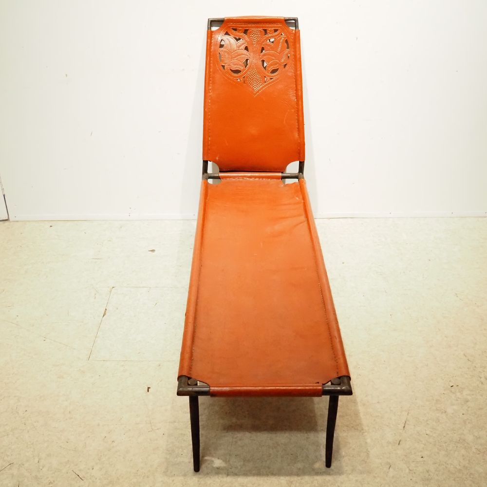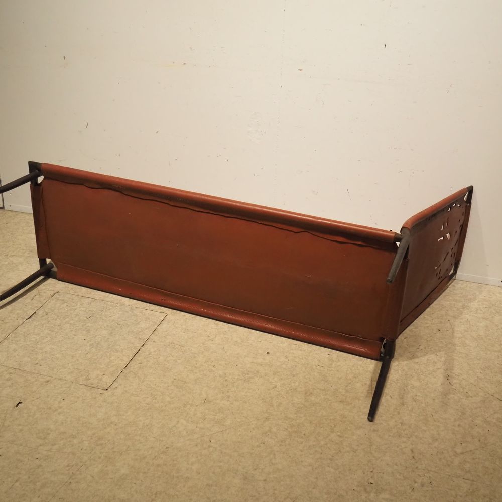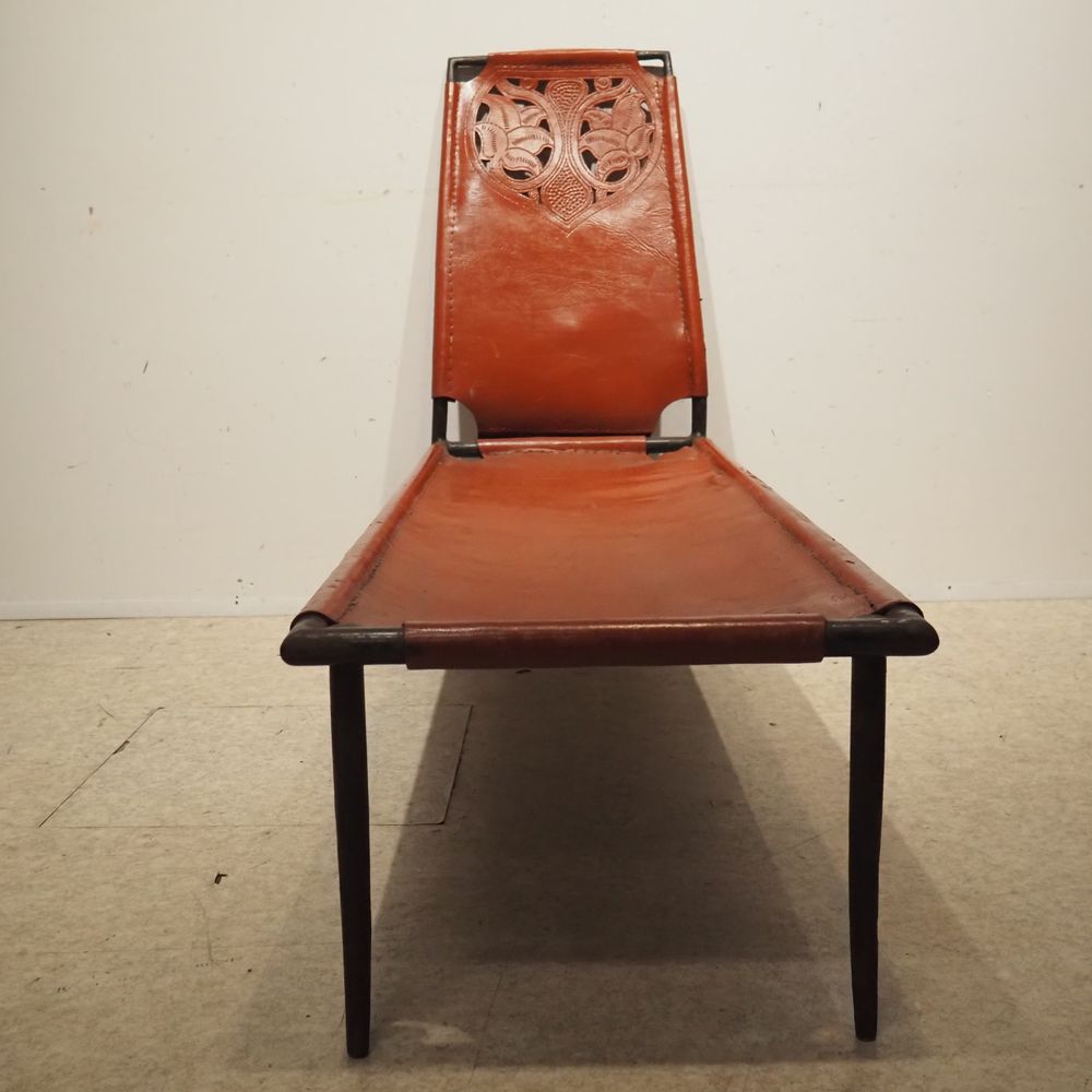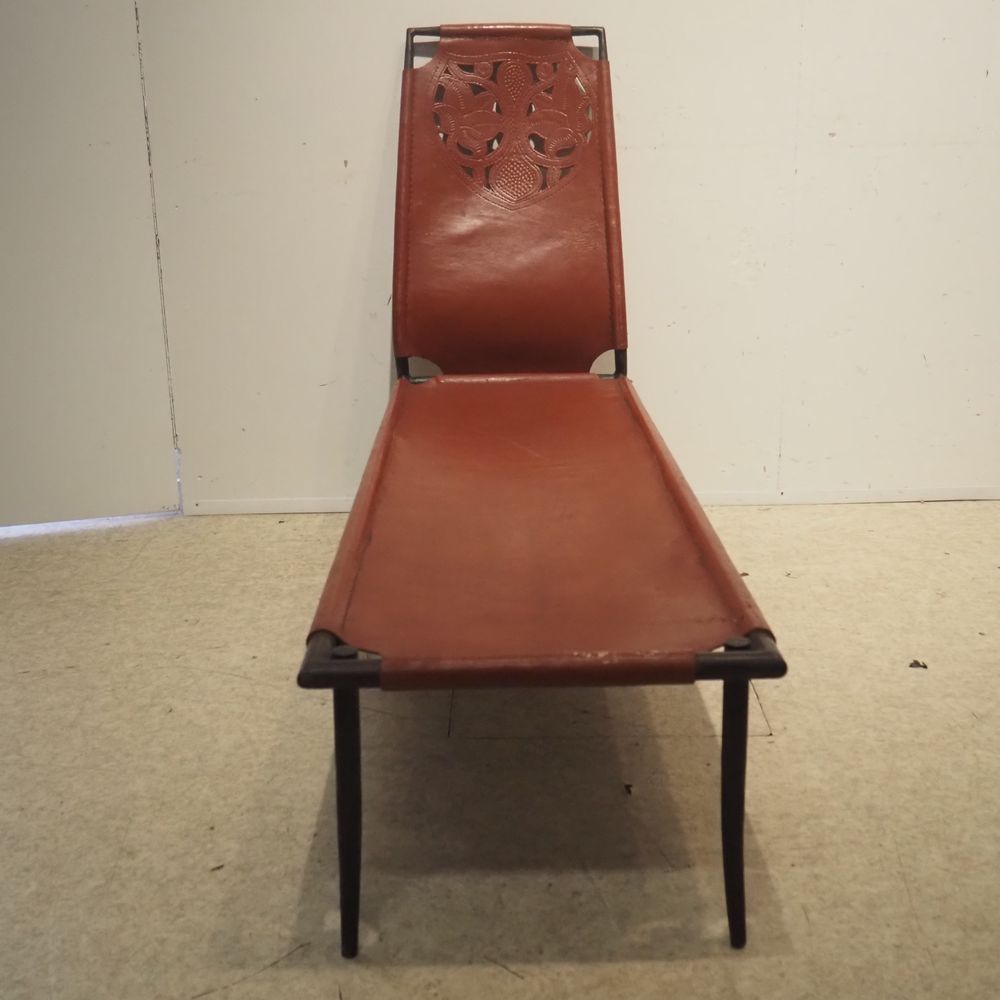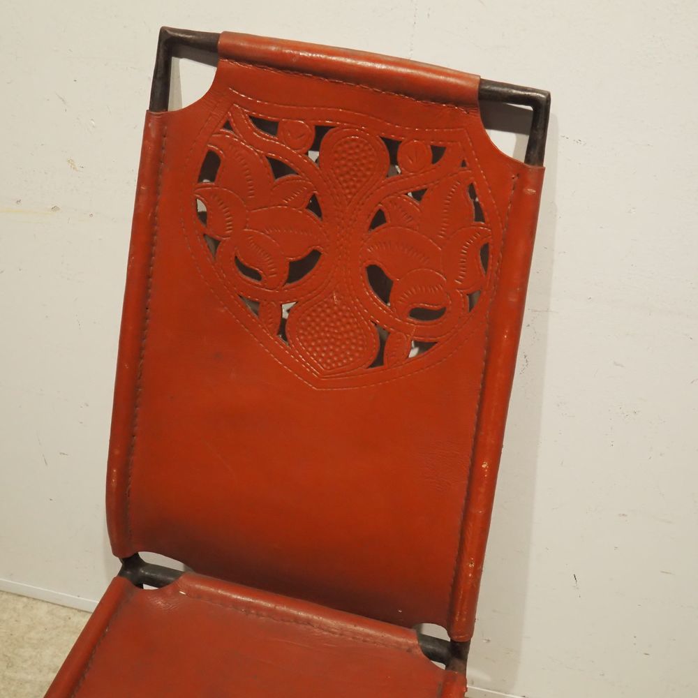 Travail des Indes : Paire de transats vers 1980, structure en fer forgé brut, soudé à la main, assise et dossier en cuir ajouré couleur lie de vin, H: 96/32, L: 160, P: 45 cm