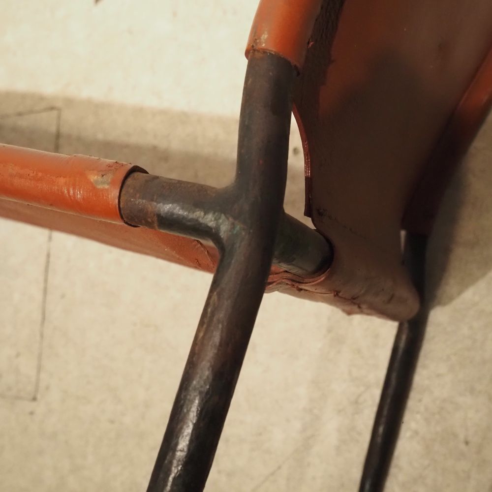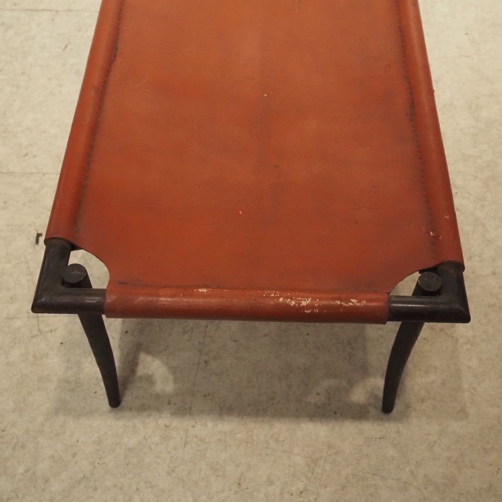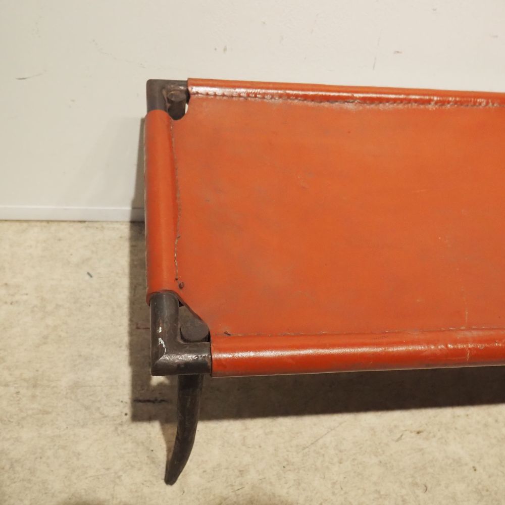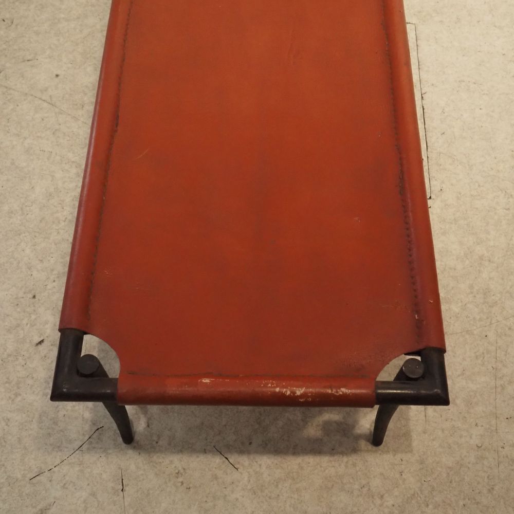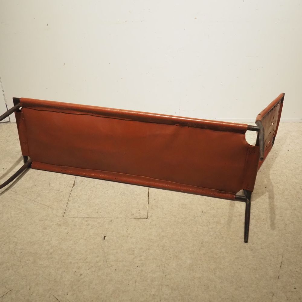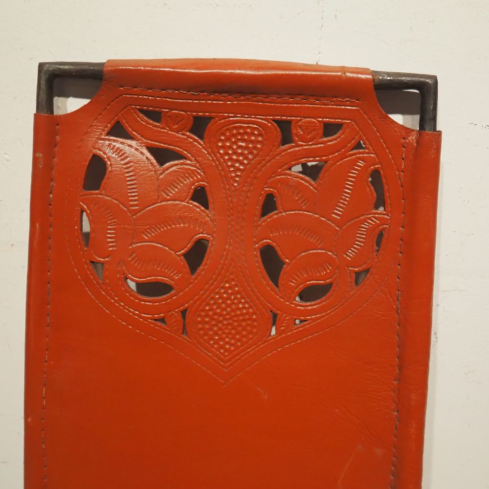 Travail des Indes : Paire de transats vers 1980, structure en fer forgé brut, soudé à la main, assise et dossier en cuir ajouré couleur lie de vin, H: 96/32, L: 160, P: 45 cm