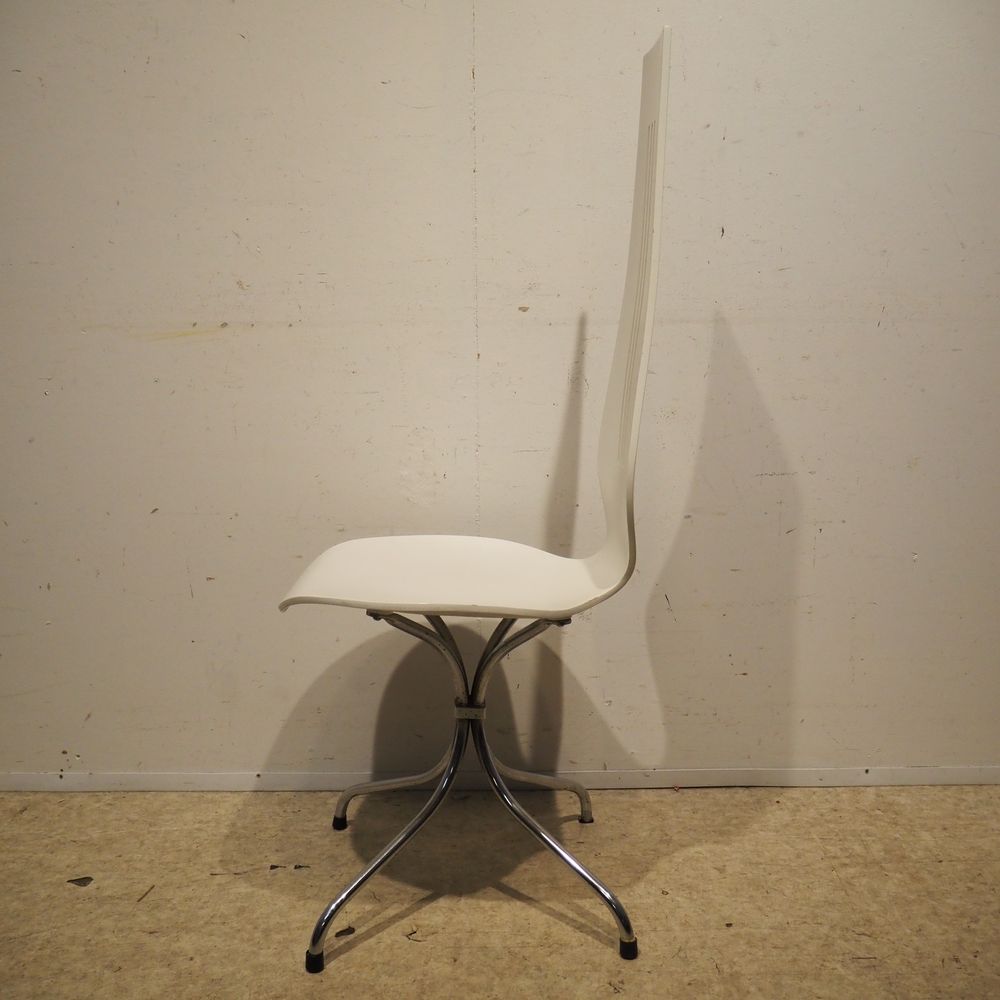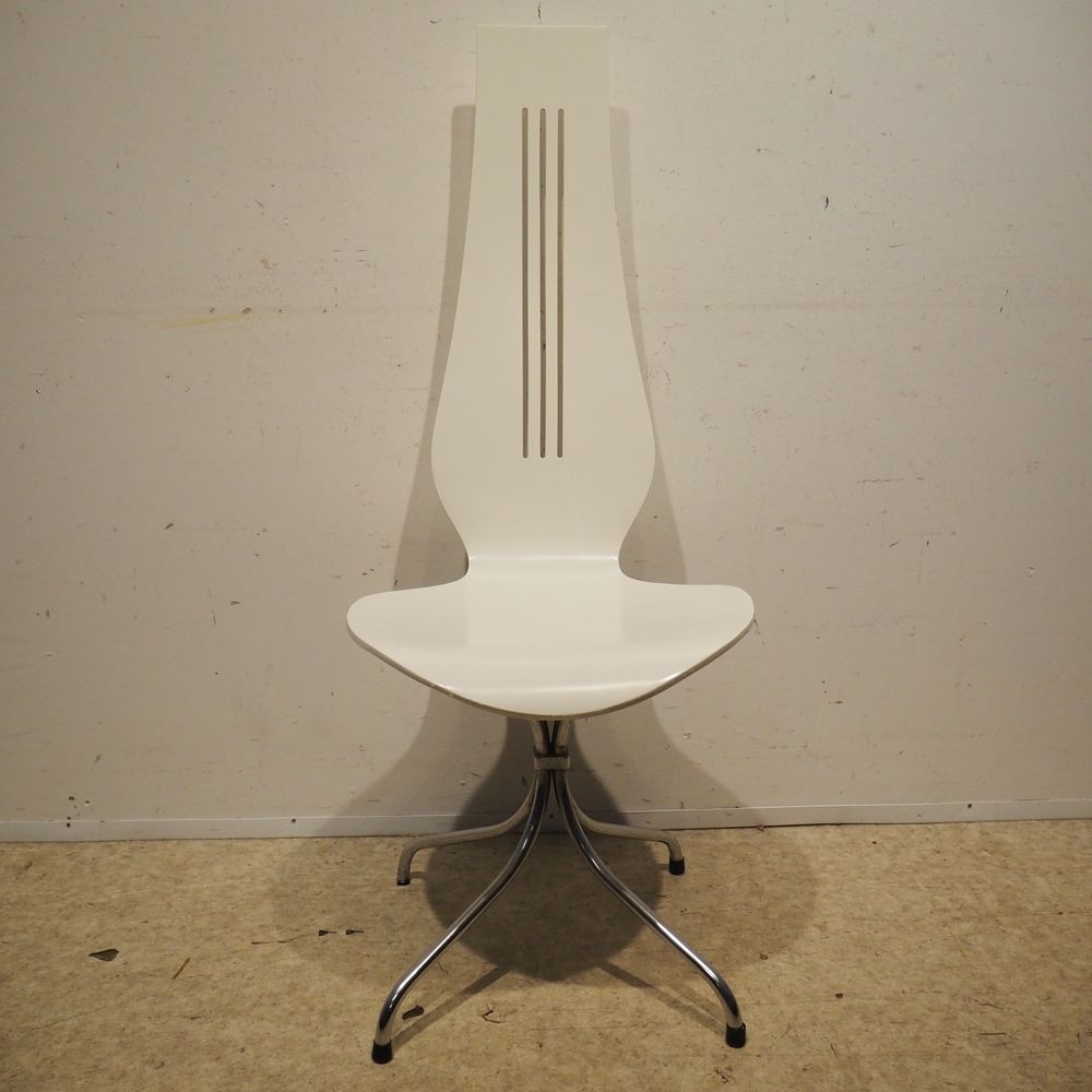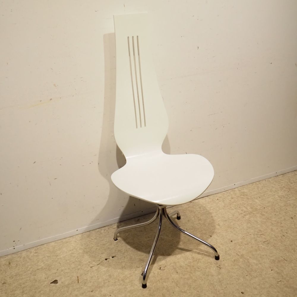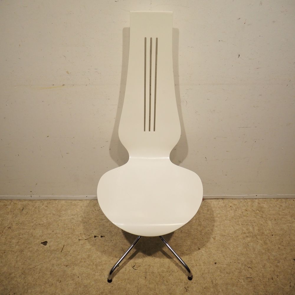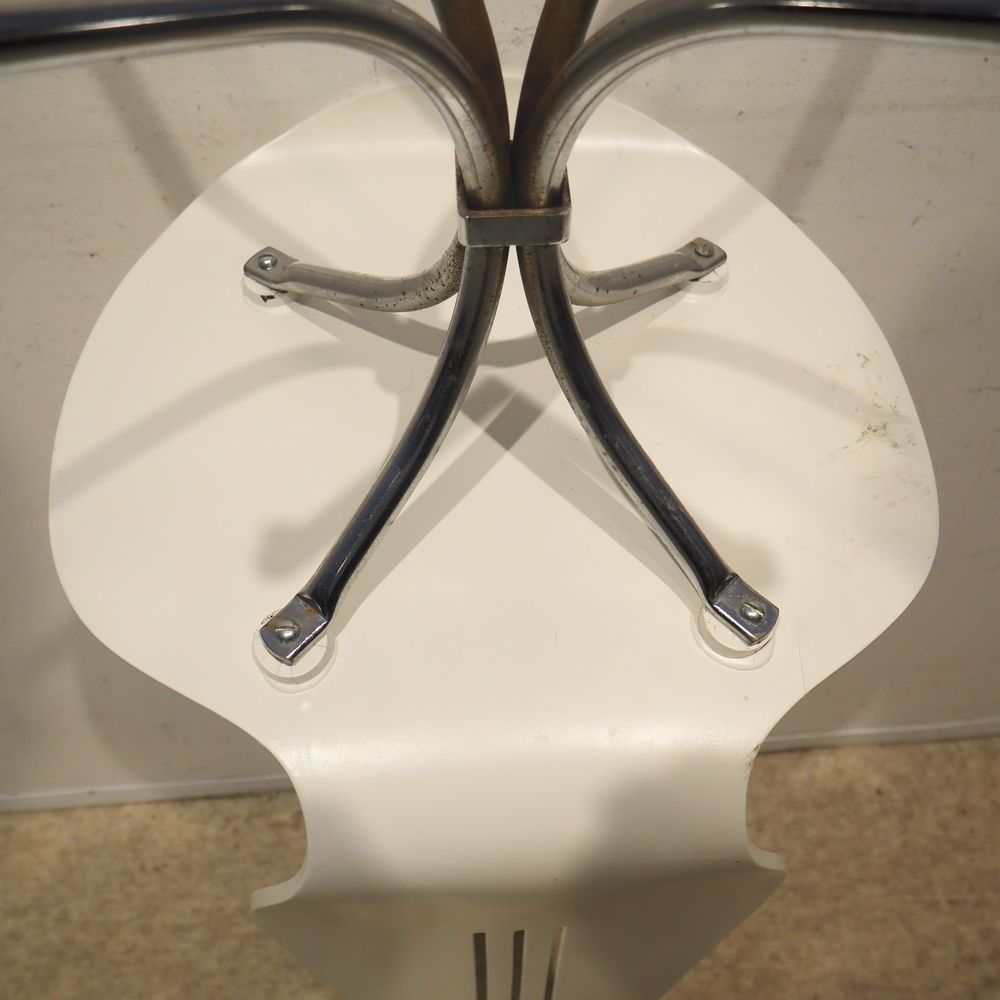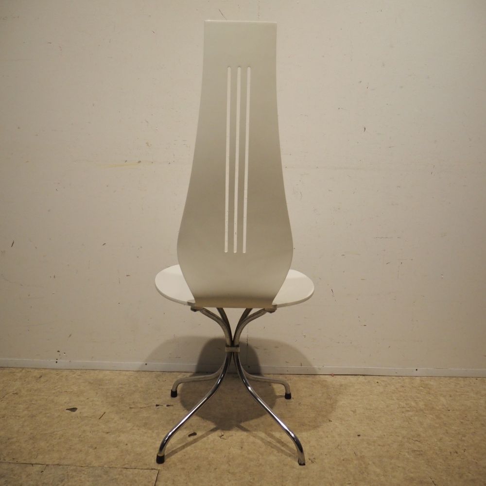 Theo Haberli (XX) : Chaise M352, modèle « Lyre », dessiné en 1968, coque en contreplaqué moulé et ajouré laqué blanc, piètement central quadritpode en tube d’acier cintré chromé