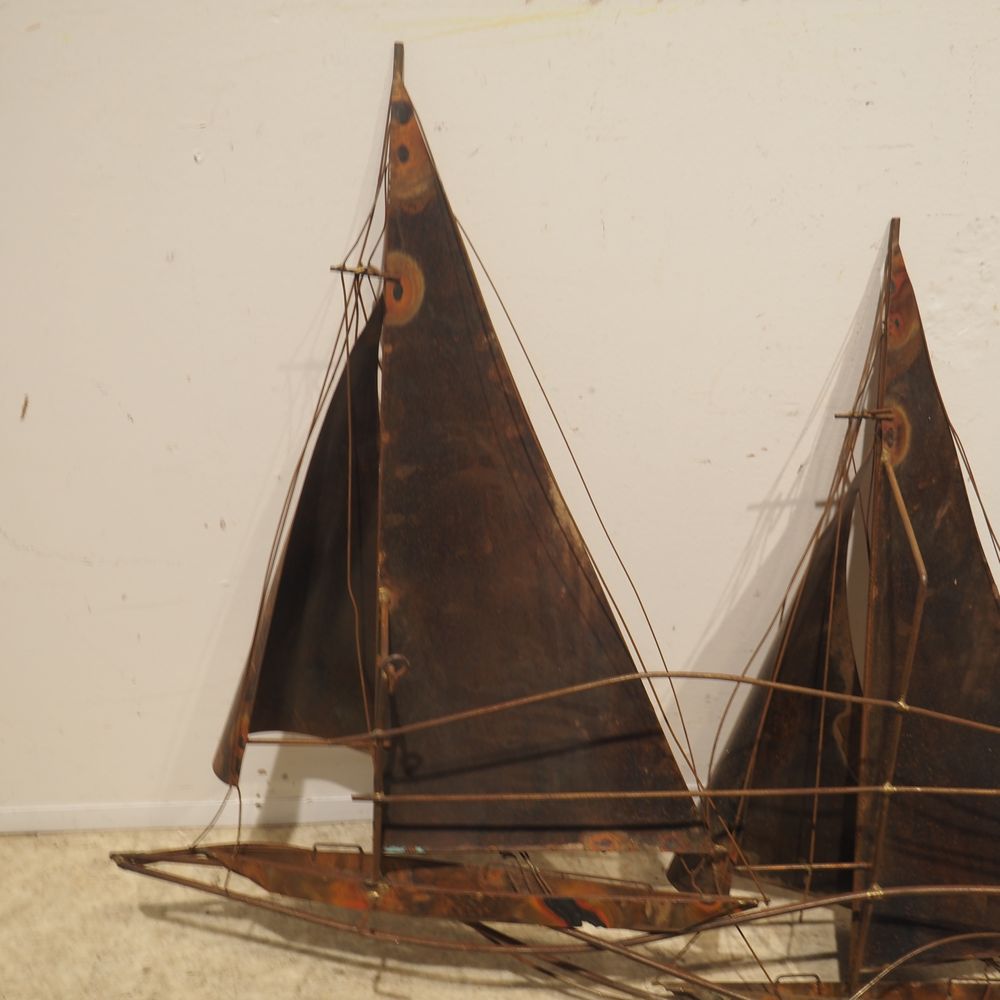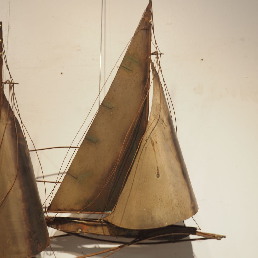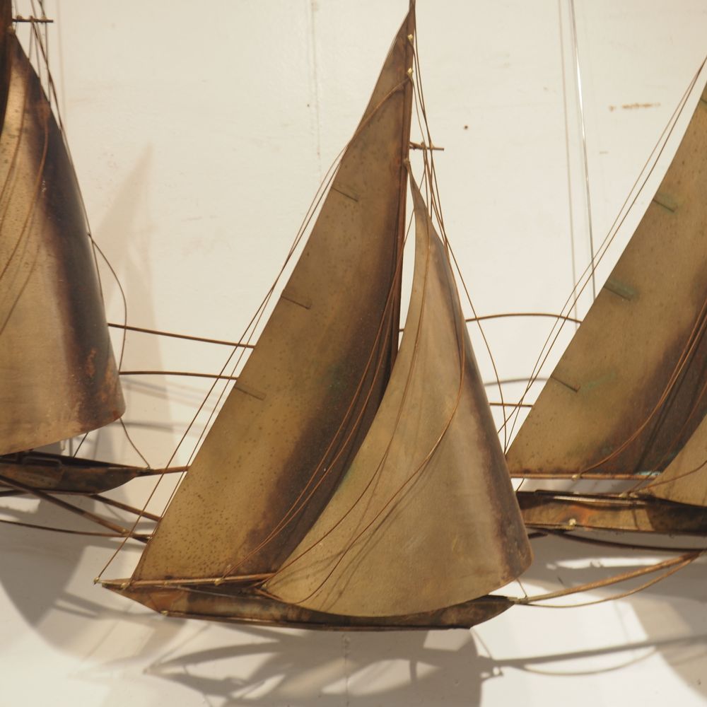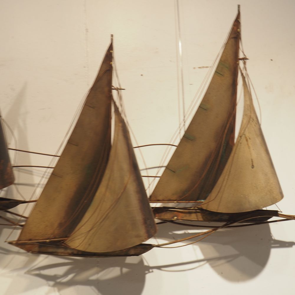 Curtis Jere : Sculpture murale, laiton figurant 3 voiliers, signée et datée 1988, (oxydation supperficielle) H: 74, L: 135, P: 25 cm