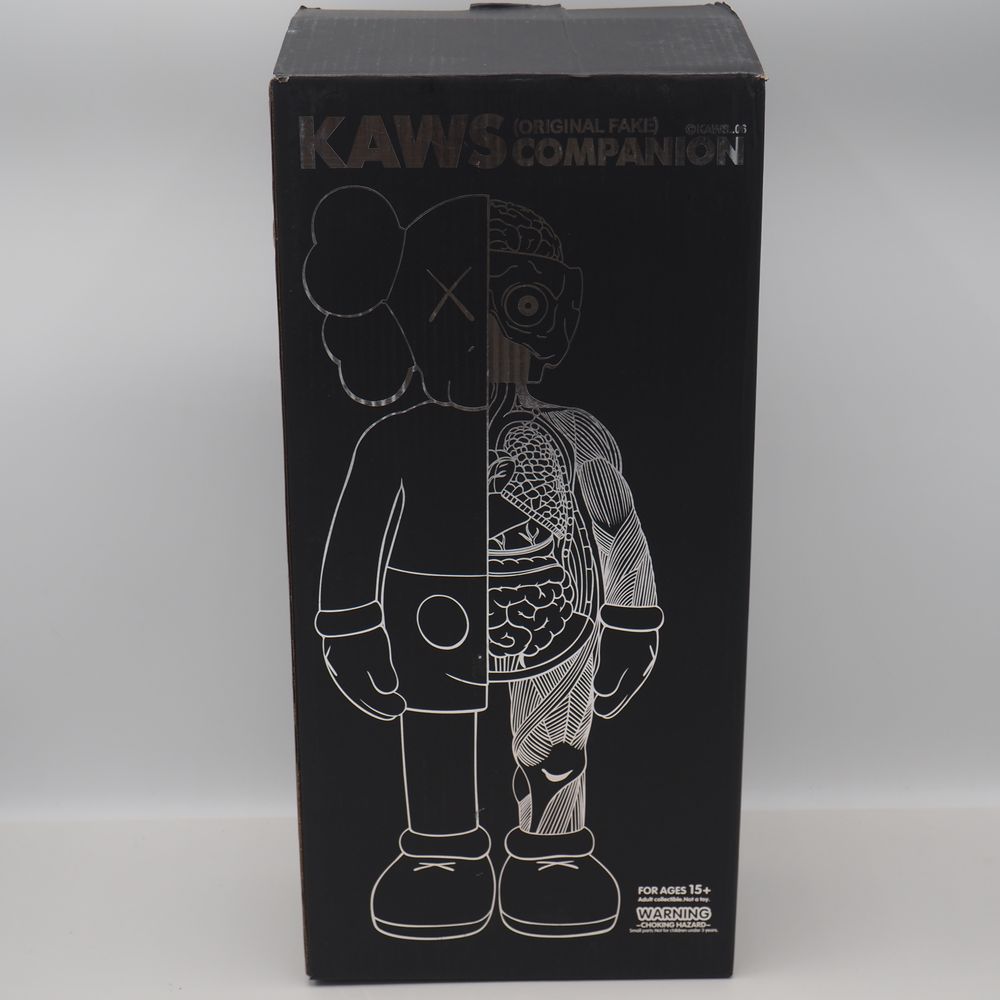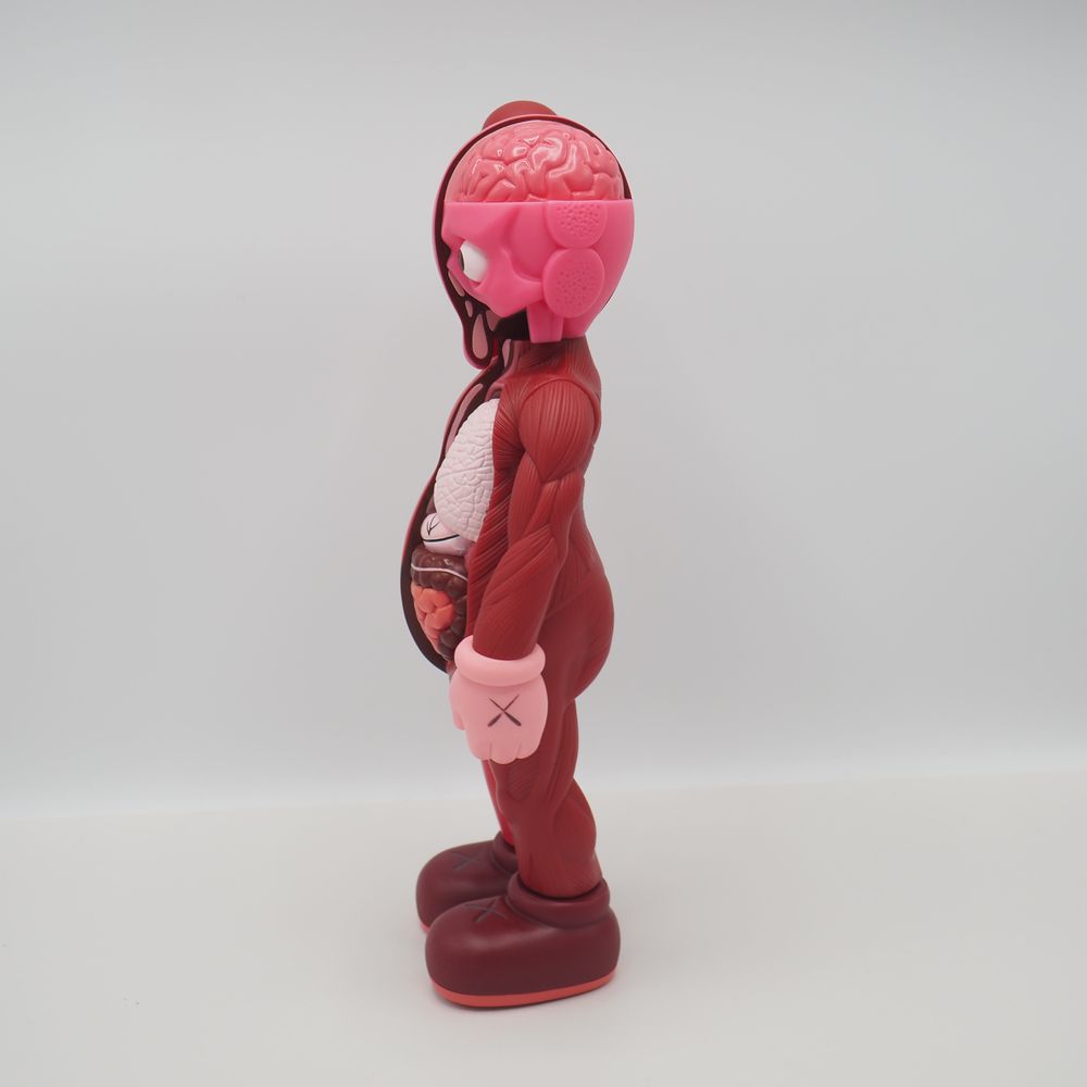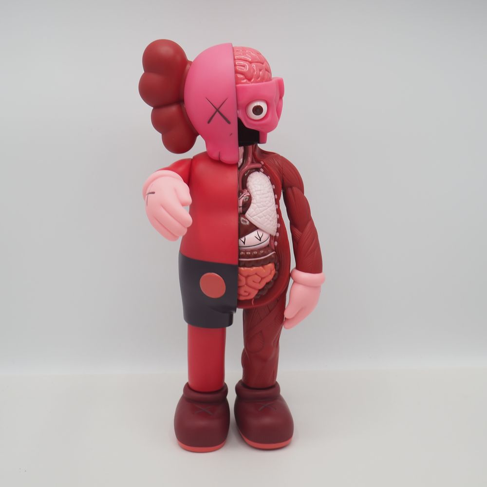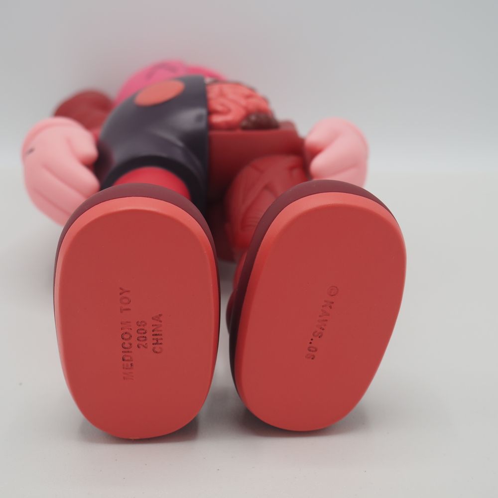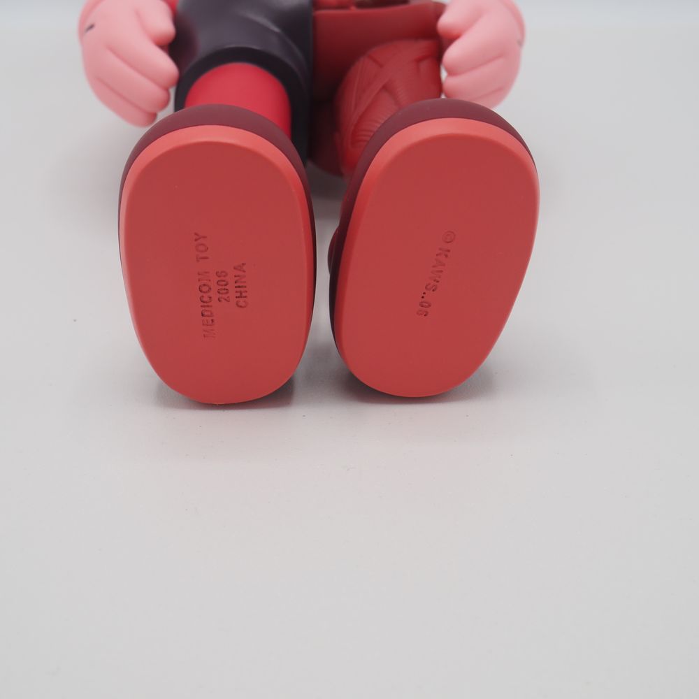 Kaws 1974 / Medicam Toy Origina Fake : Figurine échorchée, matière plastique (vinyle) polychromé ton rouge, état proche du neuf, marquée « Kaws » et datée sous le pied 16 pour 2016, Medicom toy China, état proche du neuf avec boite d’origine, H : 34 cm