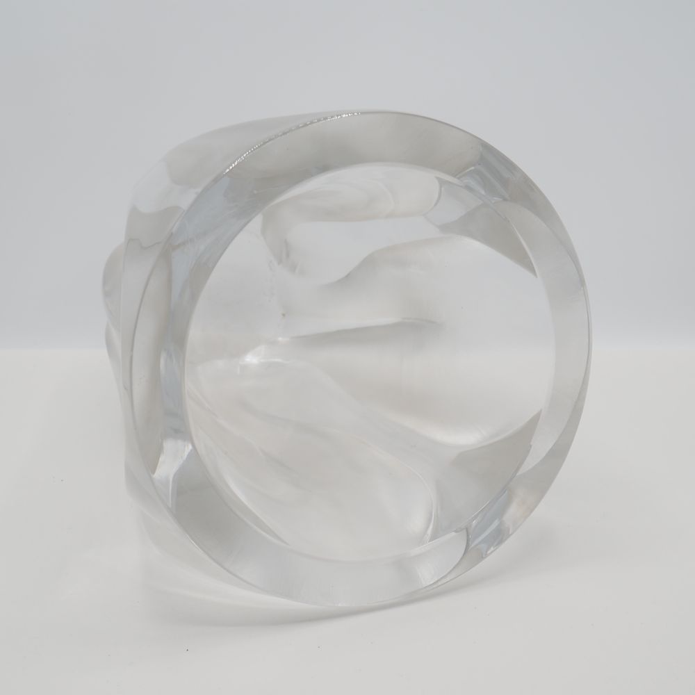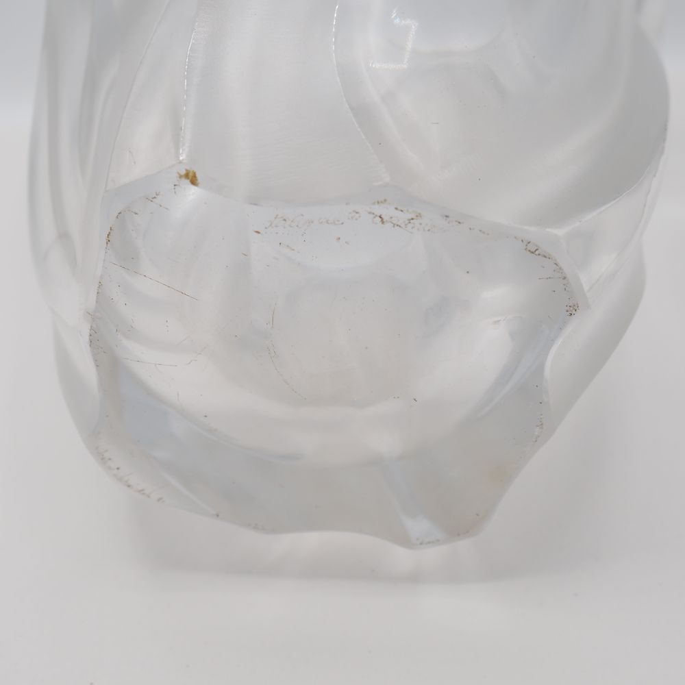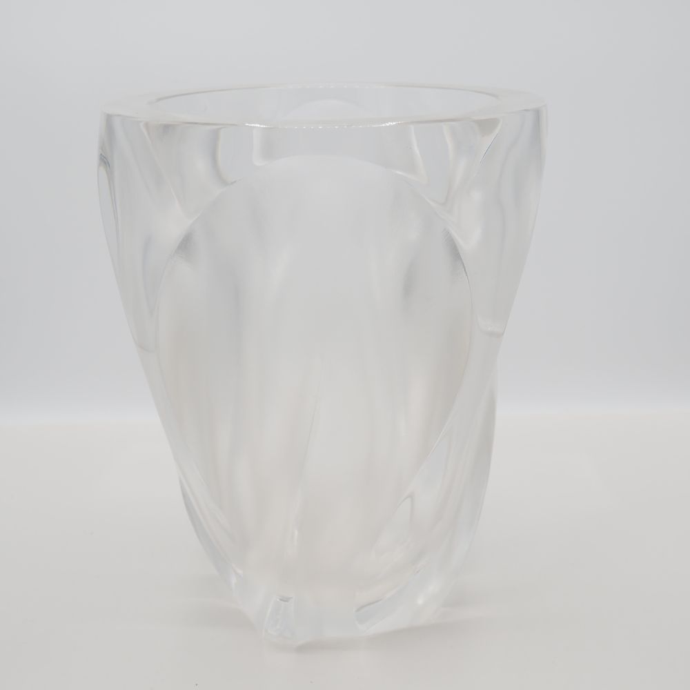 Marc Lalique 1900-1977 / Lalique France : Important vase vers 1964, modèle Ingrid, cristal taillé clair et dépoli, décor de feuilles, signé à la pointe sous la base, H: 27,6, diam: 21,5 cm