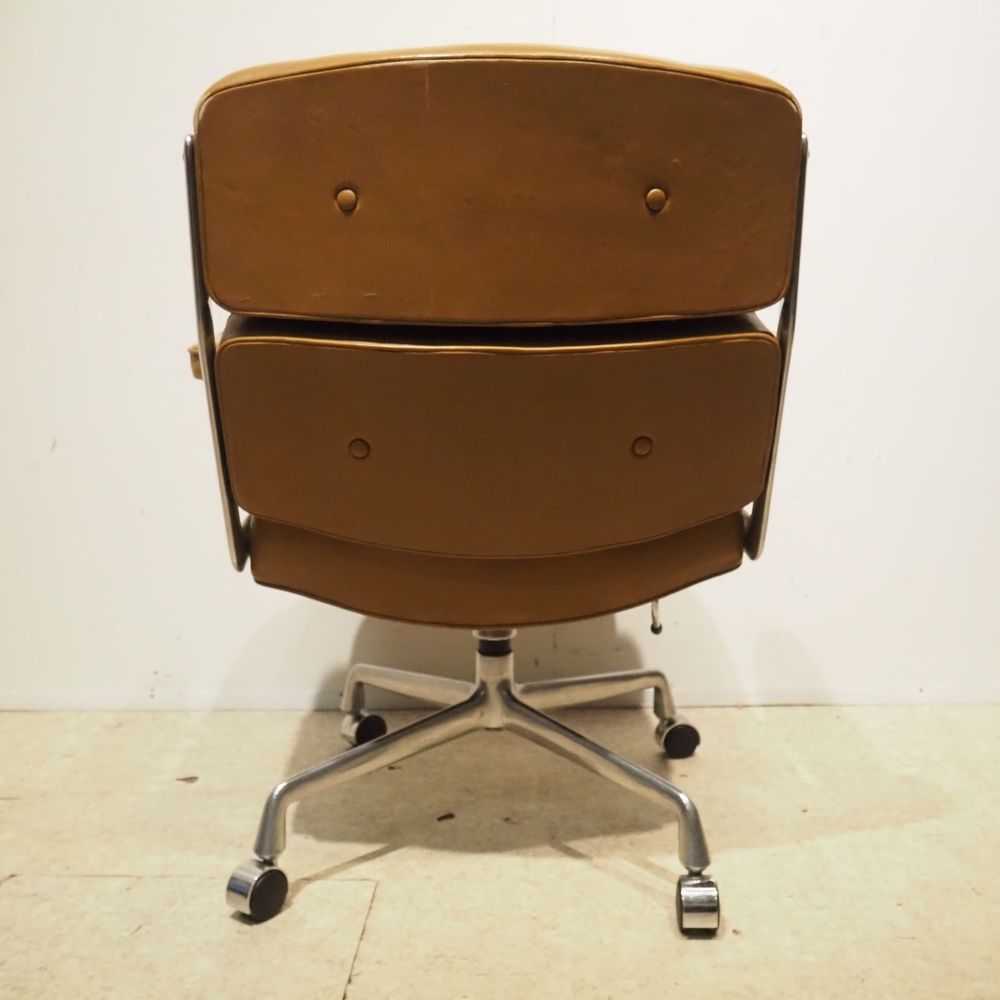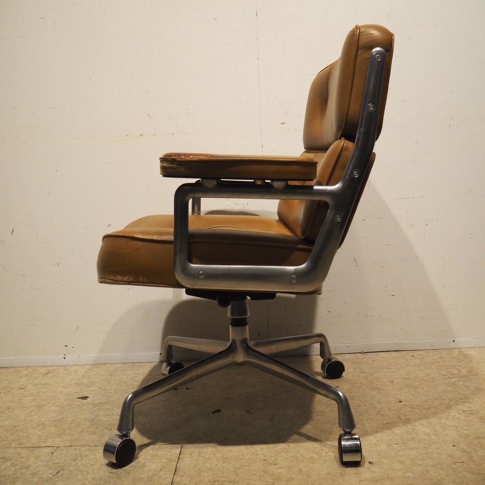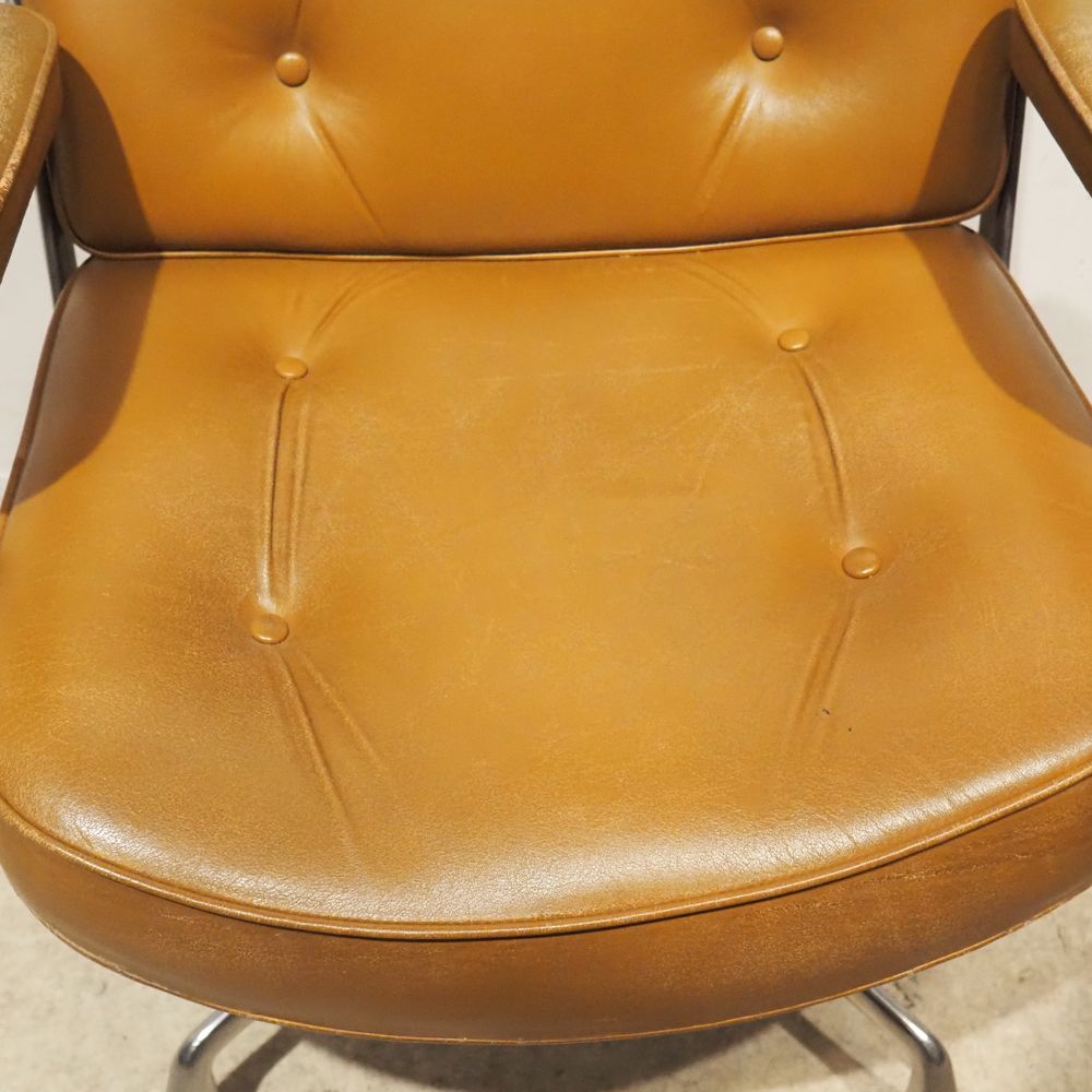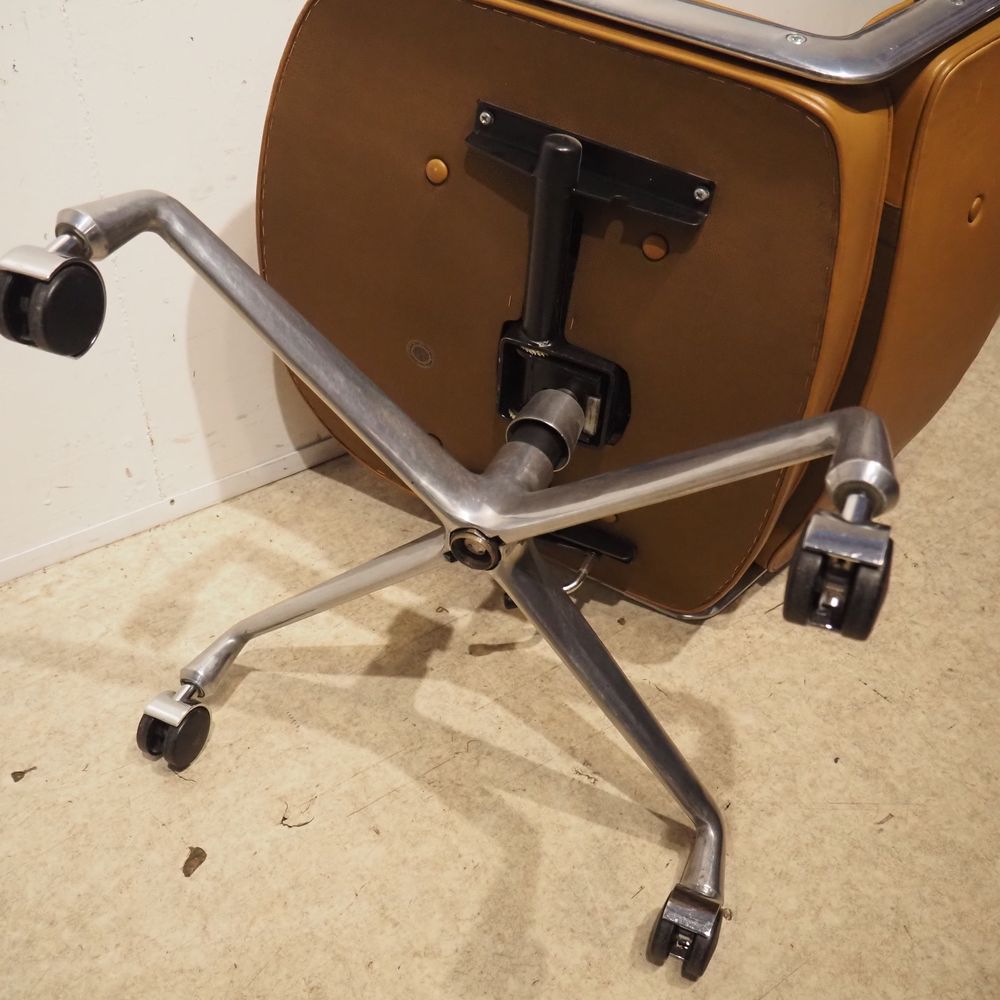 Charles & Ray Eames / Mobilier international : Fauteuil de bureau, modèle Lobby, dessiné en , structure apparente en aluminiuml poli, garni de mousse et recouvert de cuir naturel, pied central télescopique réglage par vis, 4 branches sur roulettes,