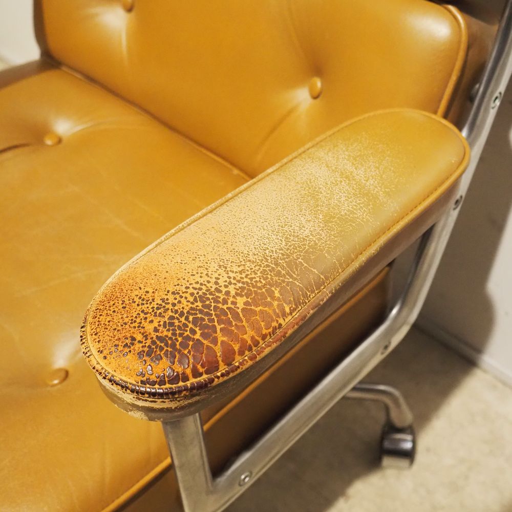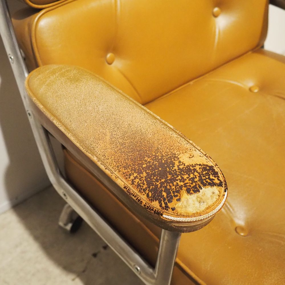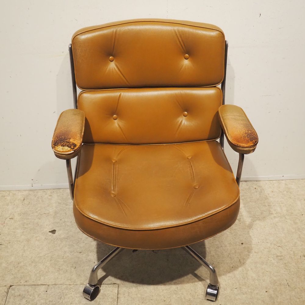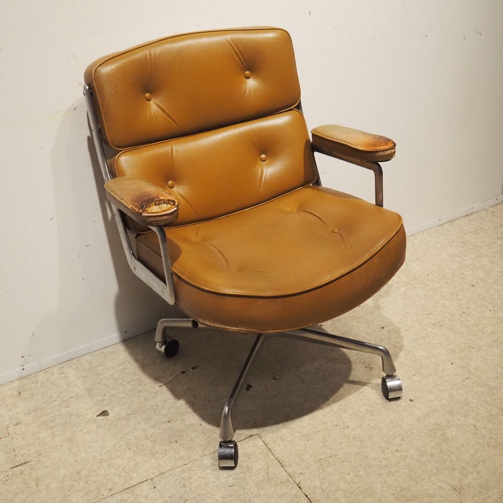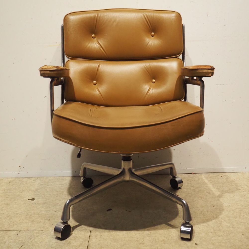 Charles & Ray Eames / Mobilier international : Fauteuil de bureau, modèle Lobby, dessiné en , structure apparente en aluminiuml poli, garni de mousse et recouvert de cuir naturel, pied central télescopique réglage par vis, 4 branches sur roulettes,