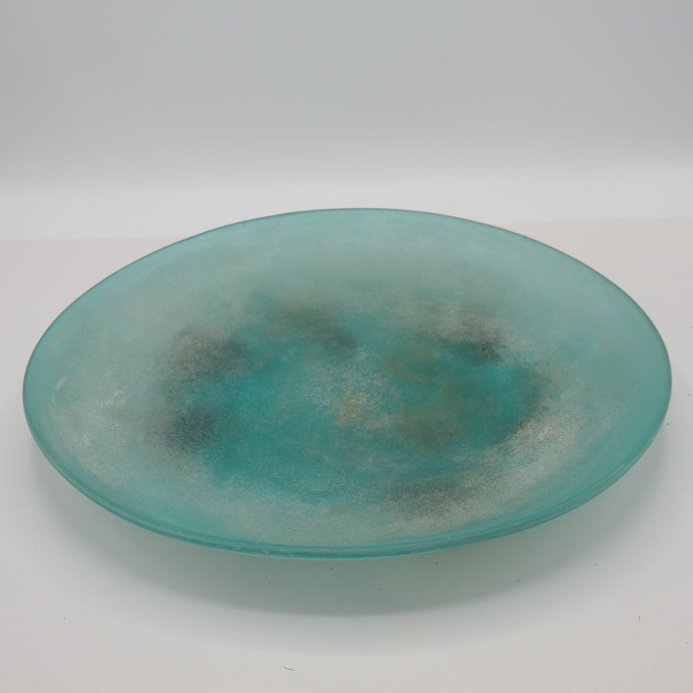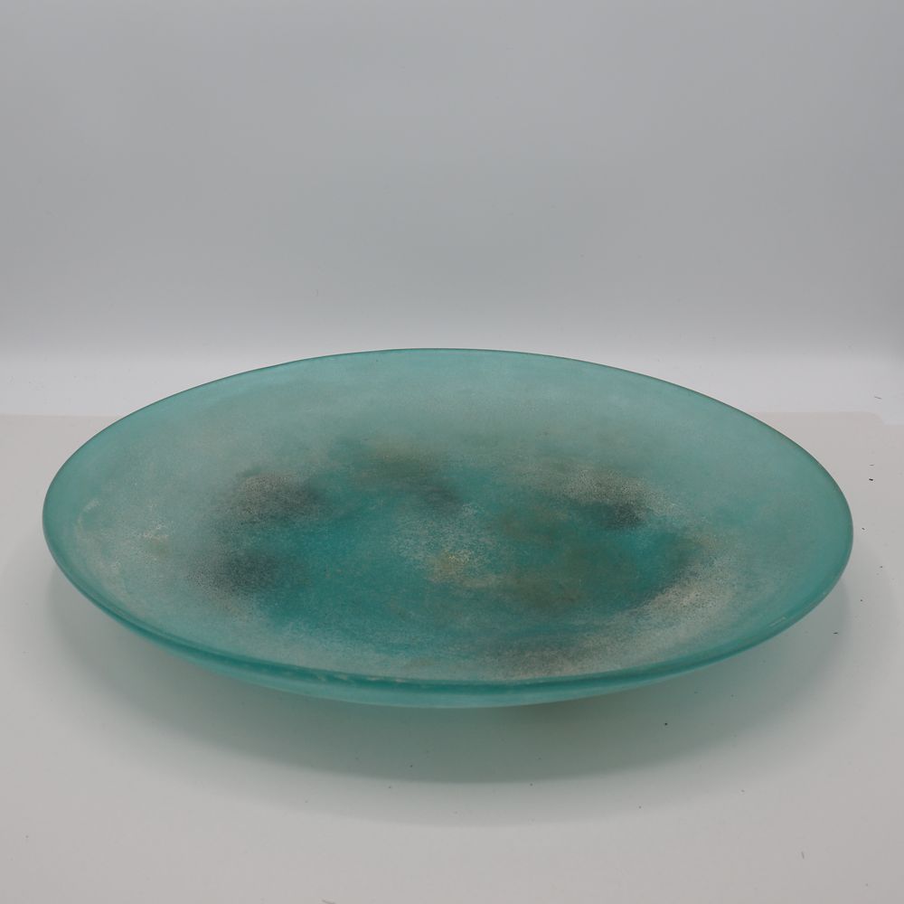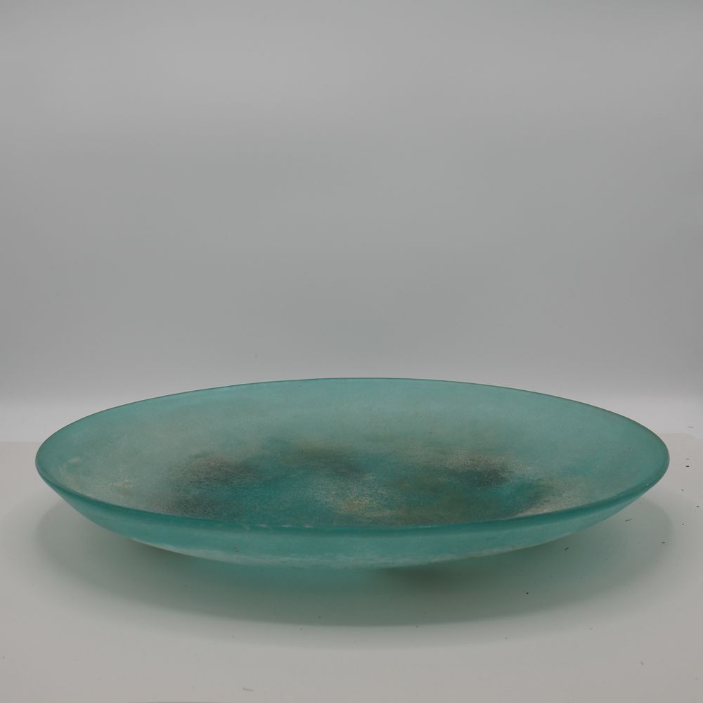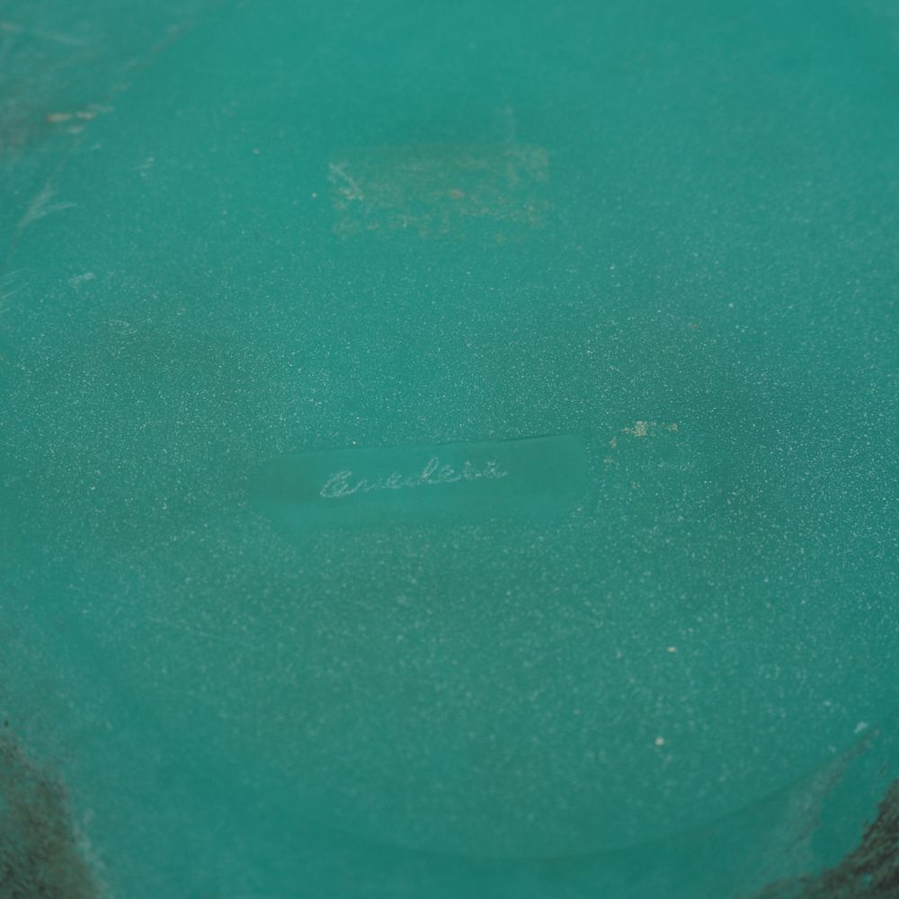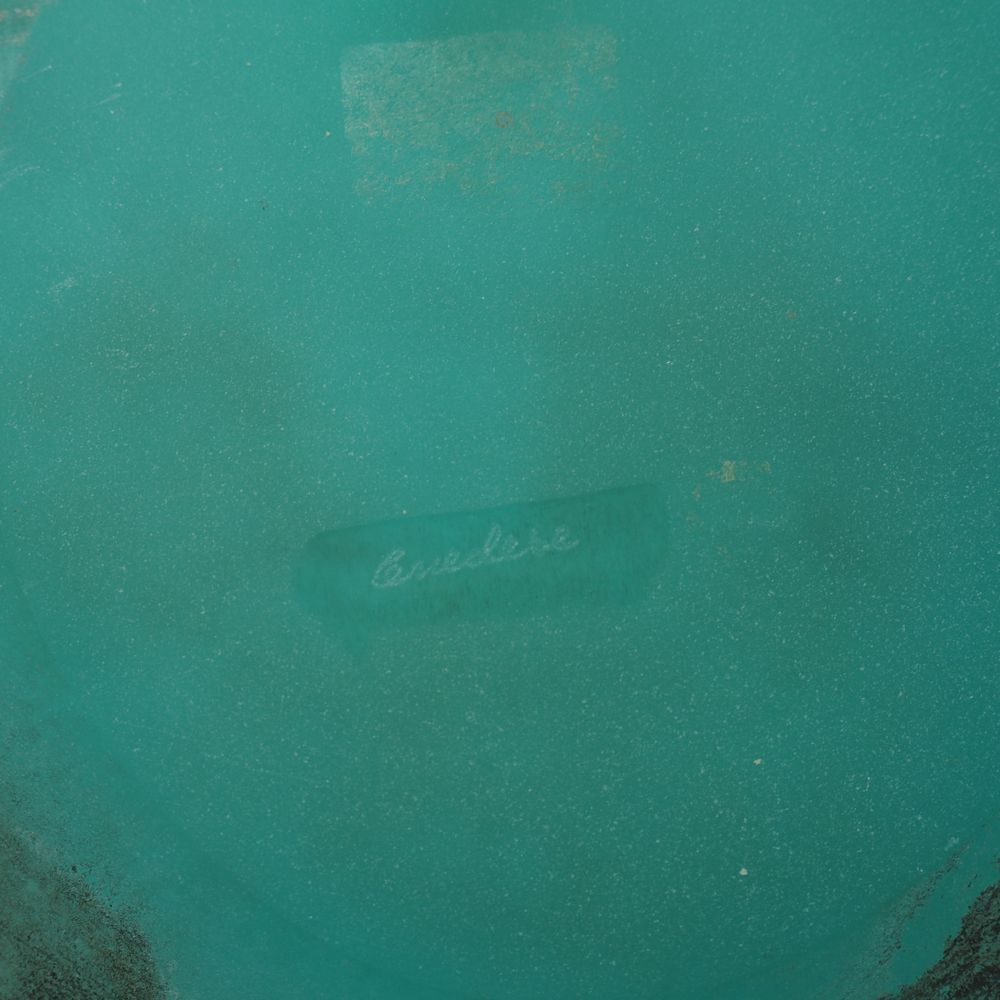 Gino Cenedese (1907-1973) : Milieu de table ovoide, verre soufflé bouche et moulé au sable, teinté vert, signé sous la base, H: 6,3, L: 43, P: 35,4 cm