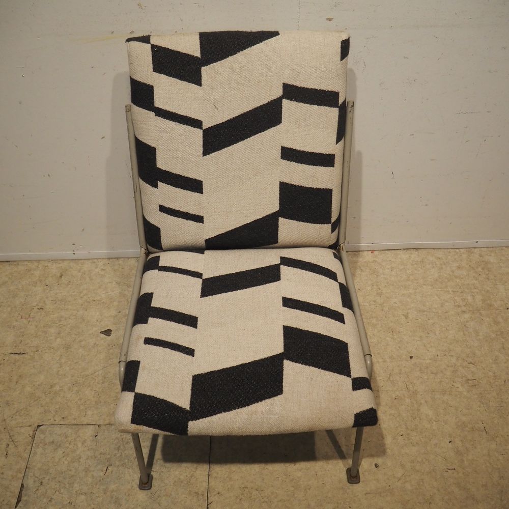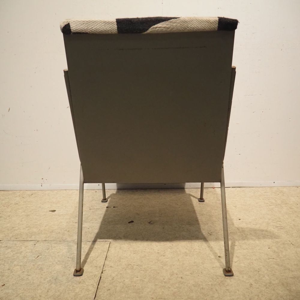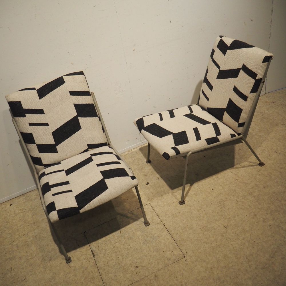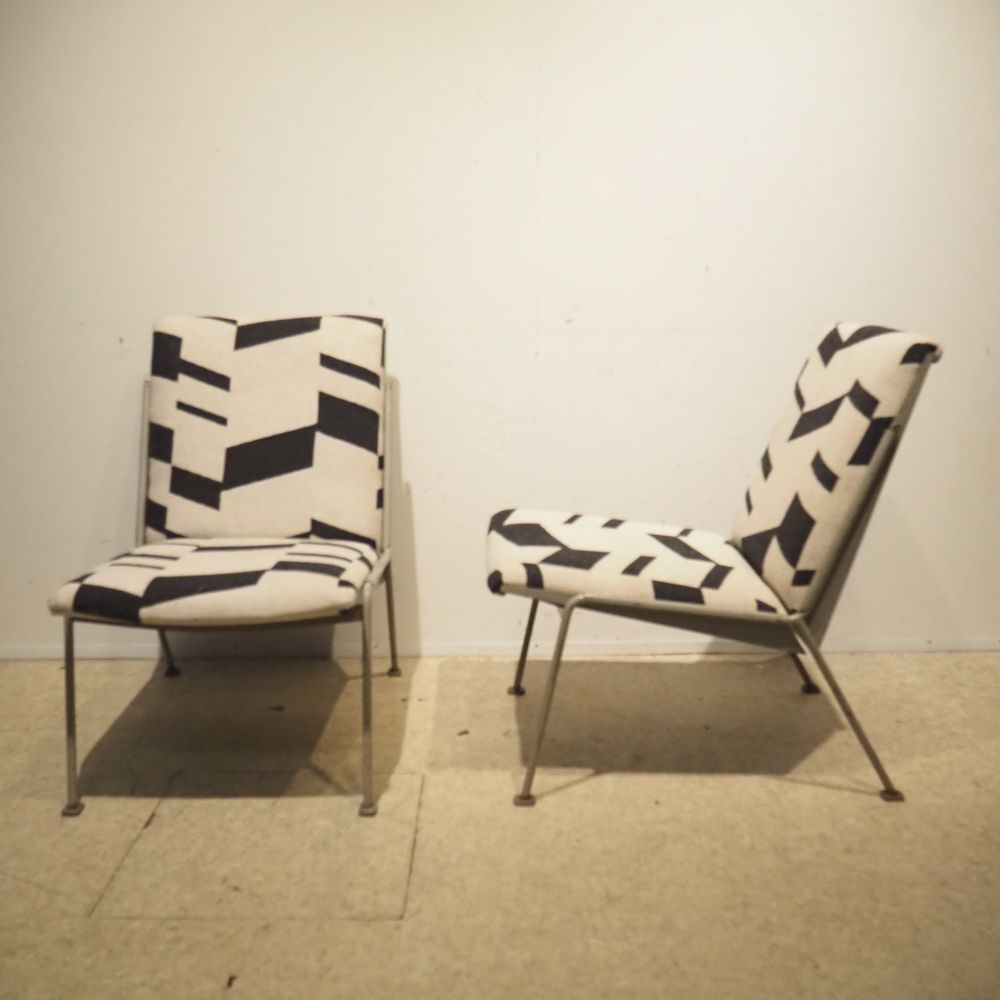 Wim Rietveld 1924-1985 / De Cirkel : Paire de chauffeuses, année 1954, modèle Oase 415/1401, coque en tôle d’acier laqué gris clair. 4 pieds en métal avec sabots, assise et dossier en mousse garni de tissu.