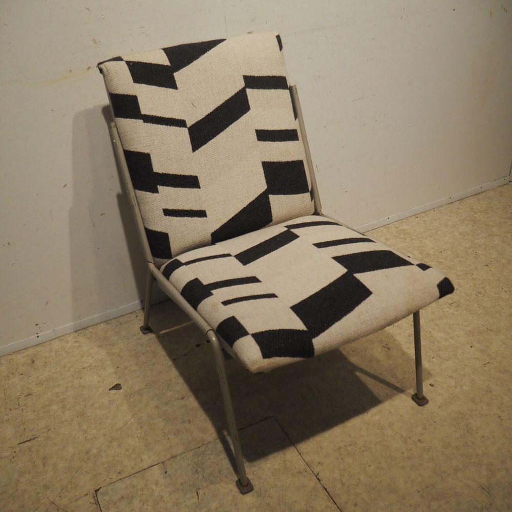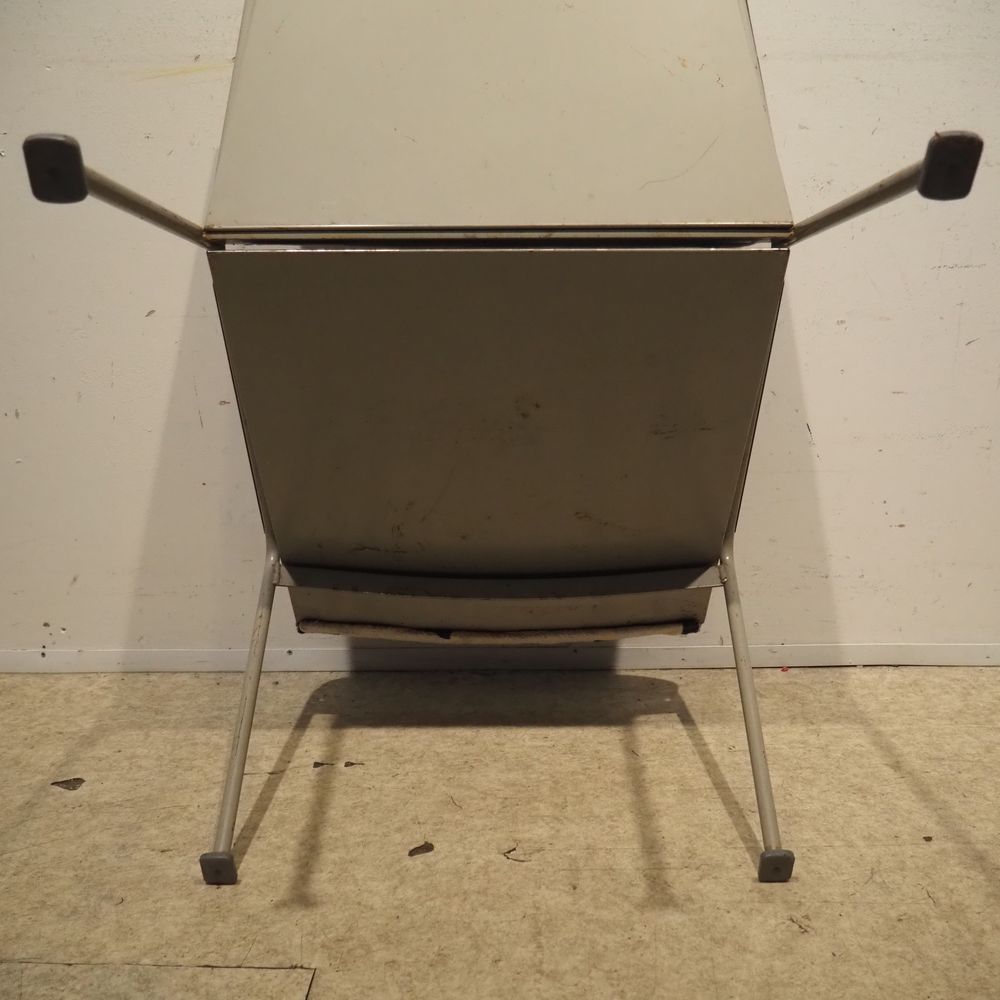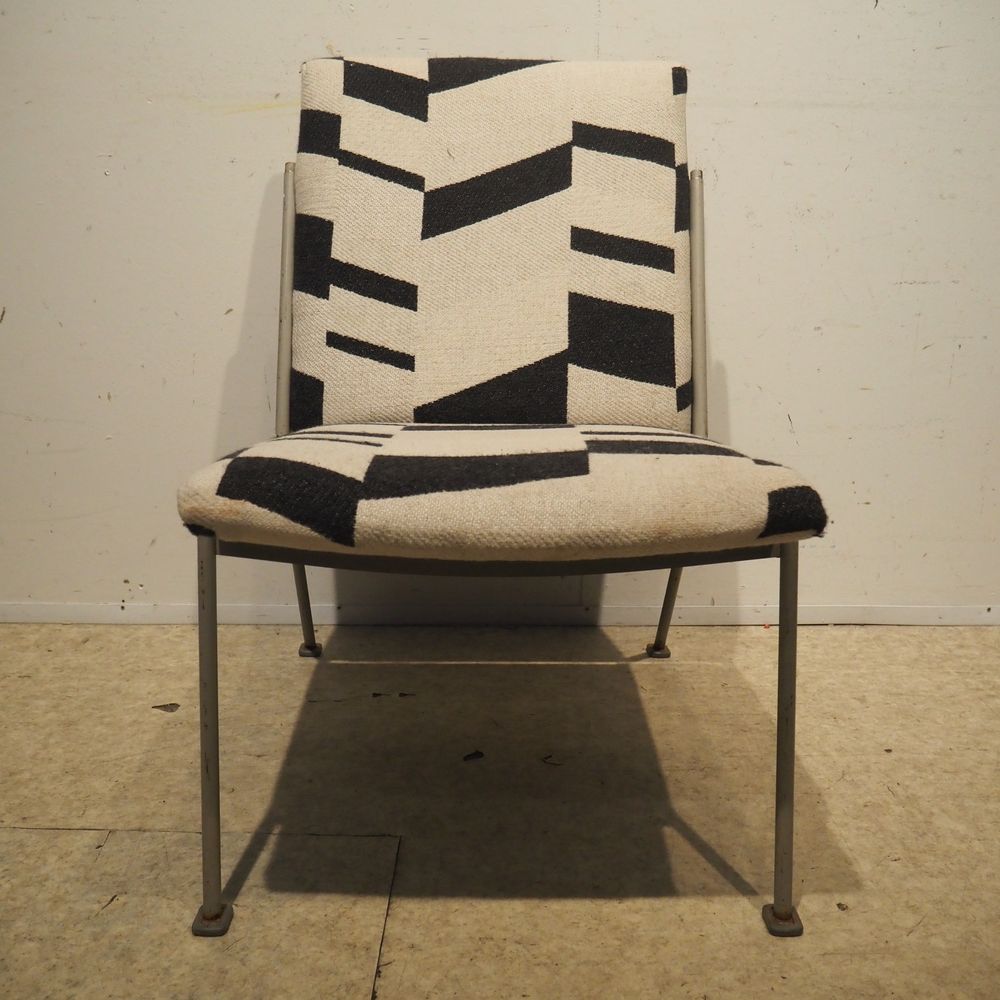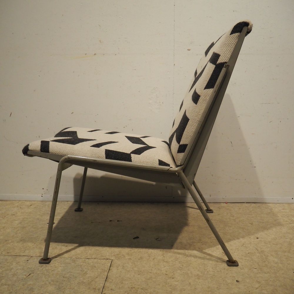 Wim Rietveld 1924-1985 / De Cirkel : Paire de chauffeuses, année 1954, modèle Oase 415/1401, coque en tôle d’acier laqué gris clair. 4 pieds en métal avec sabots, assise et dossier en mousse garni de tissu.