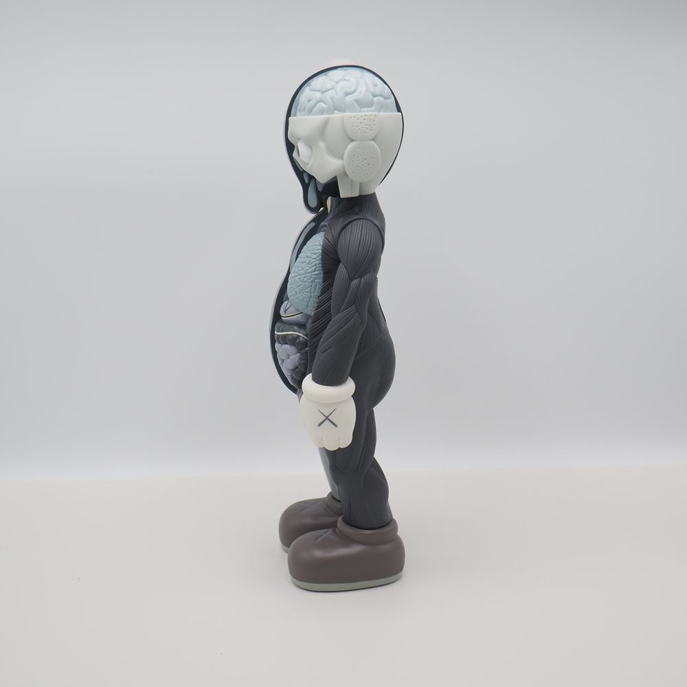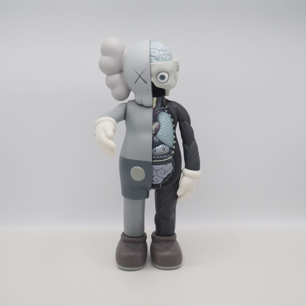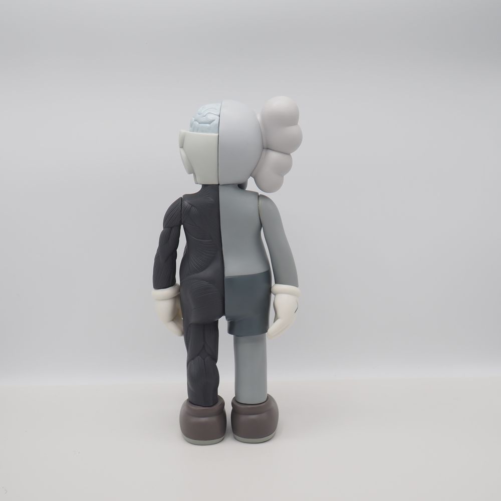 Kaws 1974 / Medicom Toy Origina Fake : Figurine échorchée, matière plastique (vinyle) polychromé ton gris, état proche du neuf, marquée « Kaws » et datée sous le pied 16 pour 2016, Medicom toy China, état proche du neuf avec boite d’origine, H : 34 cm