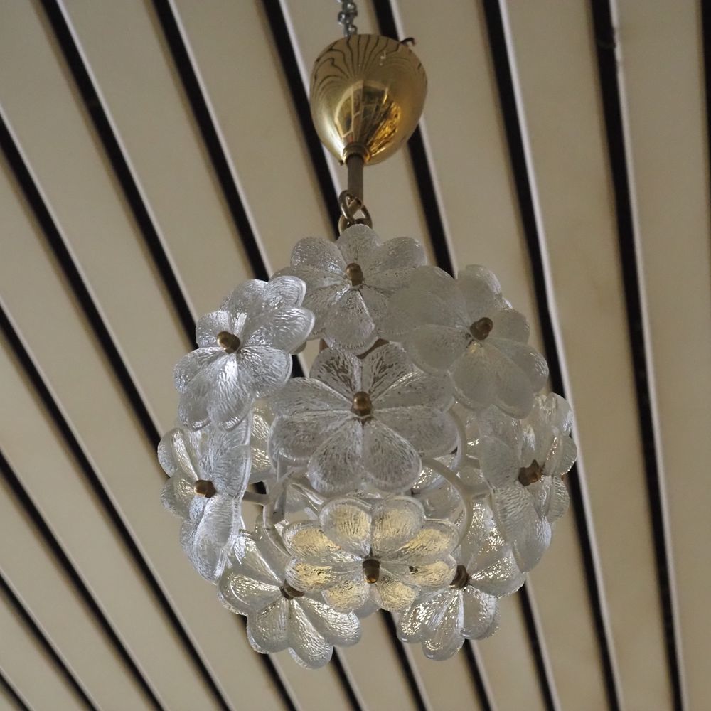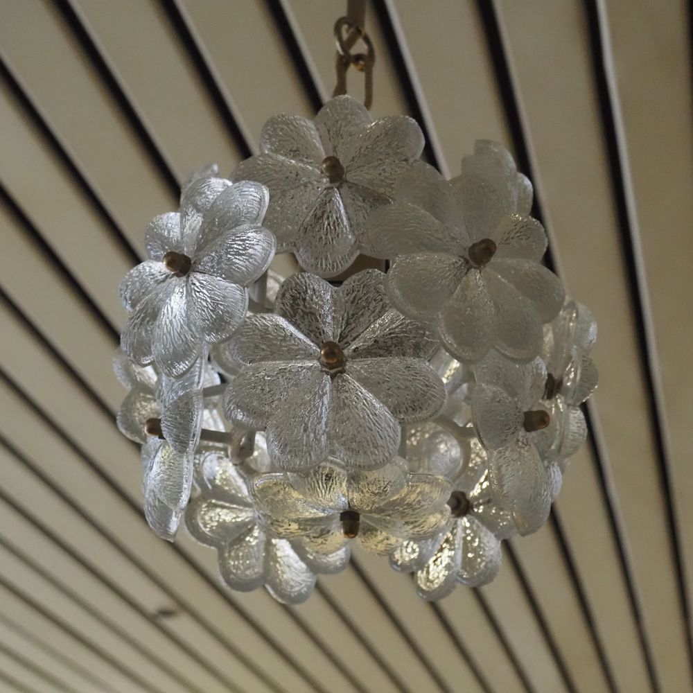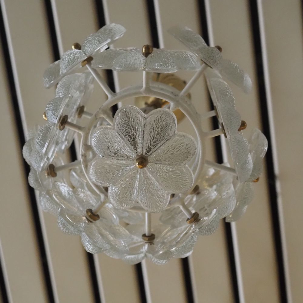 Suspension design vers 1960 : Monture en fer forgé epoxy blanc, verre moulé formant des marguerites, H: 40, diam: 20 cm