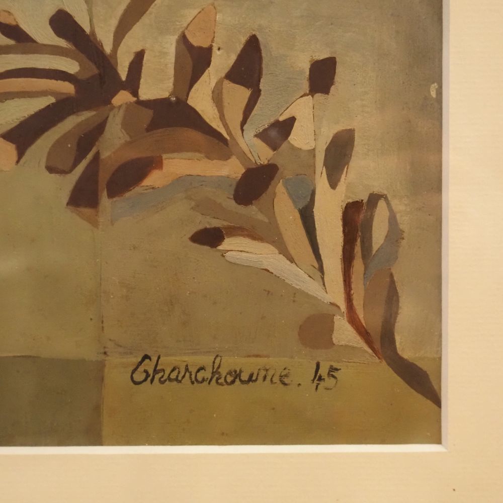 Serge Charchoune 1888-1975 : Huile sur papier, nature morte avec composition cubiste, signée en bas à droite, datée 1945.