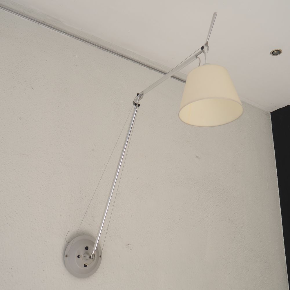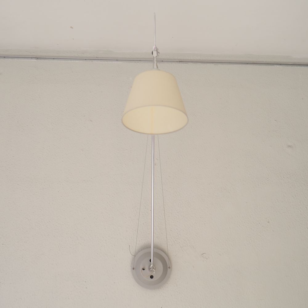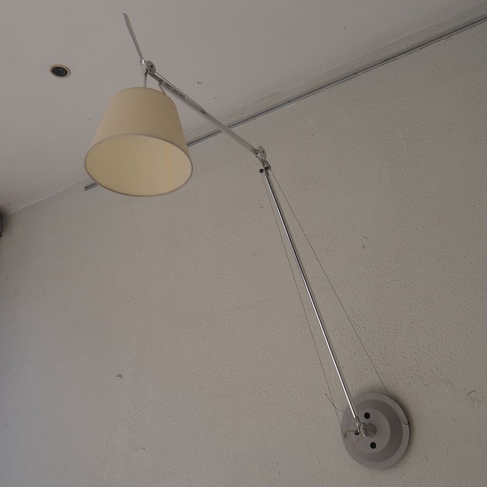 Michele De Lucchi / G.Fassina / Artemide : Paire de lampes murales, modèle Toloméo, aluminium poli avec axe et cable, déflecteur conique, parfait état