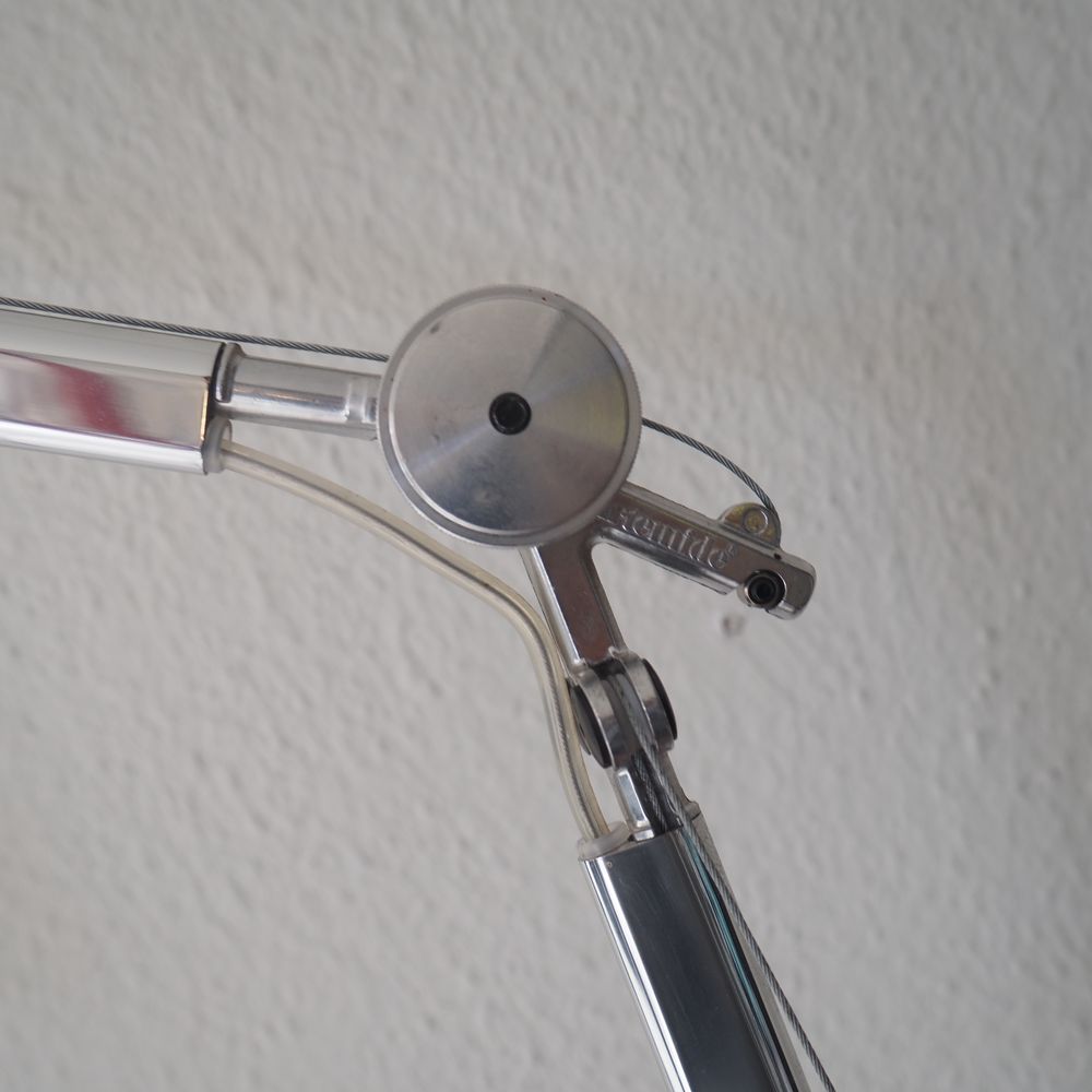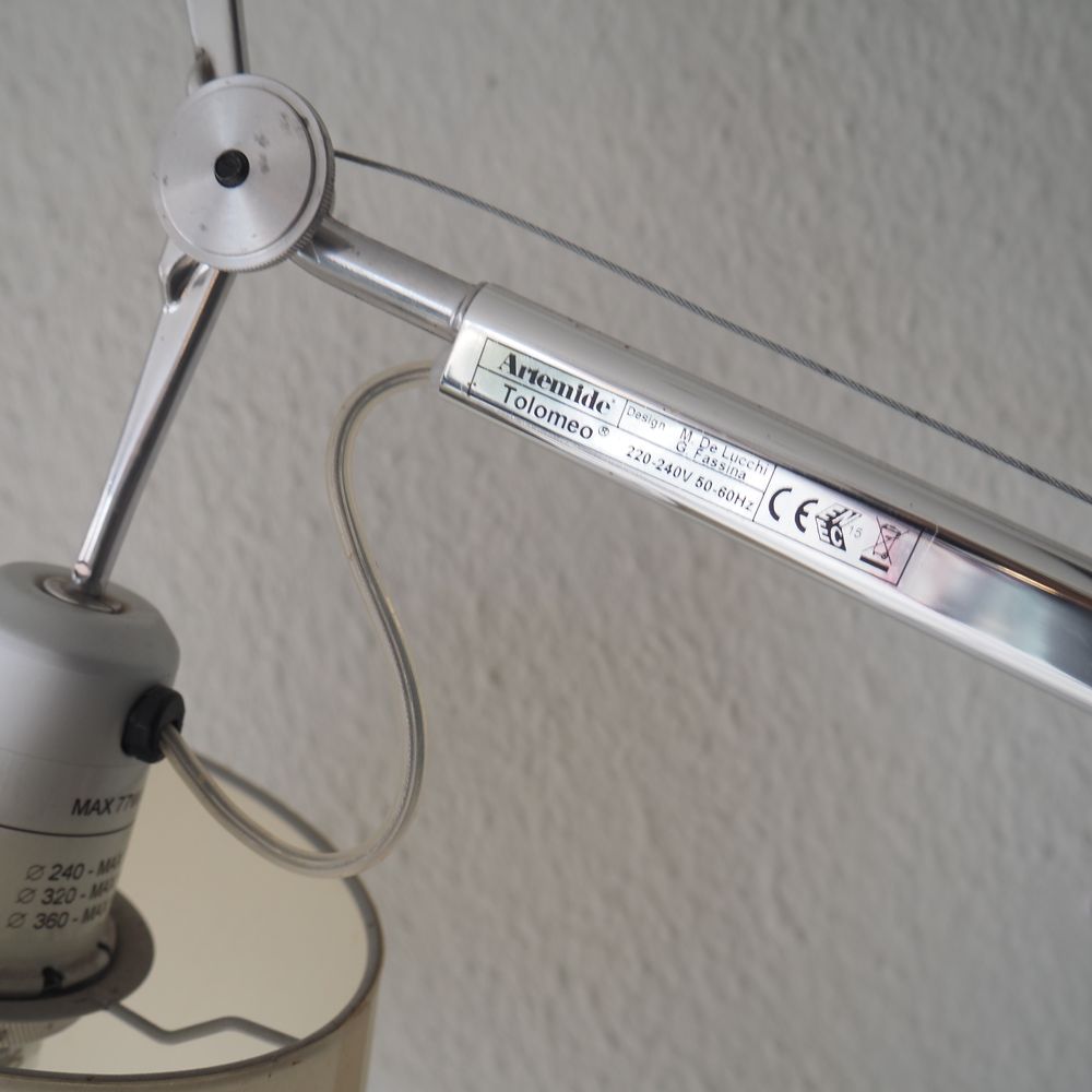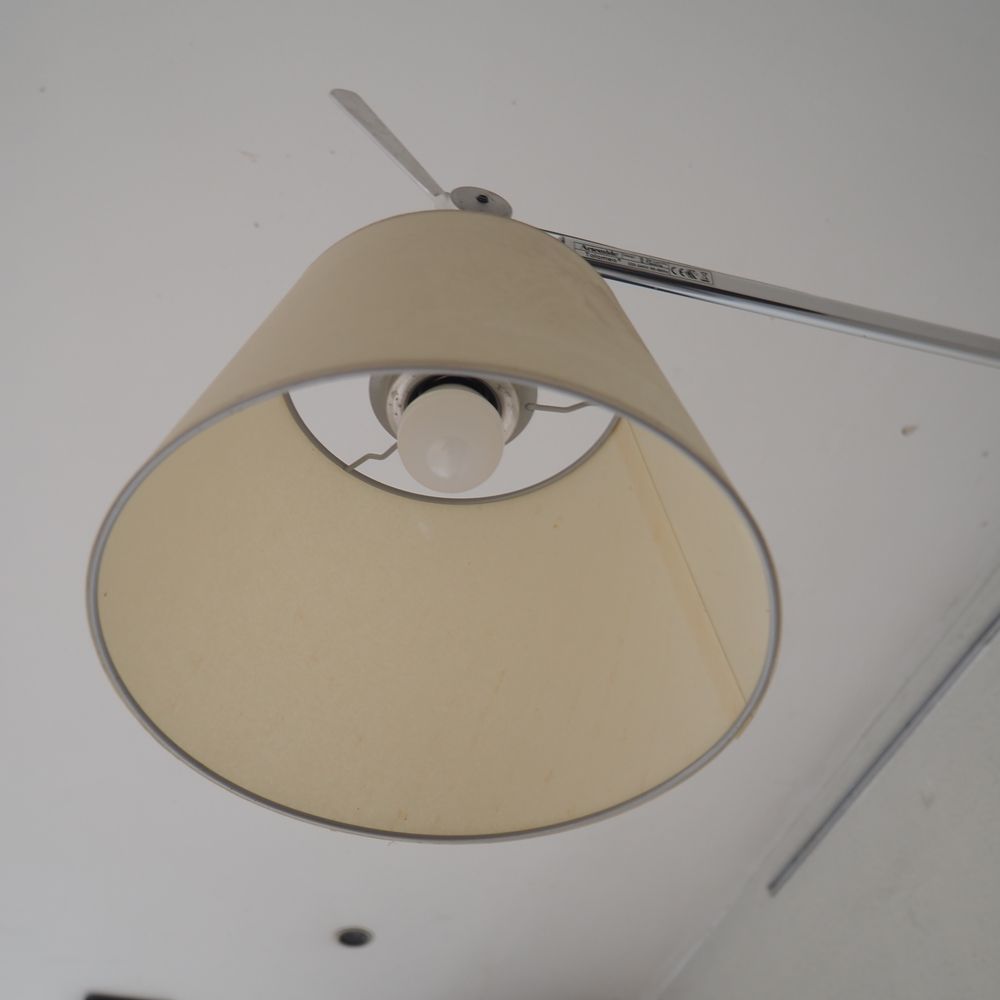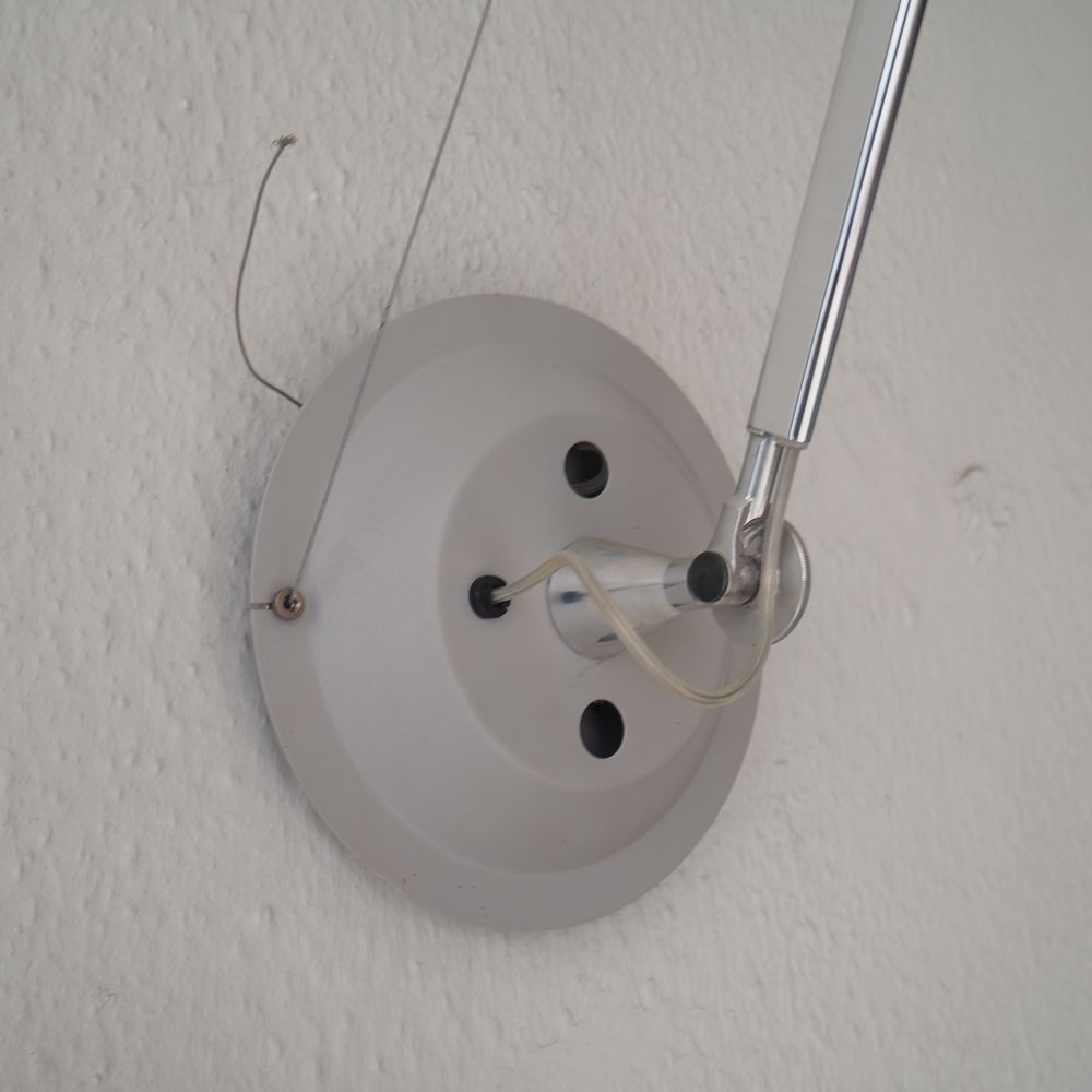 Michele De Lucchi / G.Fassina / Artemide : Paire de lampes murales, modèle Toloméo, aluminium poli avec axe et cable, déflecteur conique, parfait état