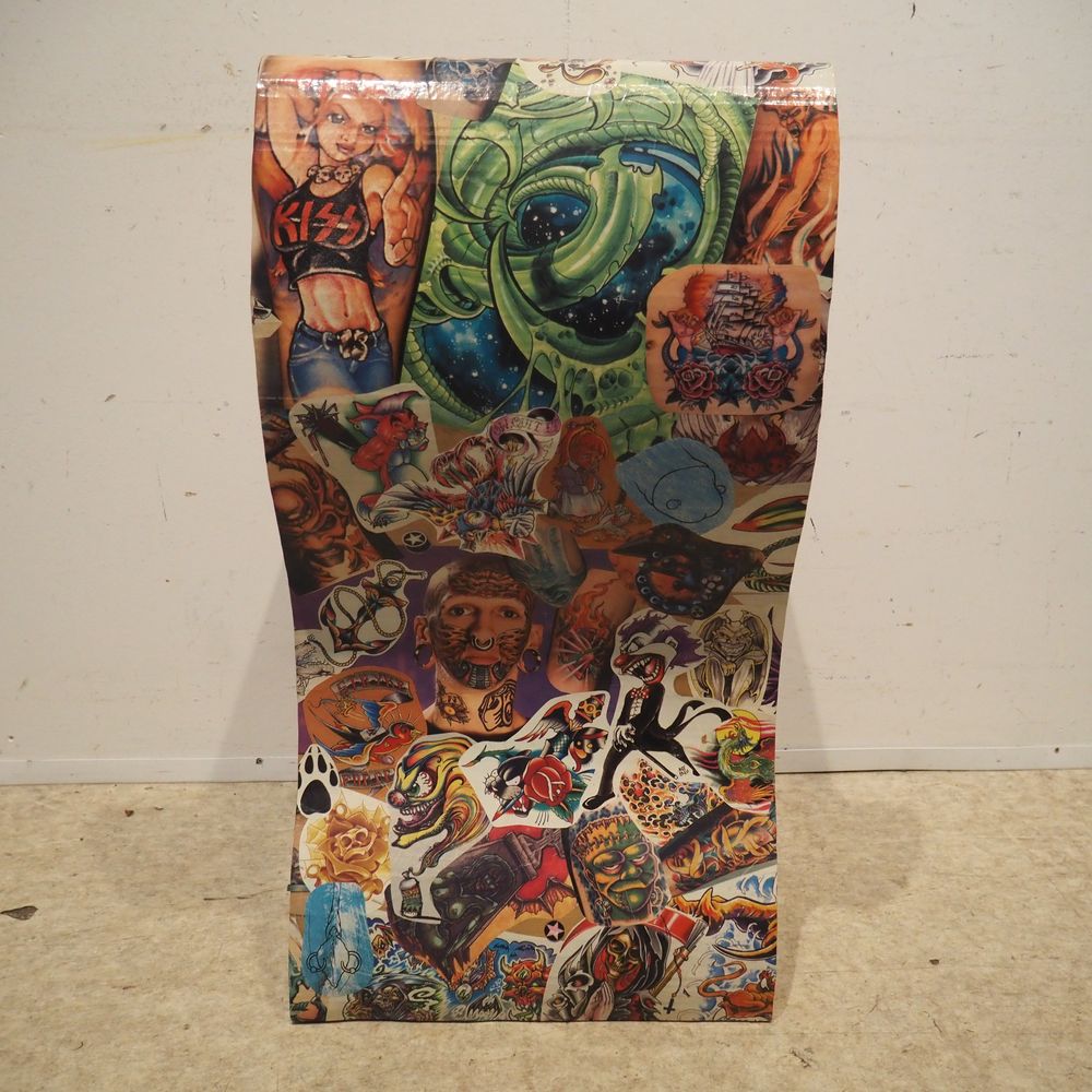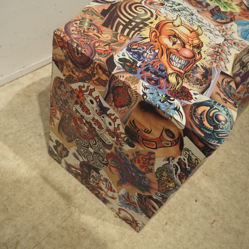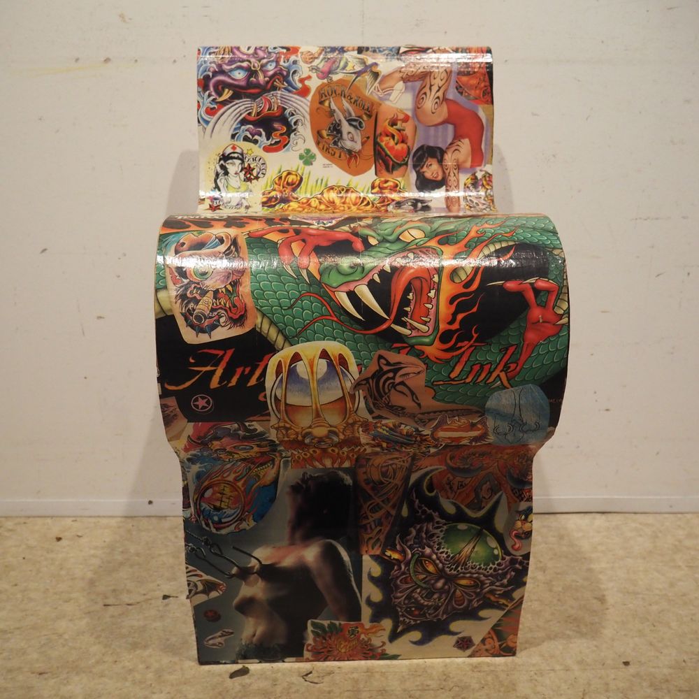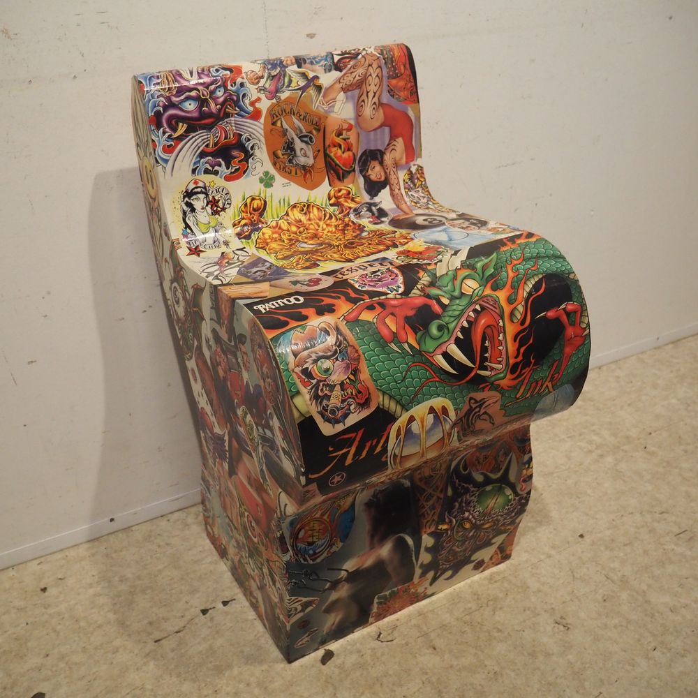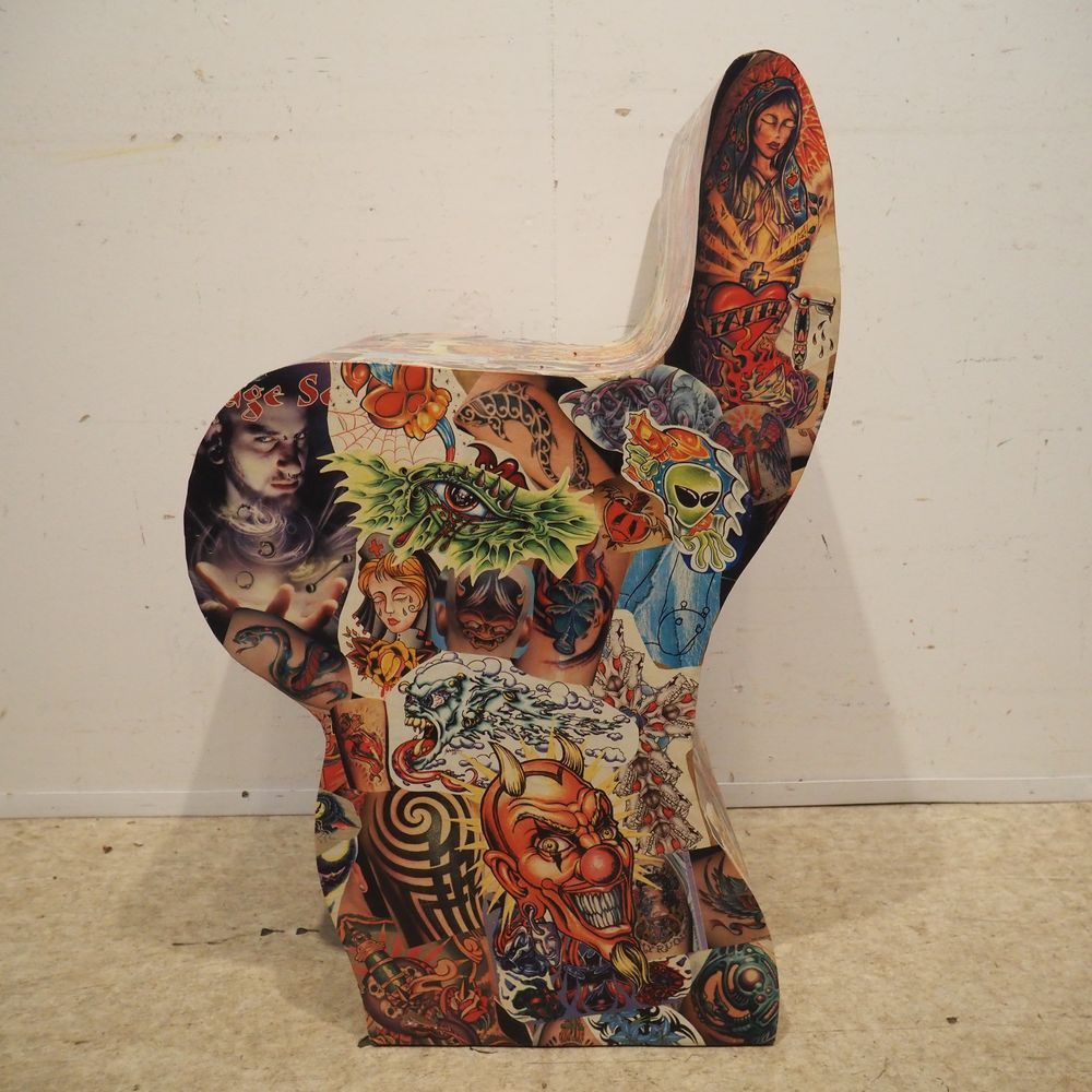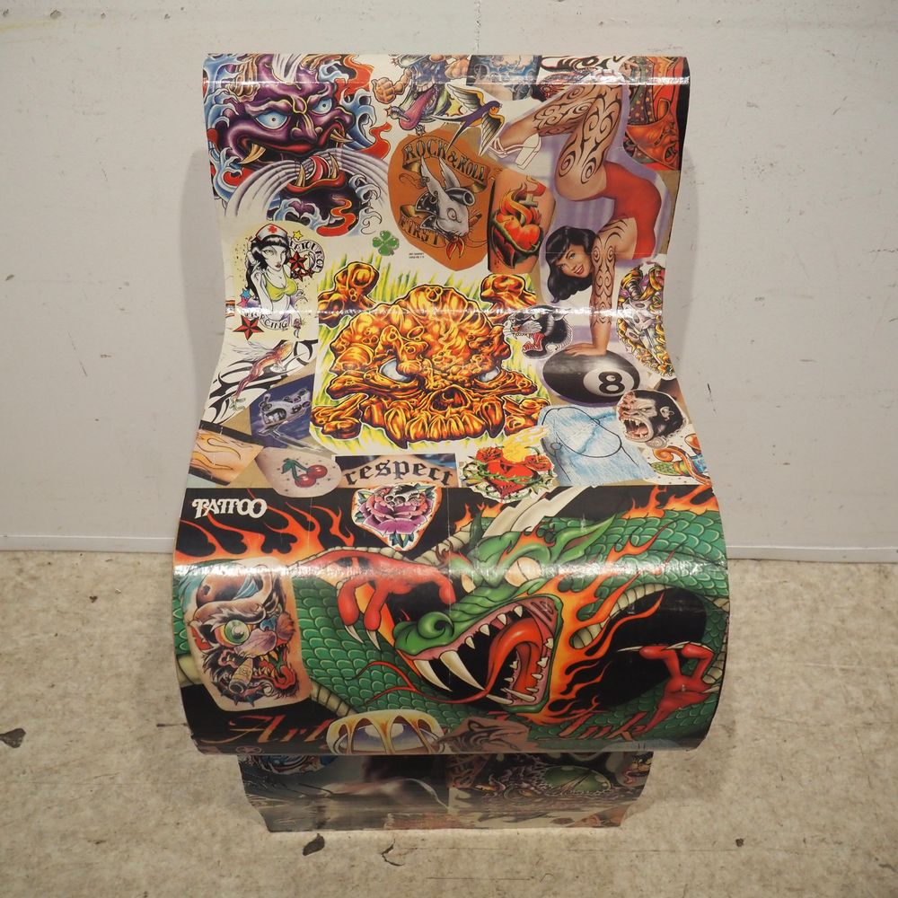 Chaise vers 2000 : Carton découpé et collage avec feuilles de magazines, H: 78, P: 46, L: 40,6 cm