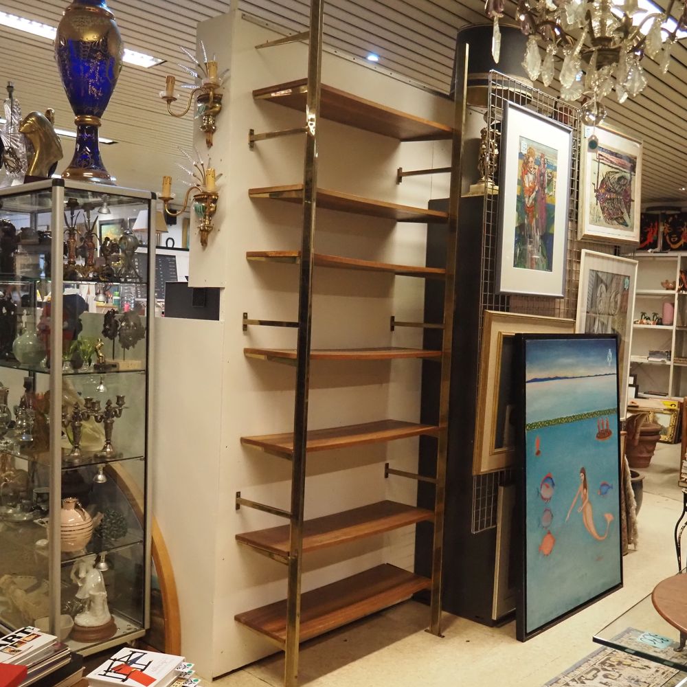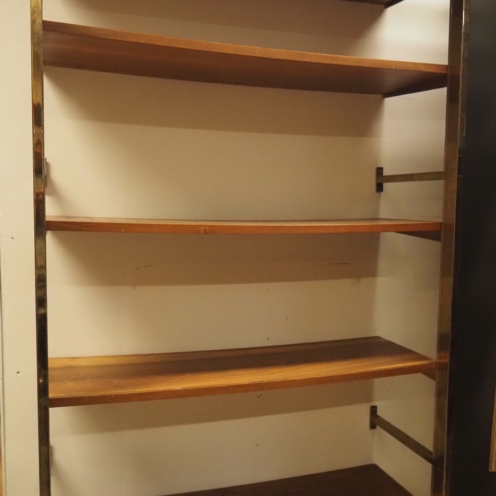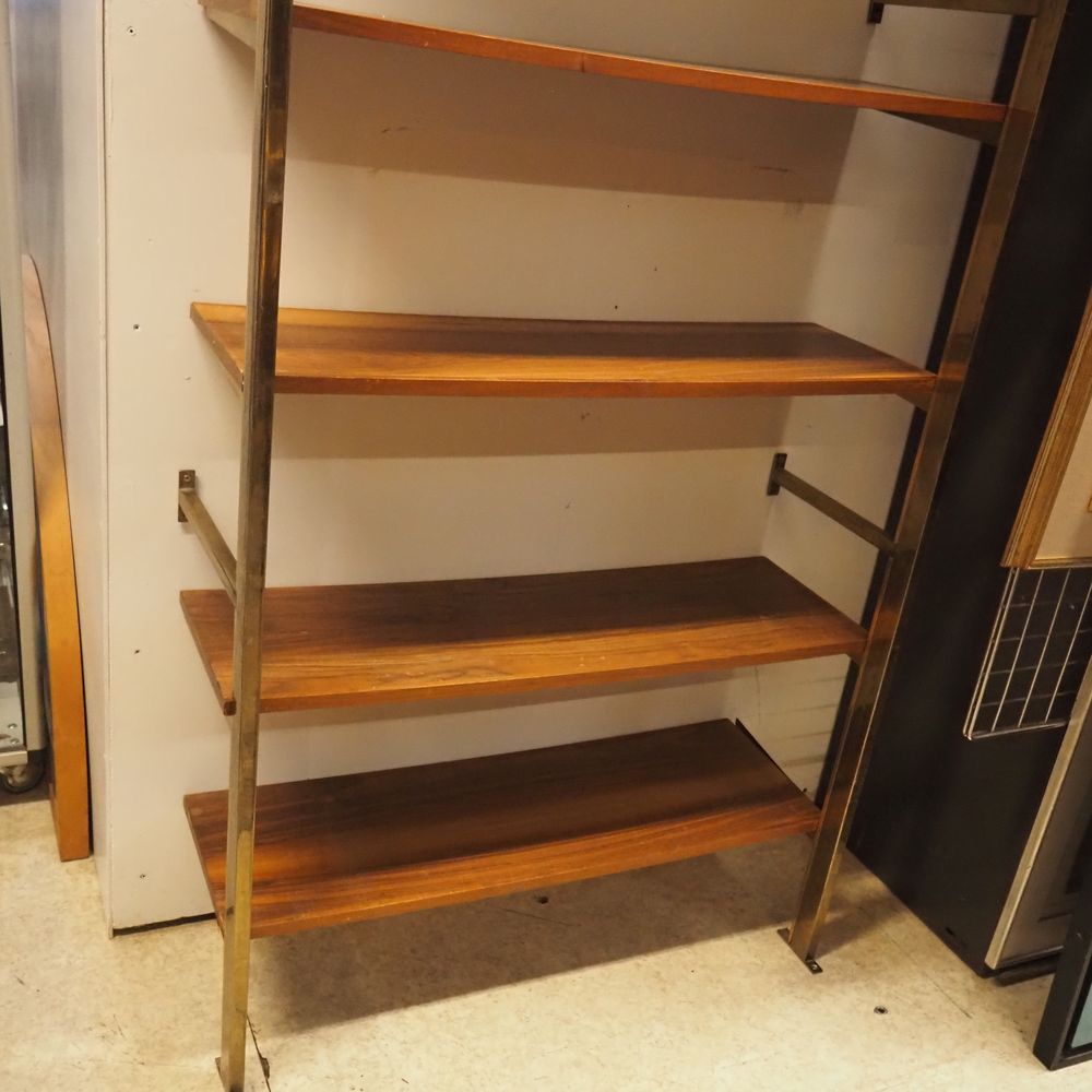 Importante étagère vers 1950 à fixation sol et mur : Composée de 4 montants en laiton doré avec étagères de bois plaqué Teck (à rafraichir), Ht montant: 260 cm, P: 34 cm