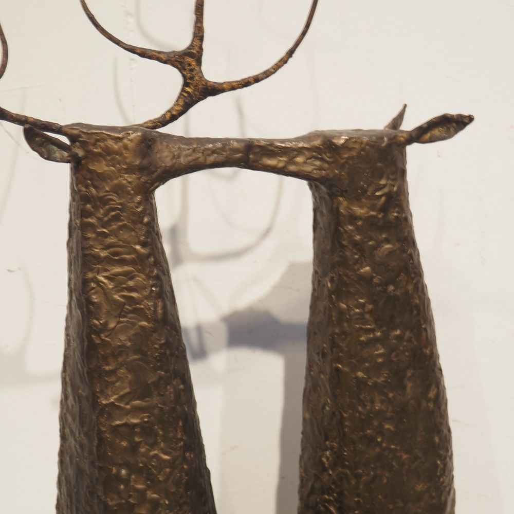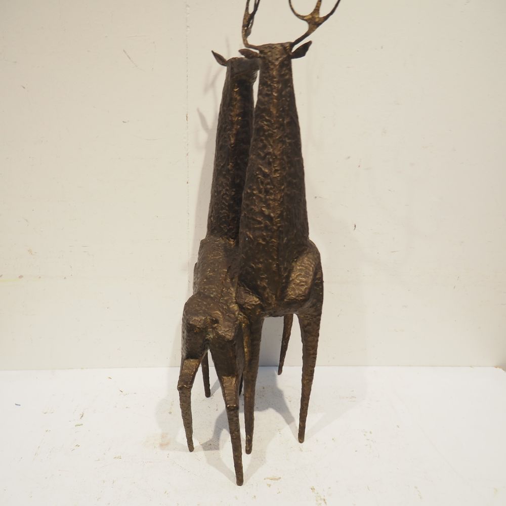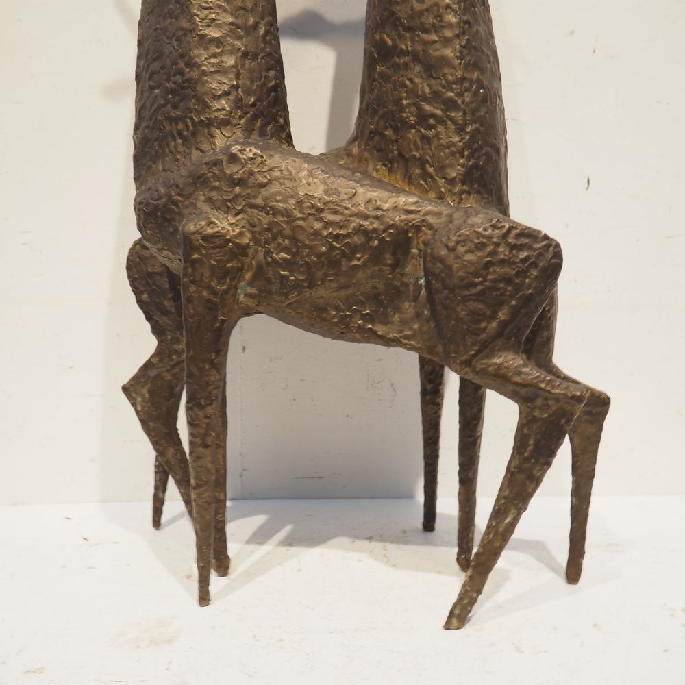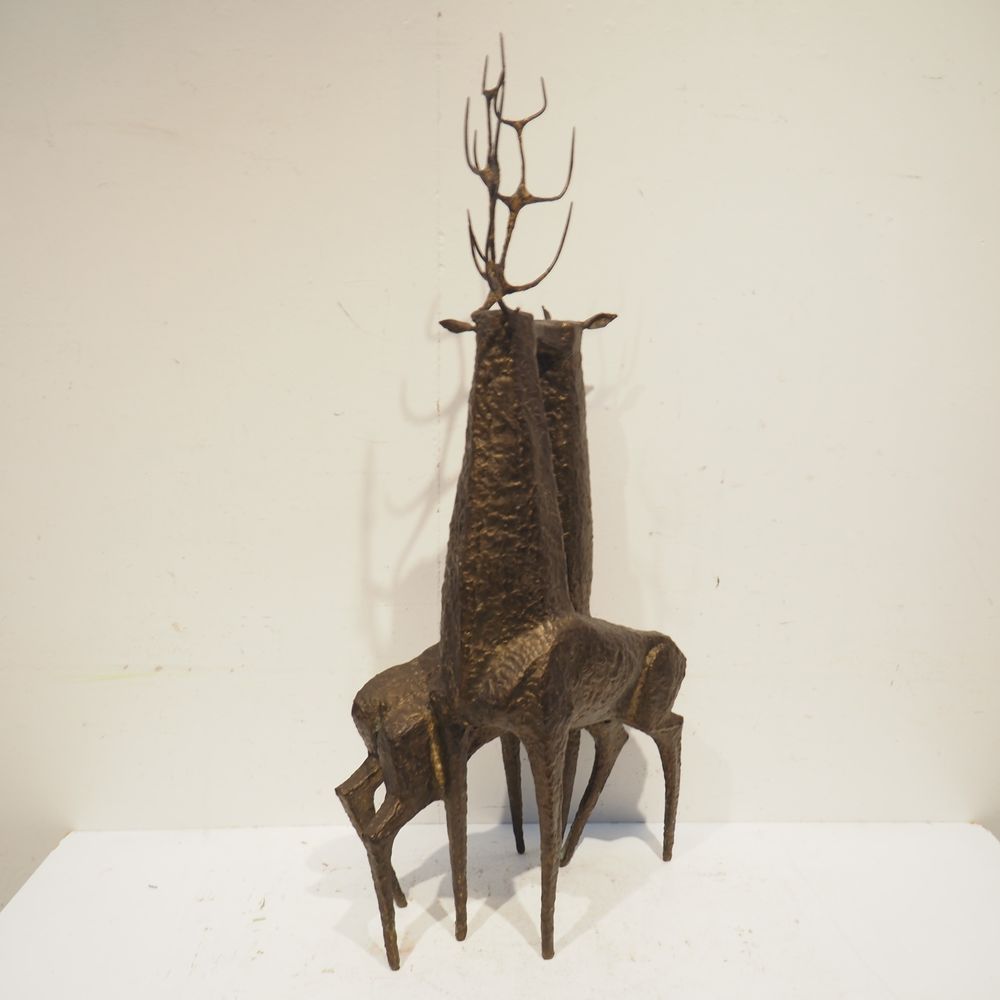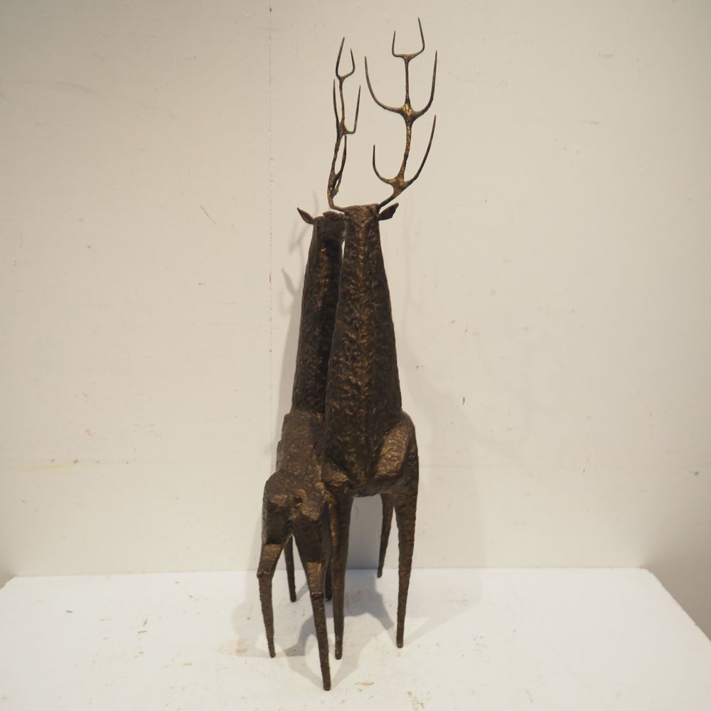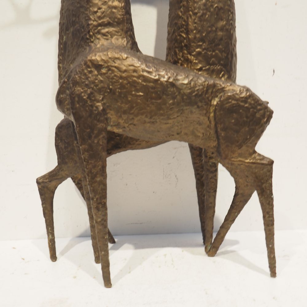 Jean-Pierre Ghysels 1932 – 2024 élève de Ossip Zadkin : Sculpture zoomorphique, pièce unique, bronze patiné, figurant un couple de cervidés, signée jambe arrière droite, datée 1963, H: 94, L: 40, P: 24 cm (+4% de droit de suites)