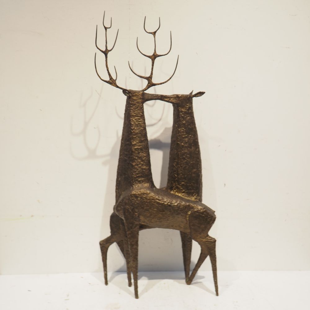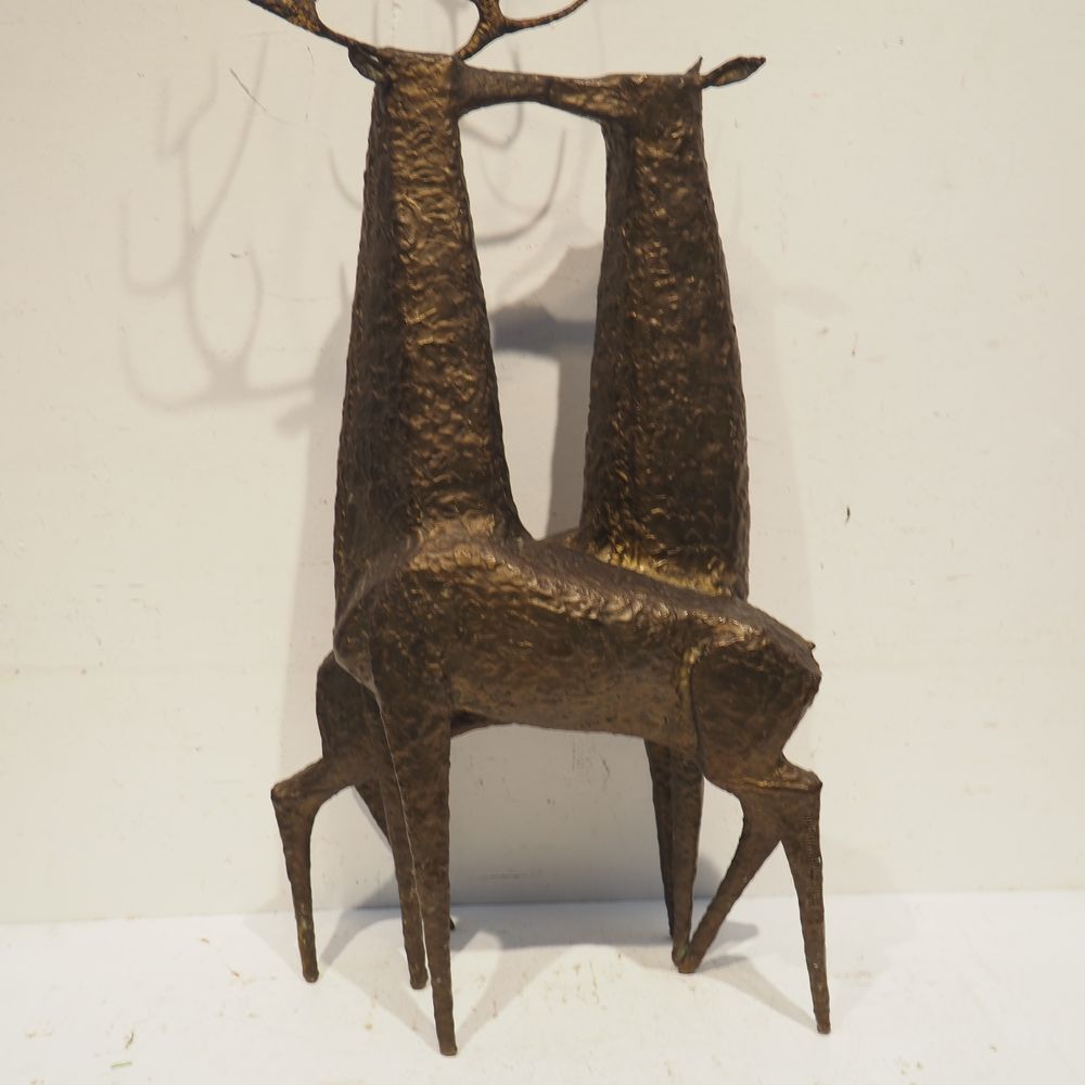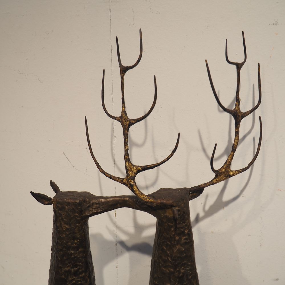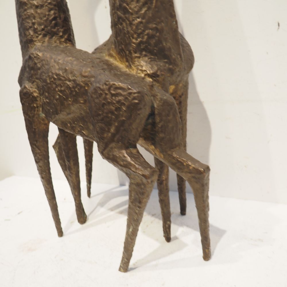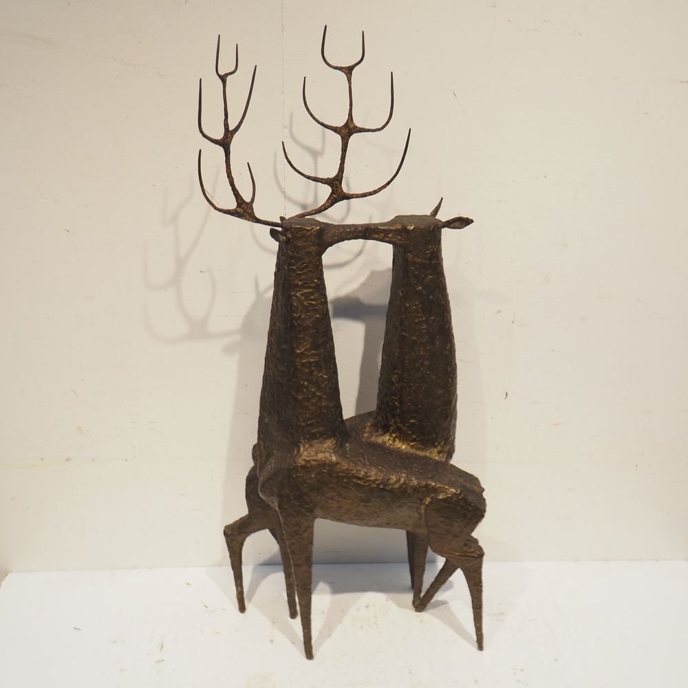 Jean-Pierre Ghysels 1932 – 2024 élève de Ossip Zadkin : Sculpture zoomorphique, pièce unique, bronze patiné, figurant un couple de cervidés, signée jambe arrière droite, datée 1963, H: 94, L: 40, P: 24 cm (+4% de droit de suites)