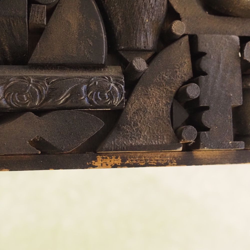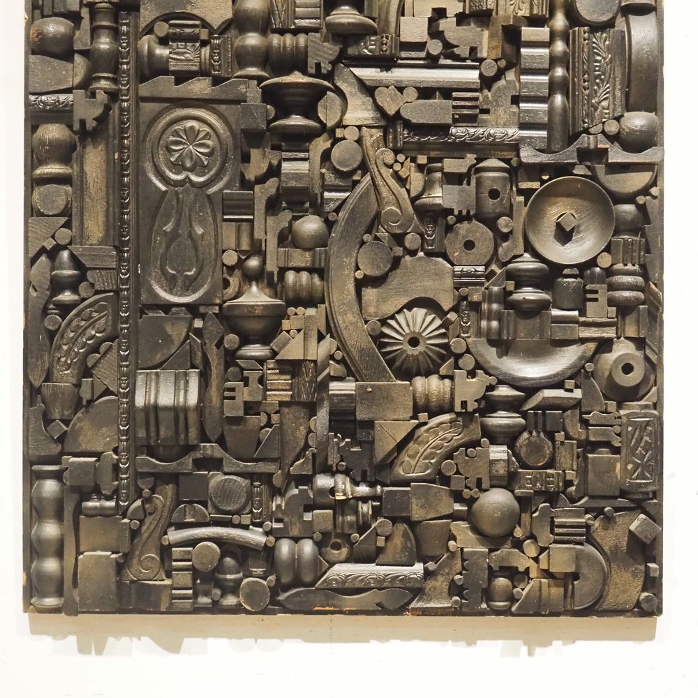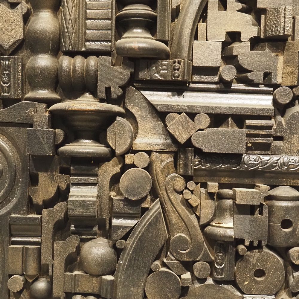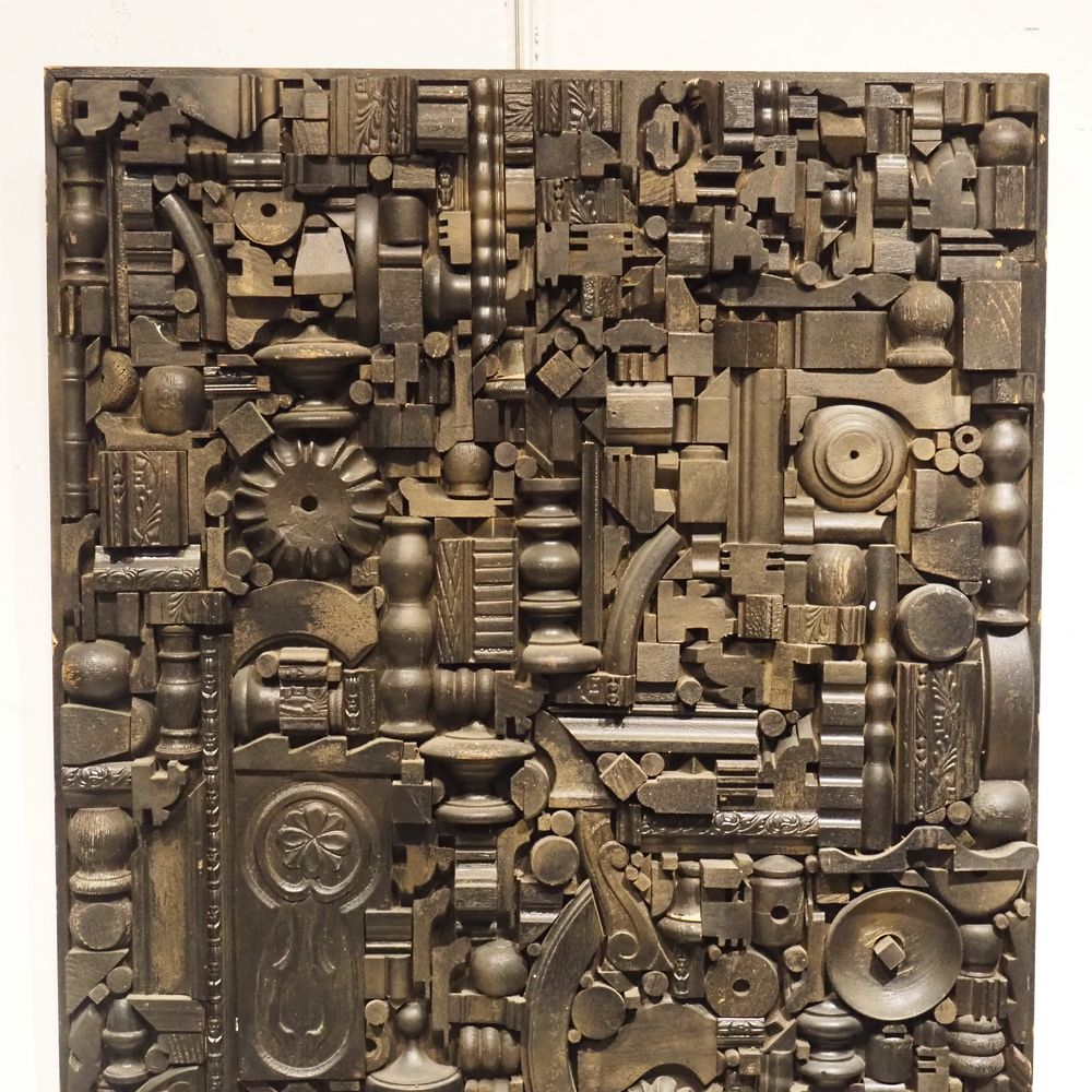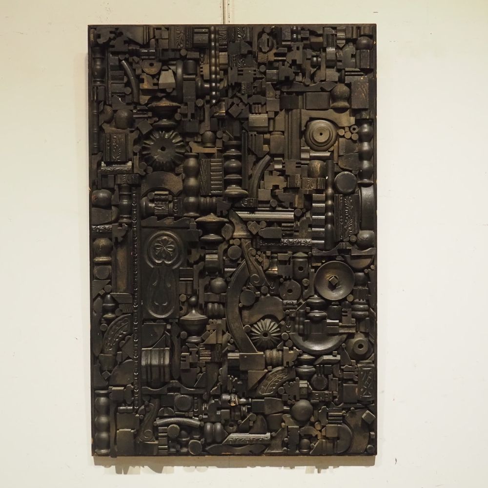Fr Sonck : Sculpture murale relief vers 1960. Composition avec éléments de menuiserie en bois noirci, estampillée en bas à droite Fr Sonck, H: 94, L: 62 cm