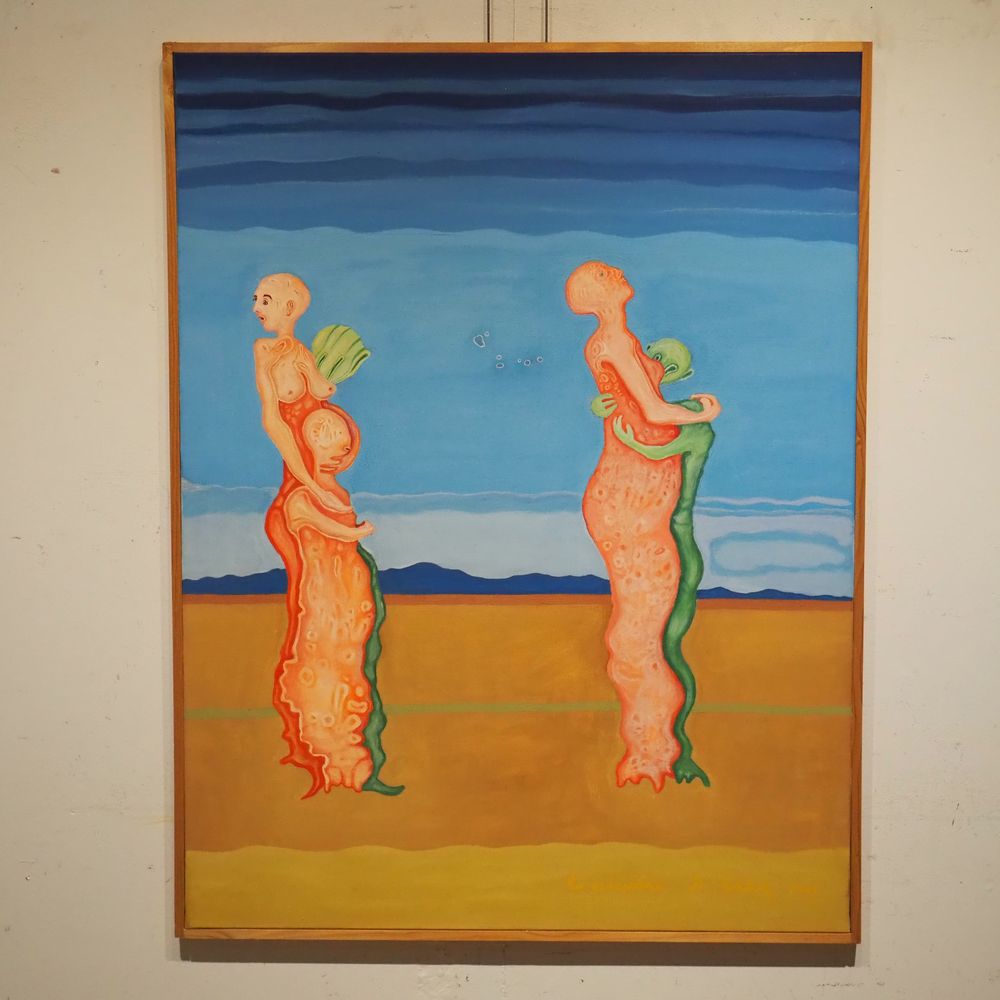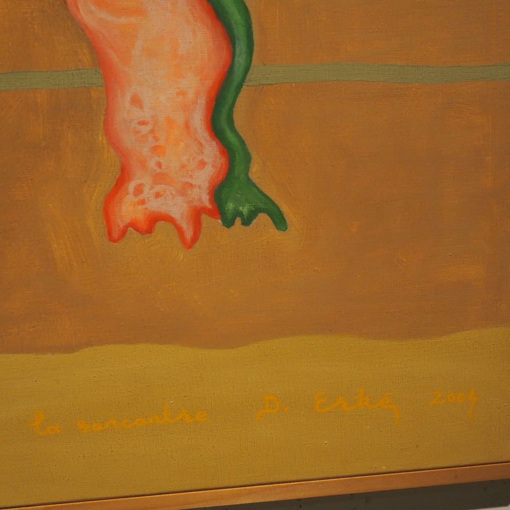 Dinçer Erké : Technique mixte, huile et acrylique sur toile, « La rencontre », scène surréaliste avec personnages, signée à droite, datée 2004, dim: 115,5 x 88,5 cm