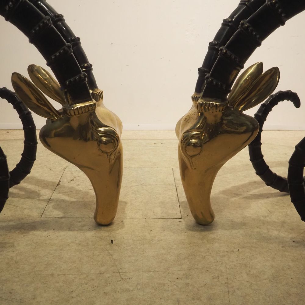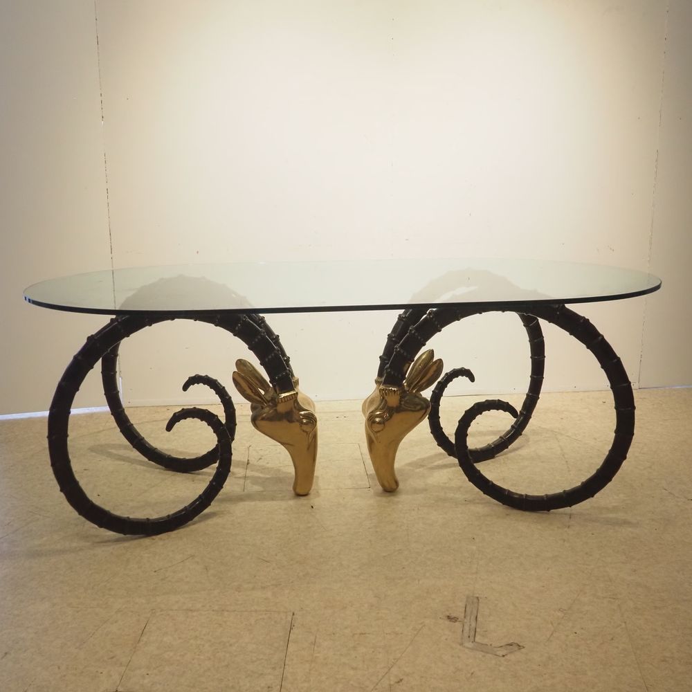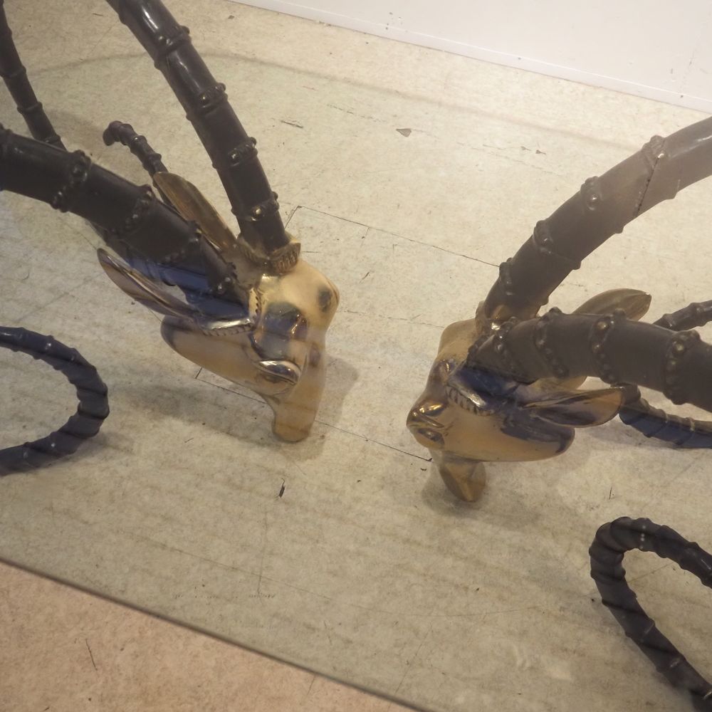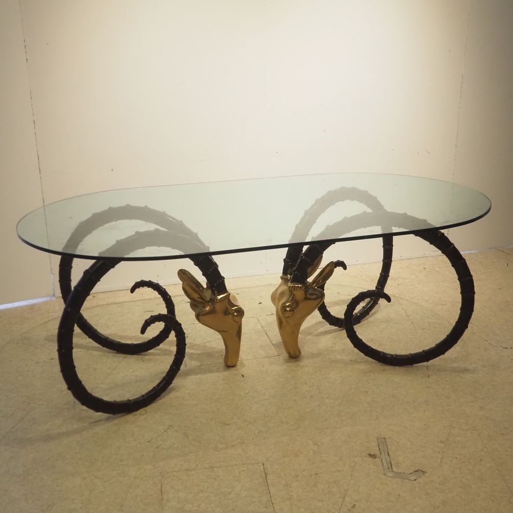 Chervet Alain 1944 : Table haute vers 1970,modèle « Ibex », plateau ovale en verre clair, posé sur 2 pieds figurant 2 têtes de mouflons en bronze à 2 patines polie et noire, figurant 2 têtes de mouflons, H: 73, L: 200, P: 107 cm