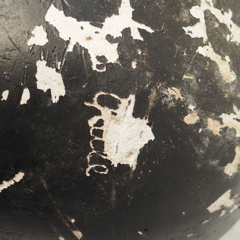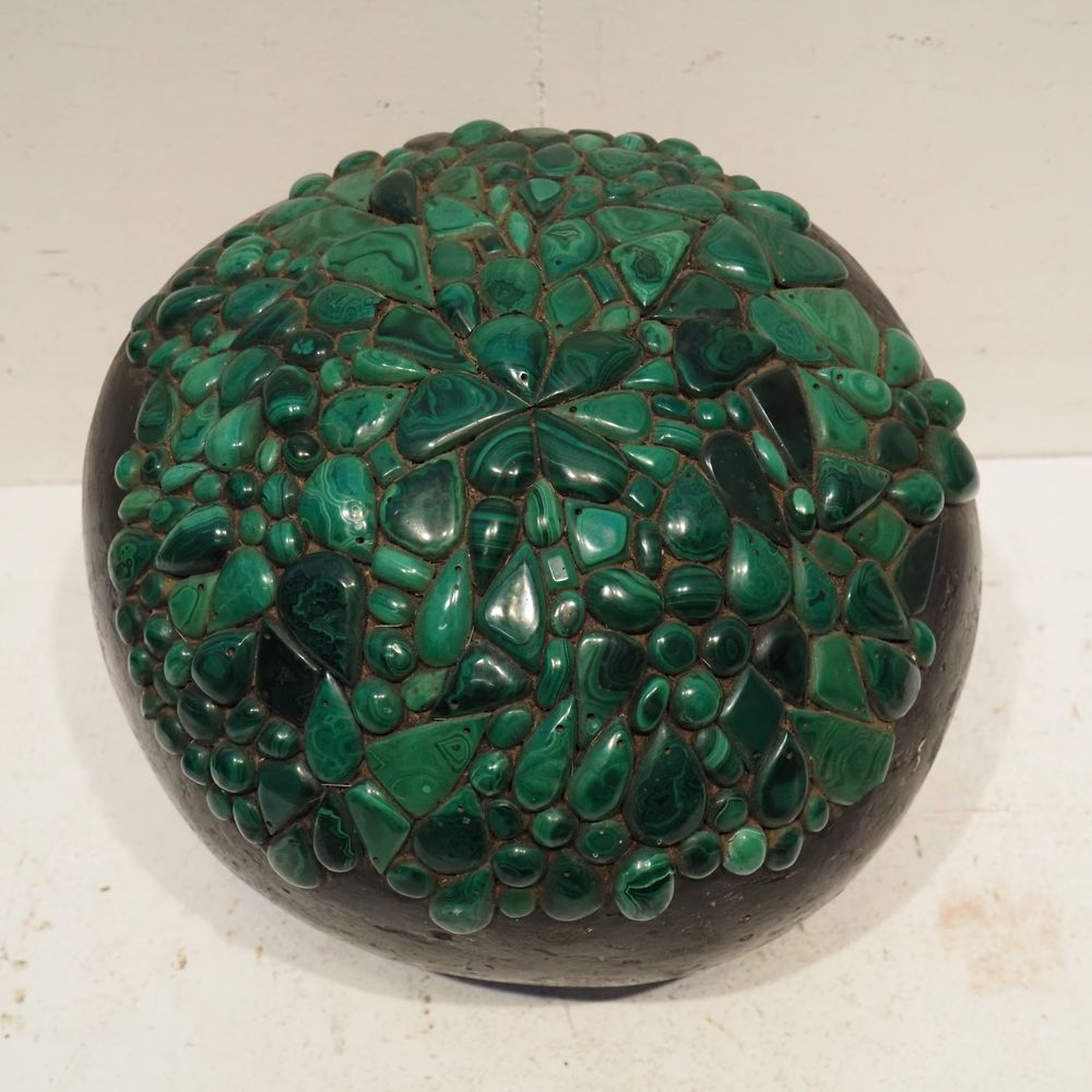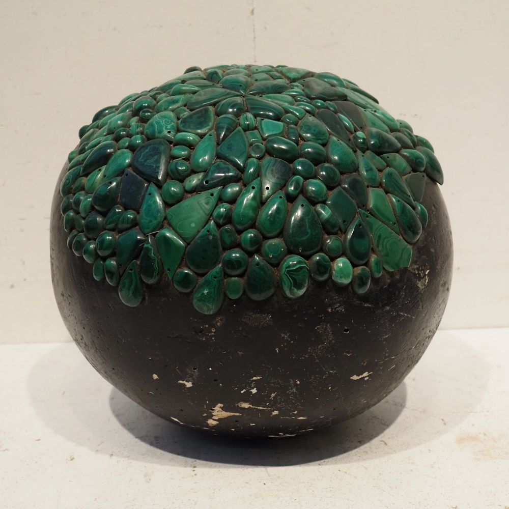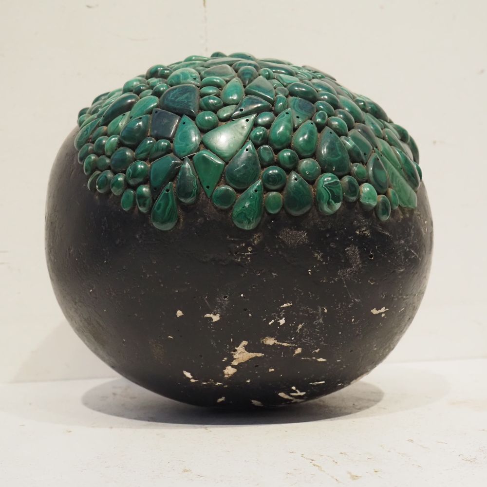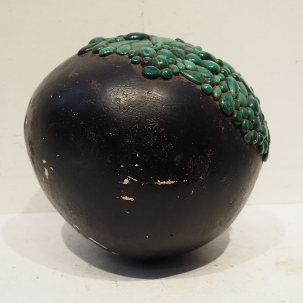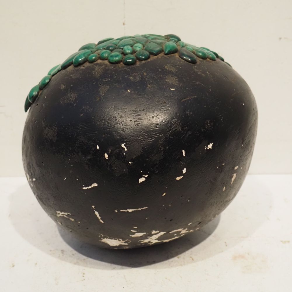 Ado Chale 1928-2025 : Sculpture sphèrique vers 1980, plâtre peint noir et partiellement plaqué de boutons de malachites, signée à la base, diam: 34 cm
