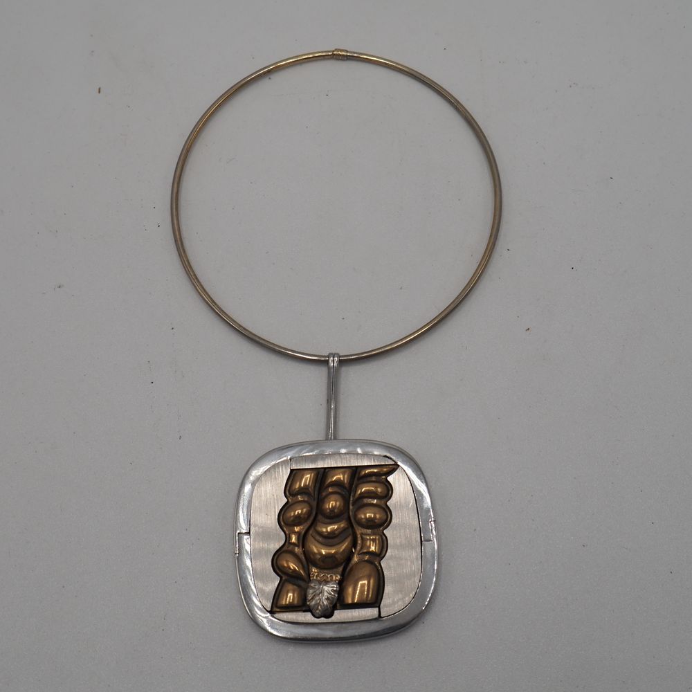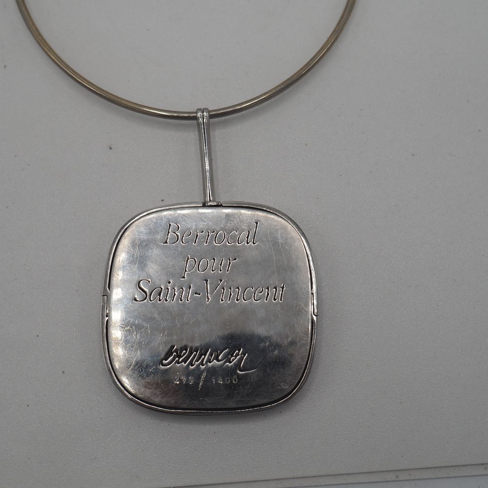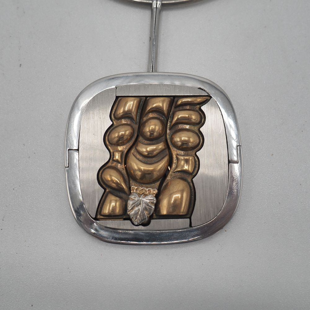 Miguel Berrocal Ortiz (Malaga 1933-2006) : Collier « Saint Vincent », acier brossé, métal chromé et laiton doré, démontable, titré et signé au dos, numéroté sur 1400, manque support de présentation et vis ras du coup défectueuse, dim médaillon: 6,8 x 6,8 cm