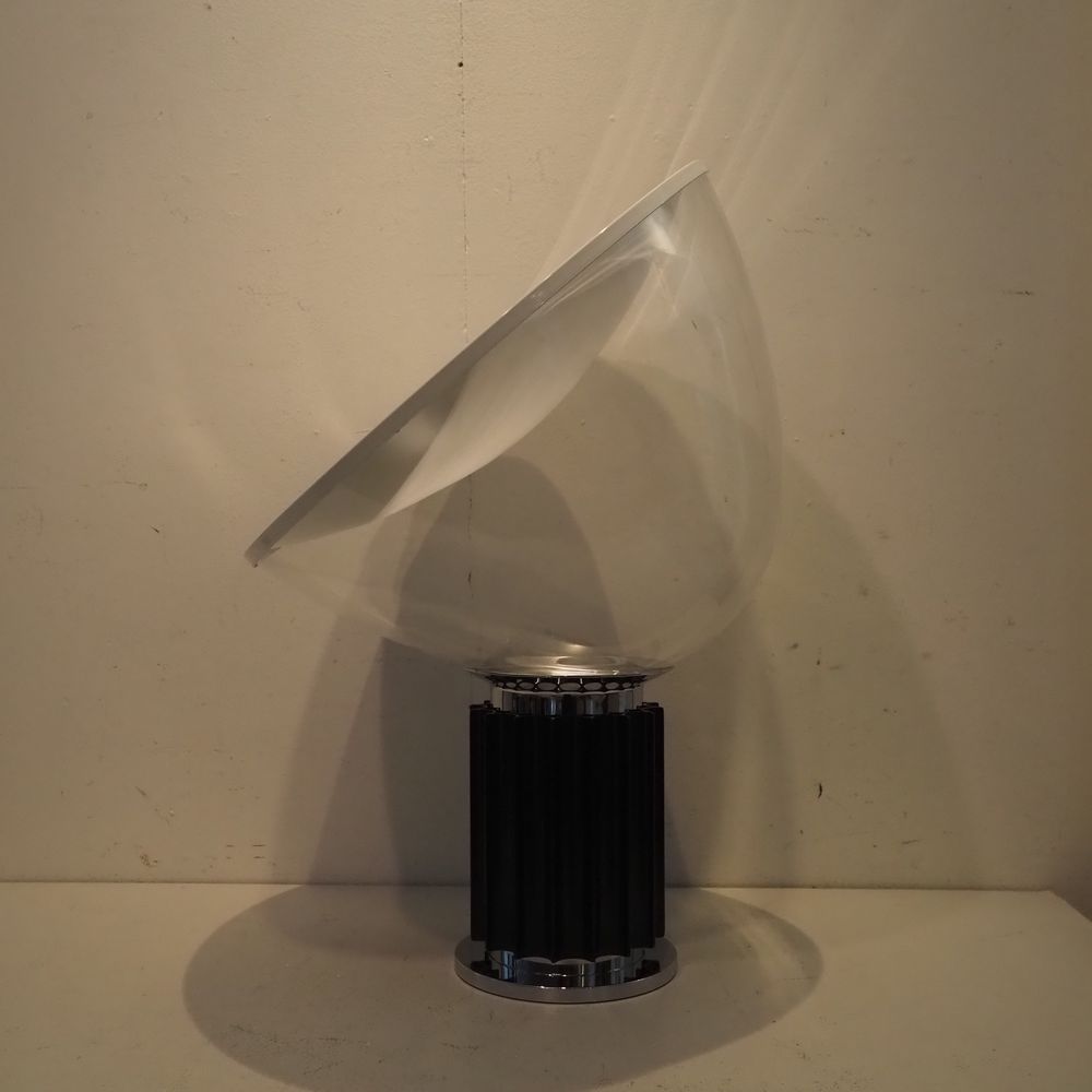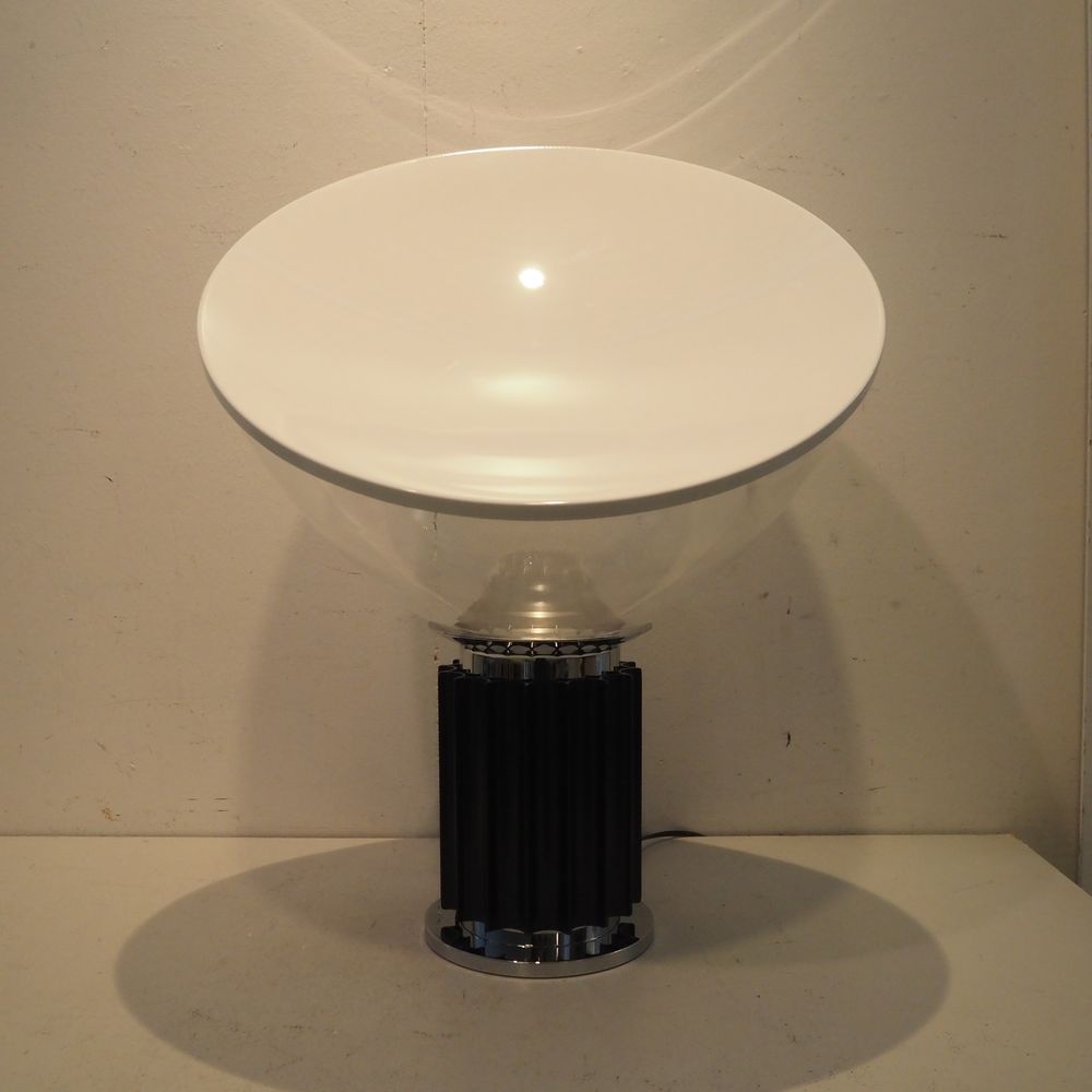 Achille & Pier Castiglioni (XX-XXI) / Flos : Lampe d’ambiance, modèle Taccia, dessiné en 1967. Déflecteur en verre soufflé avec parabole en aluminium laqué blanc et base en métal laqué noir, production vers 2020, état proche du neuf, H : 65, Ø : 50 cm