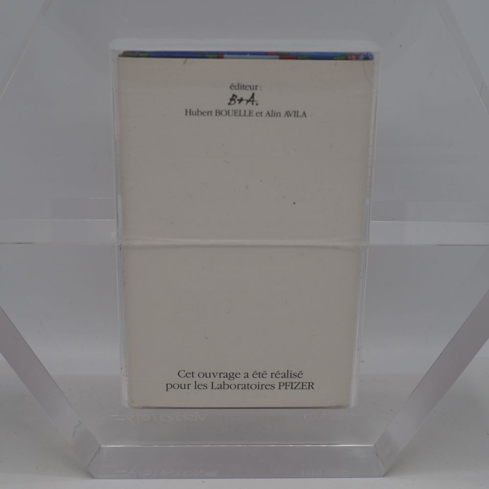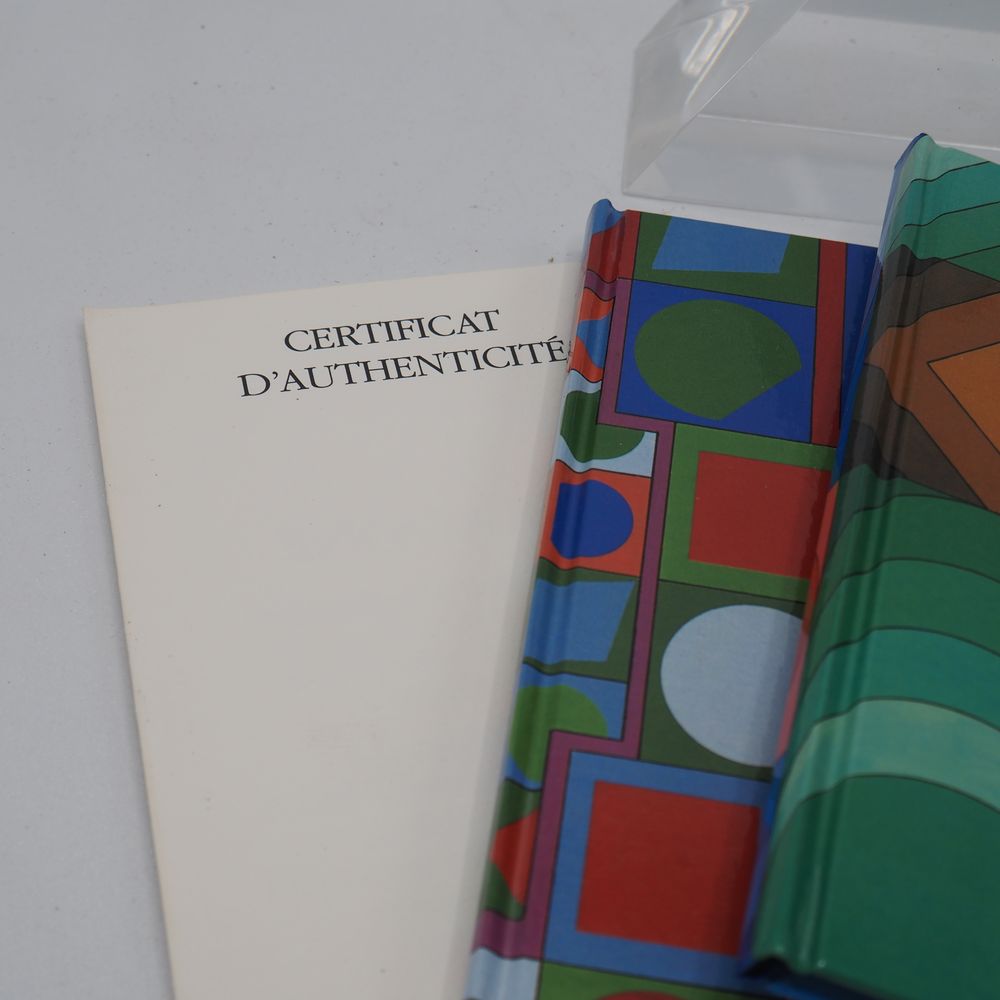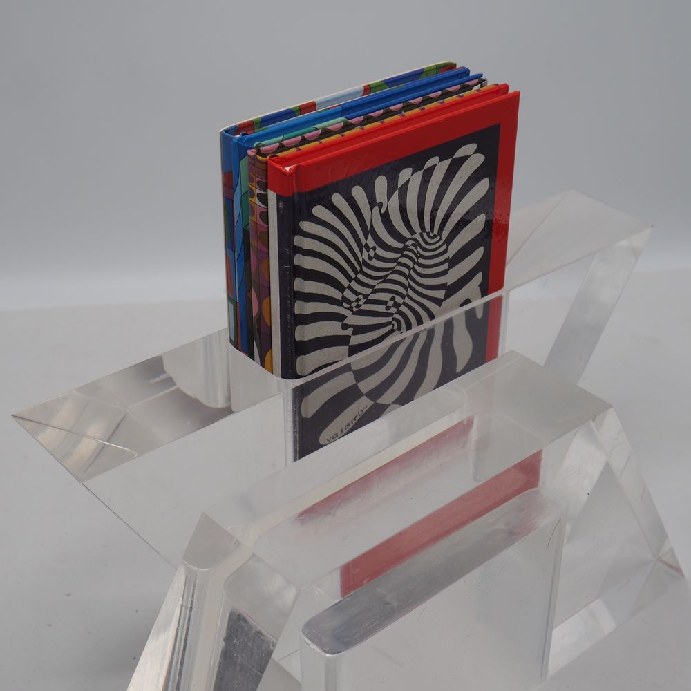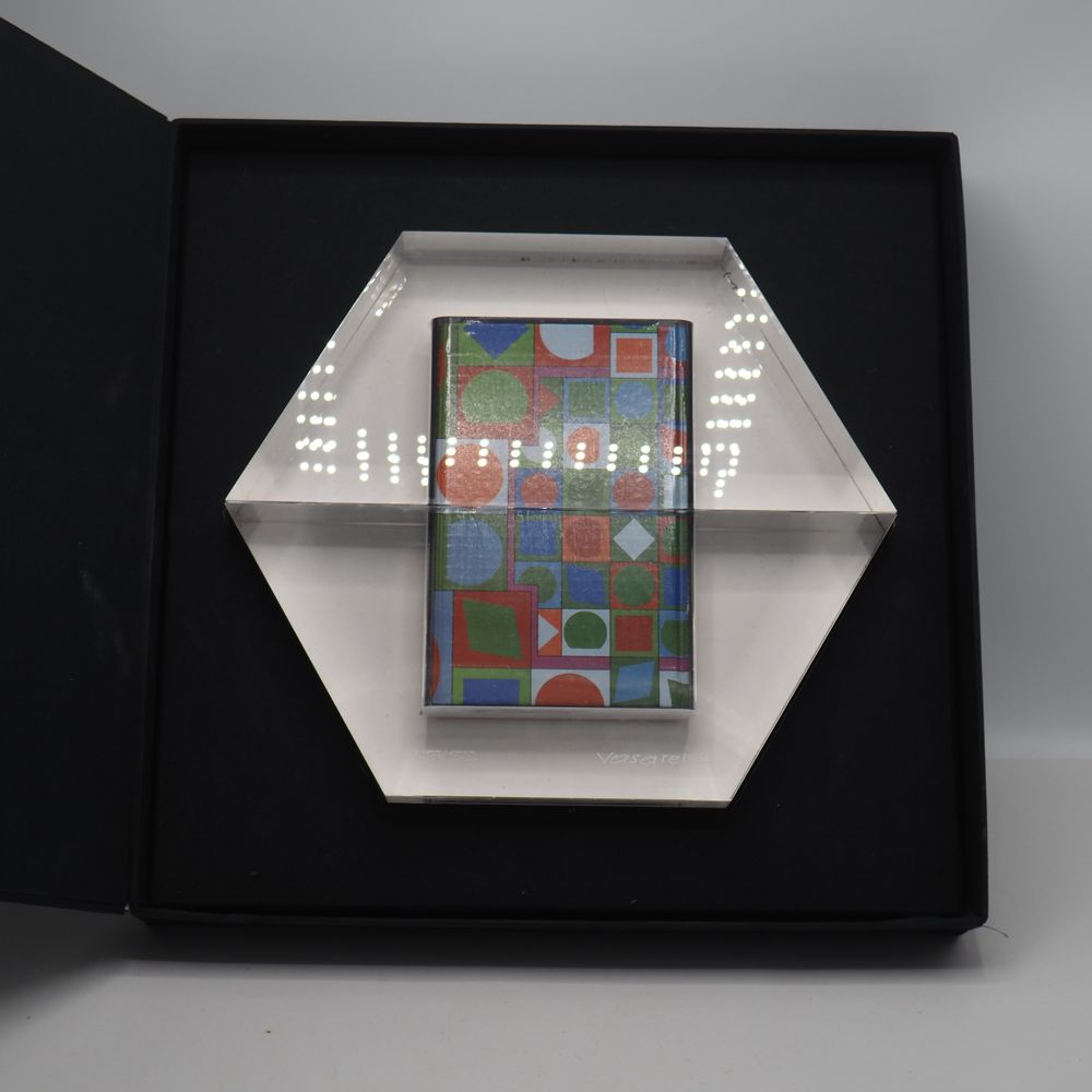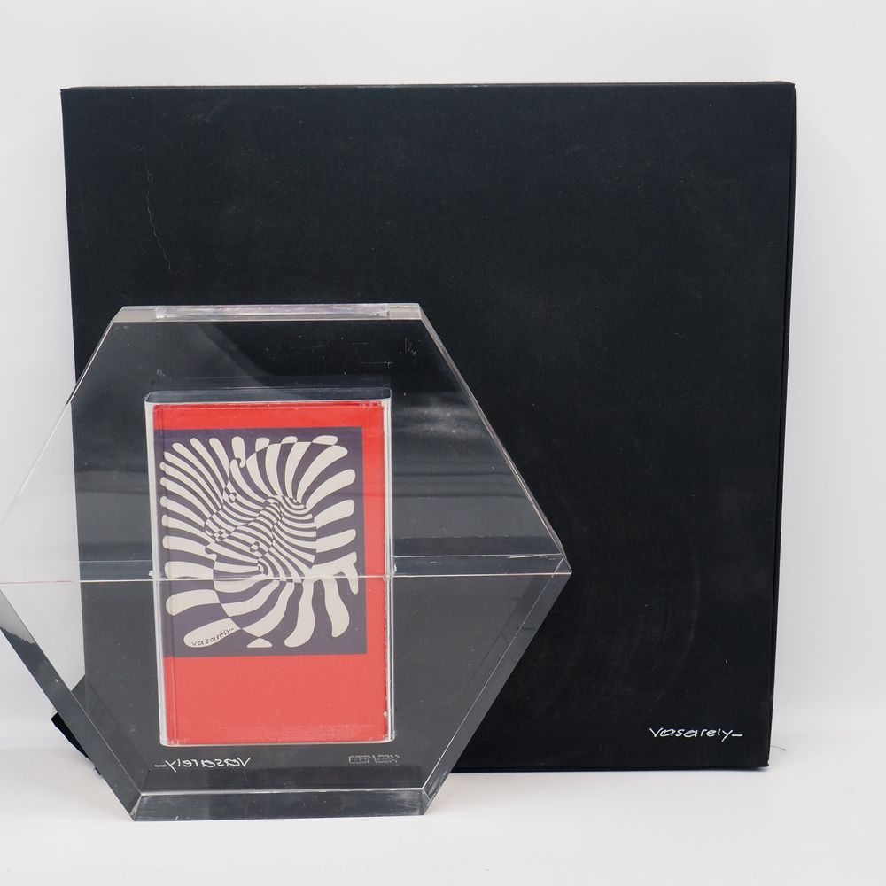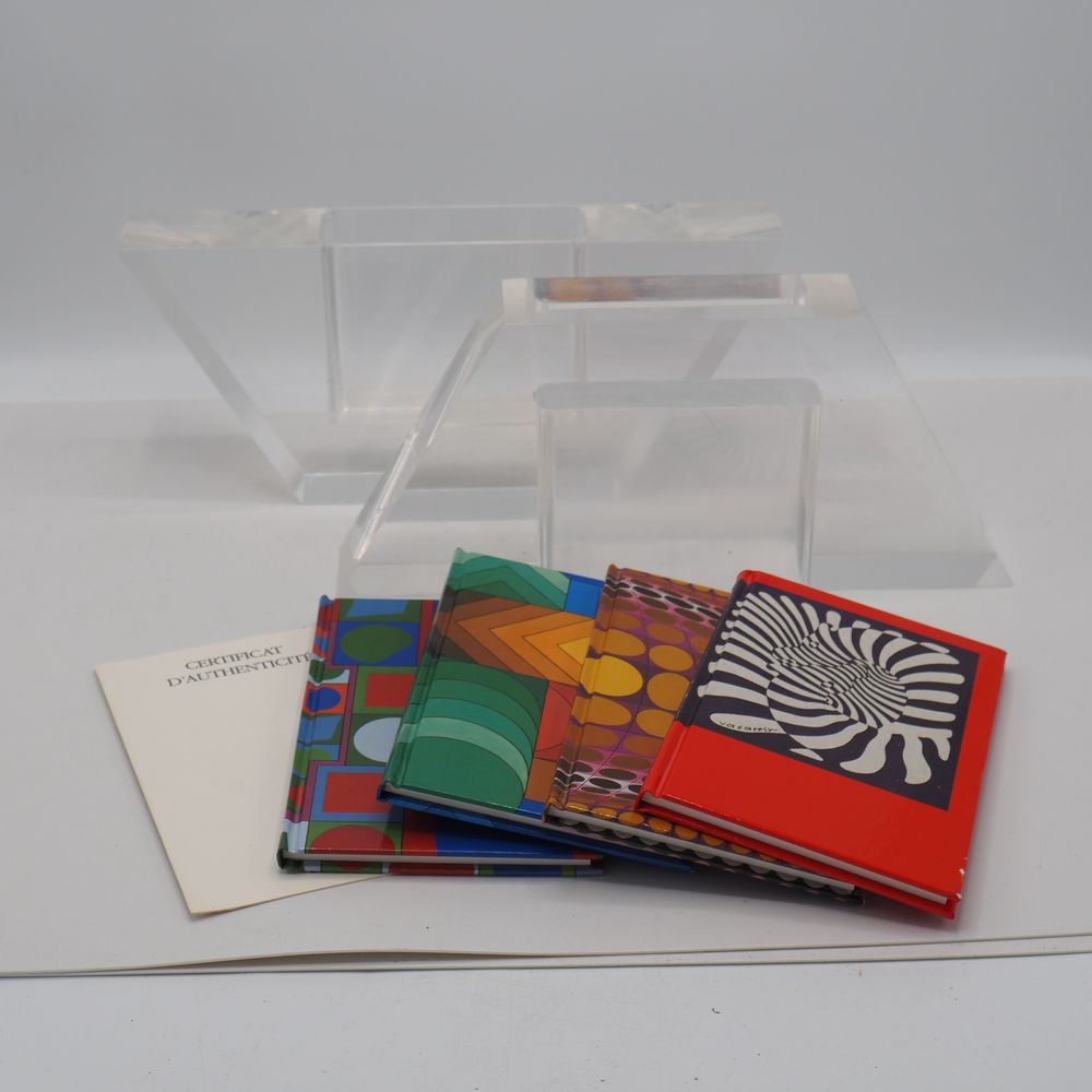 Victor Vasarely 1906-1997 : Ensemble de 4 livres inclus dans un bloc de plexiglas de forme hexagonale, coffret, signé et numéroté 1435/1500, H sculpture: 26, L: 30, P: 5 cm