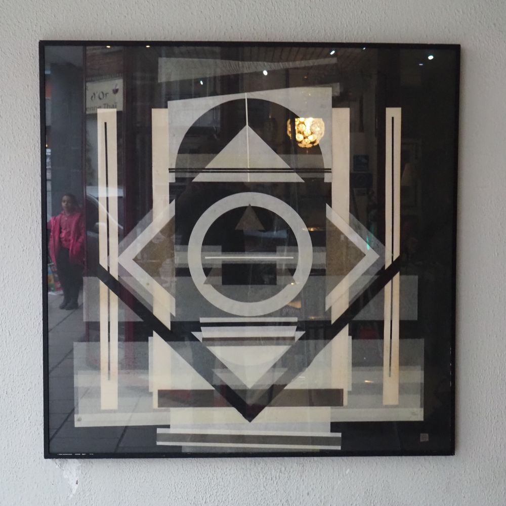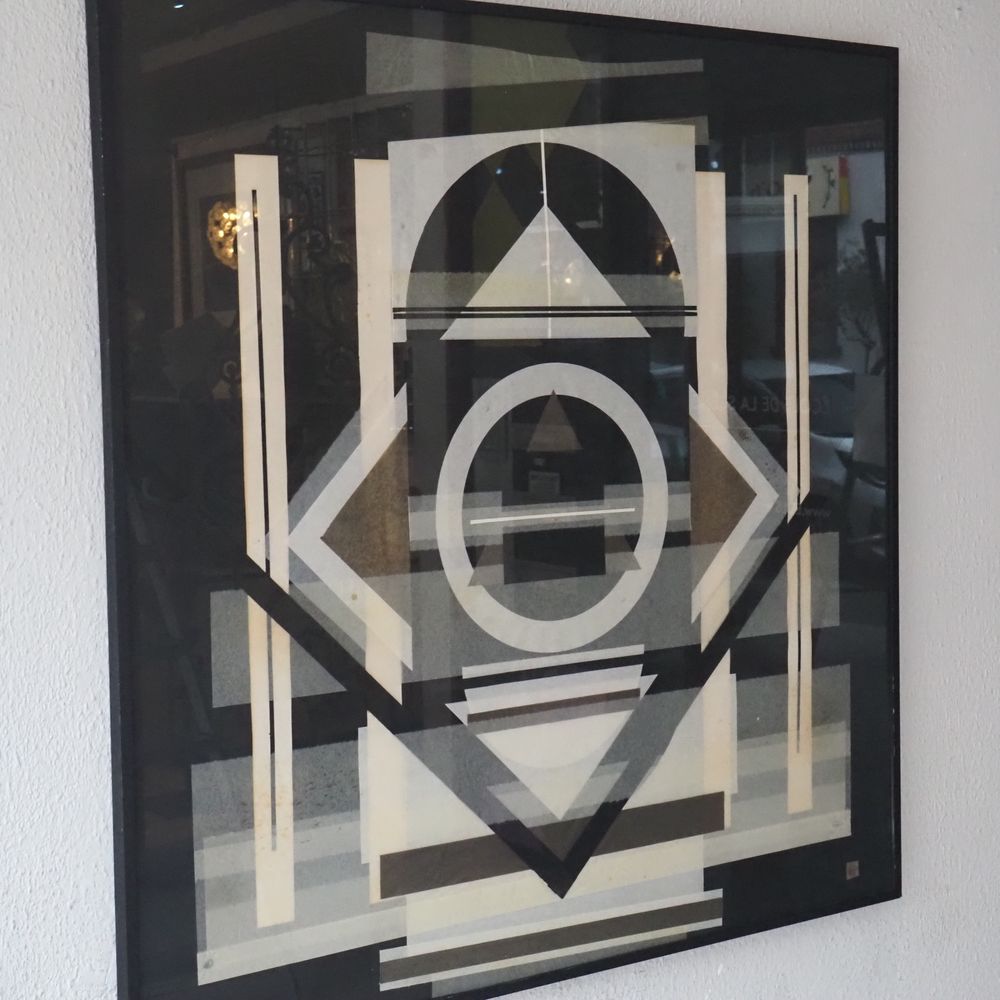 HD : Composition géométrique, découpage et collage, carton, papier buvoir et divers papiers, monogrammée en bas à droite, dim: 109 x 109 cm