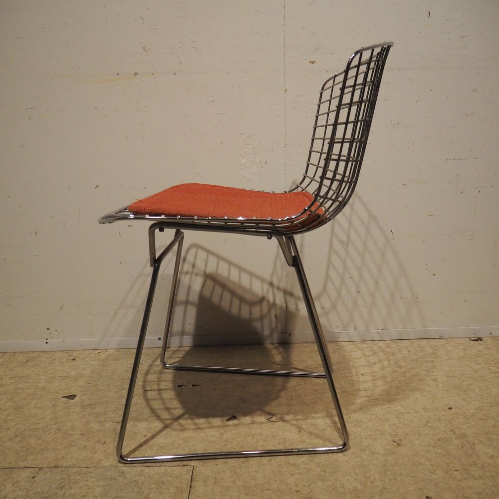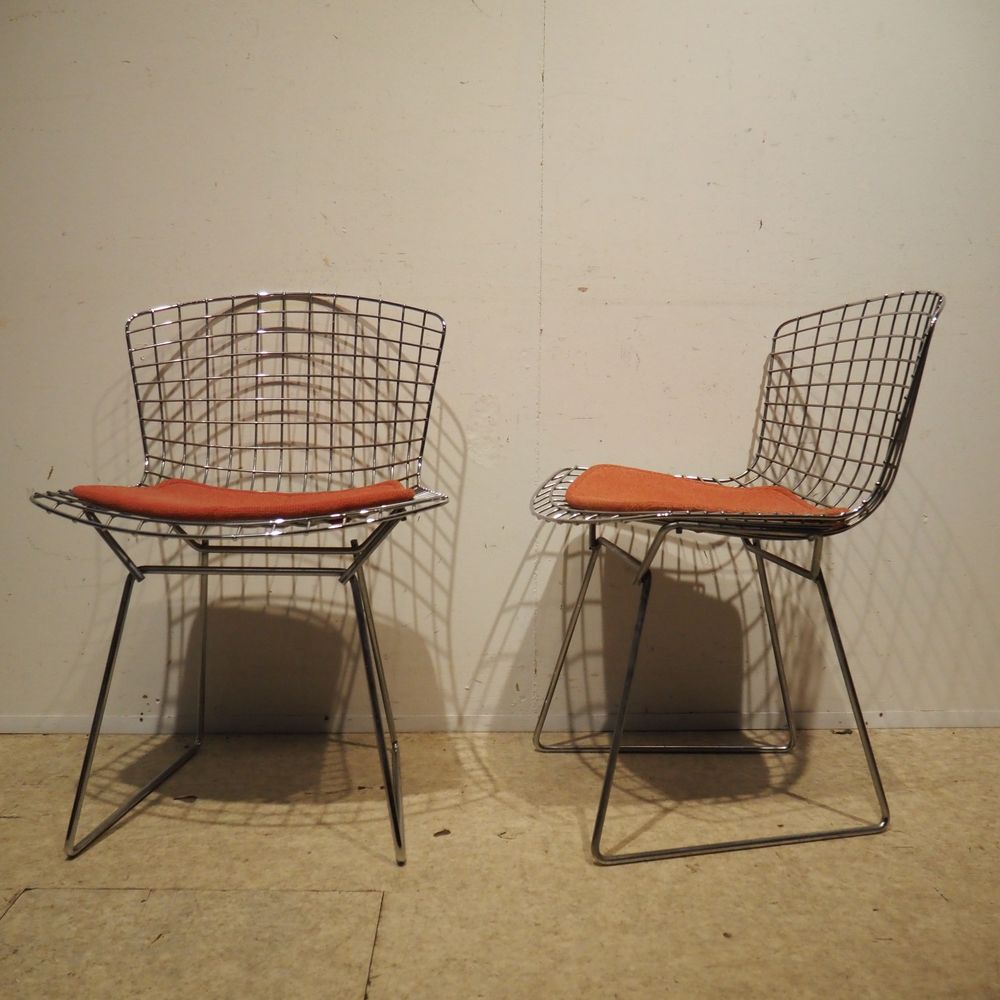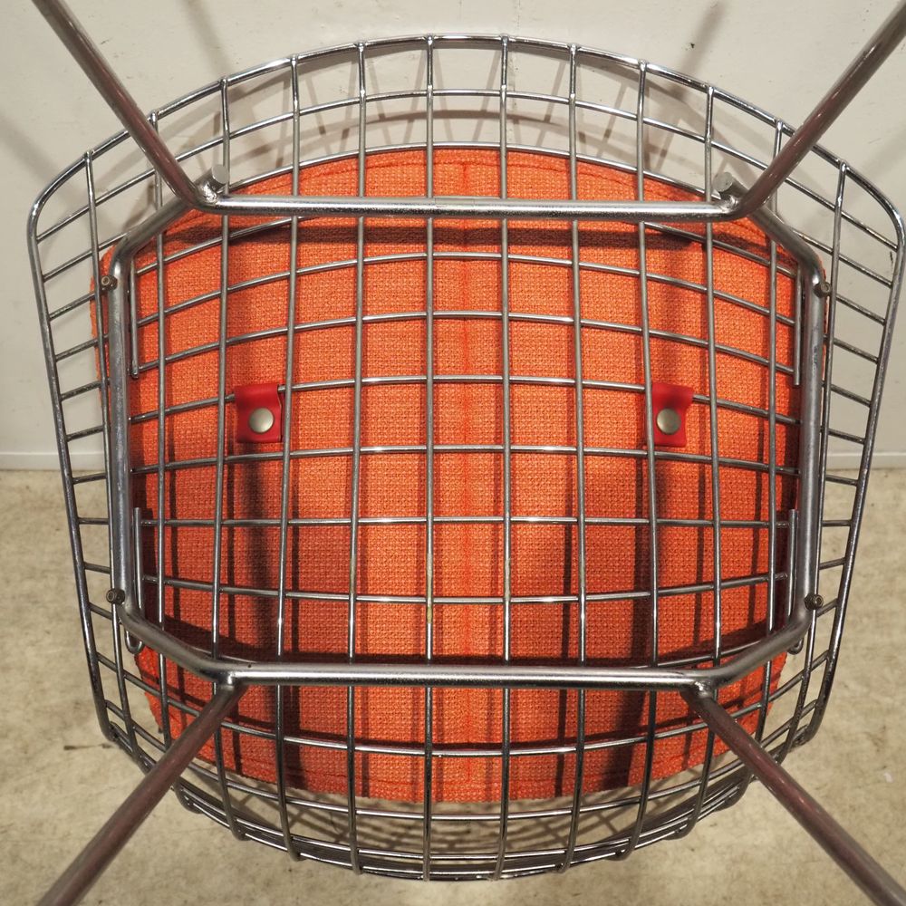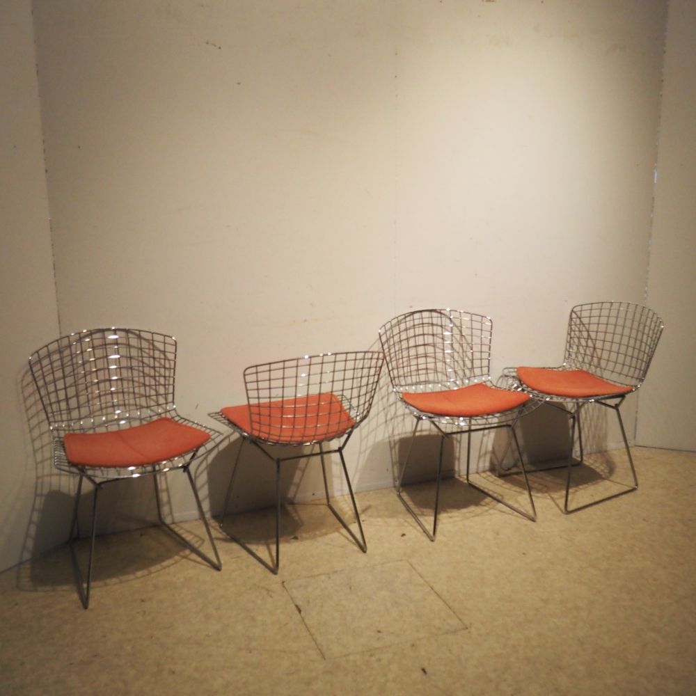 Harry Bertoia / Knoll : Suite de 4 chaises, modèle Wire, dessiné en 1951, fils d’acier cintré chromé soudé à l’electrolyse, assise avec galette tissu rose, bel état d’origine