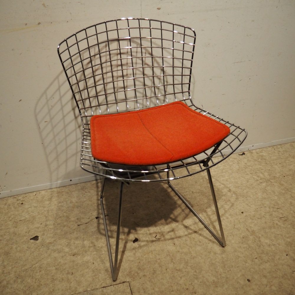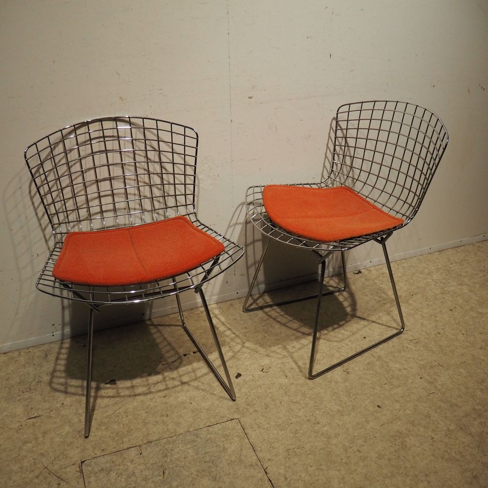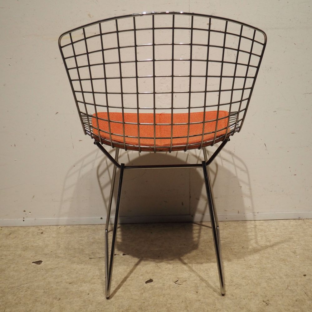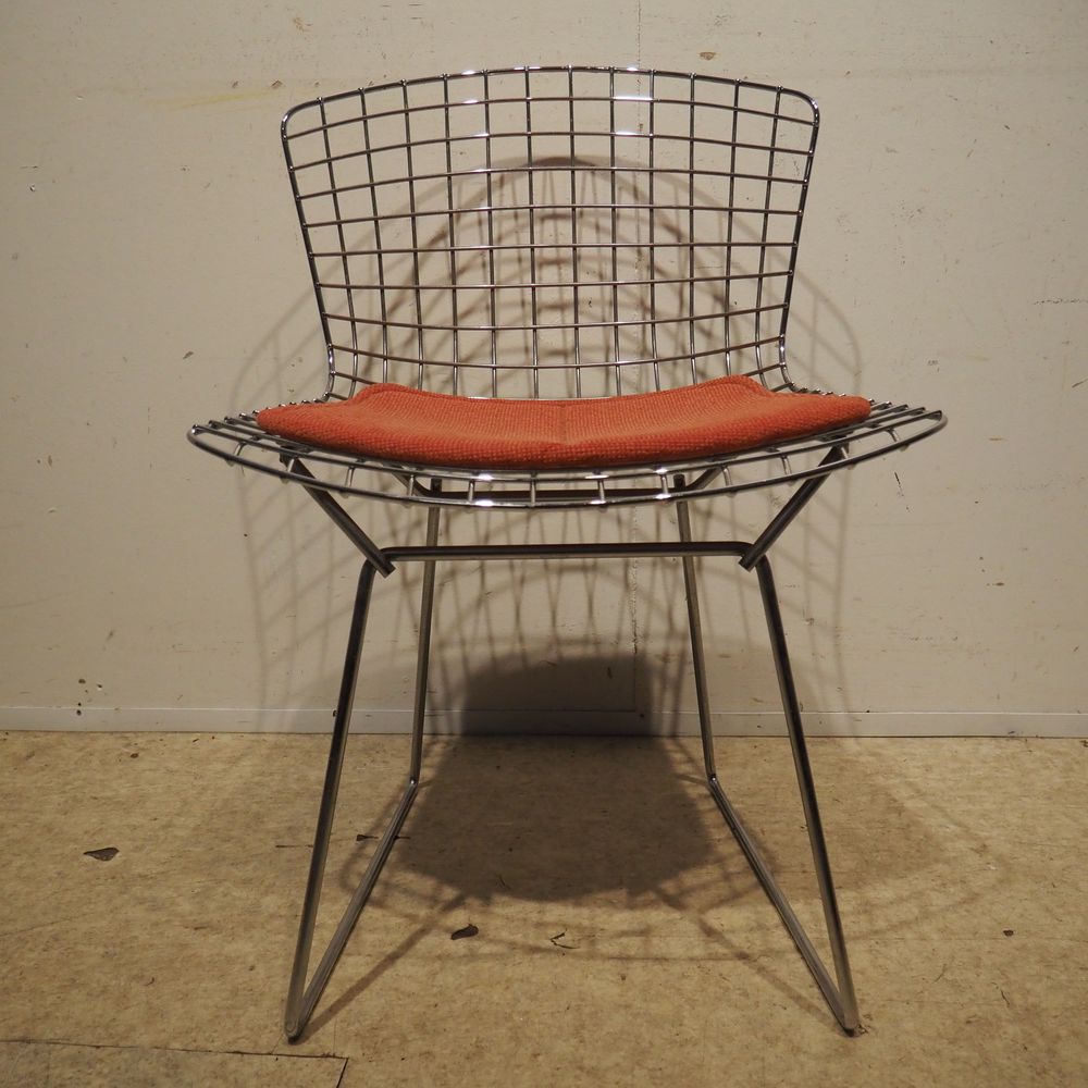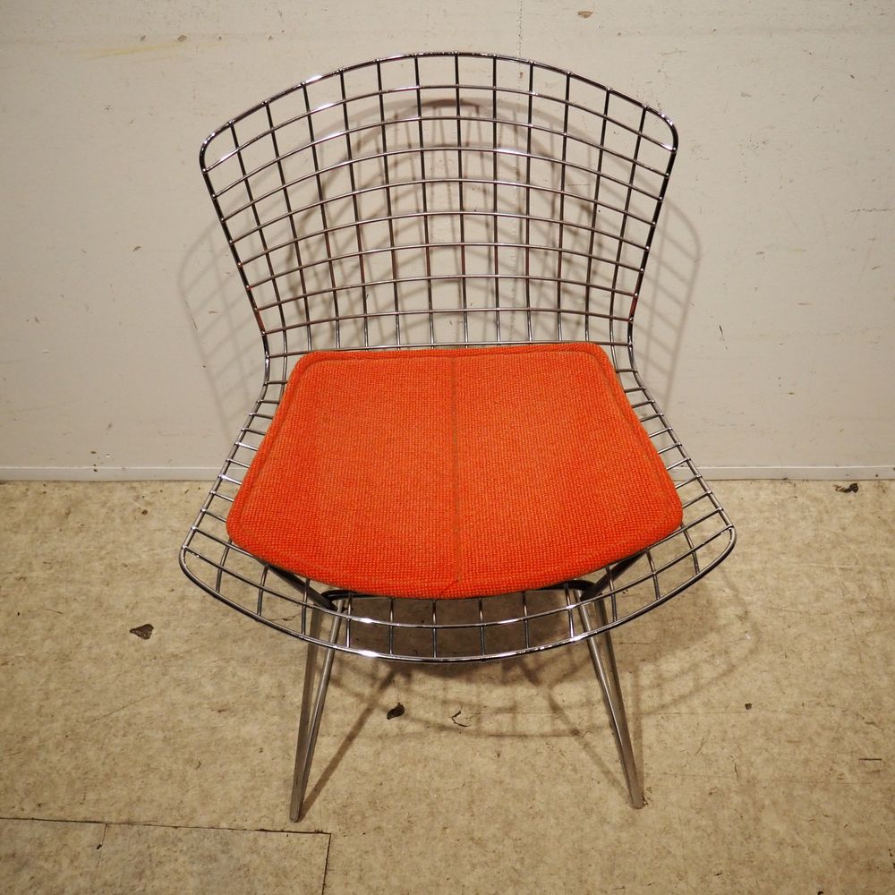 Harry Bertoia / Knoll : Suite de 4 chaises, modèle Wire, dessiné en 1951, fils d’acier cintré chromé soudé à l’electrolyse, assise avec galette tissu rose, bel état d’origine