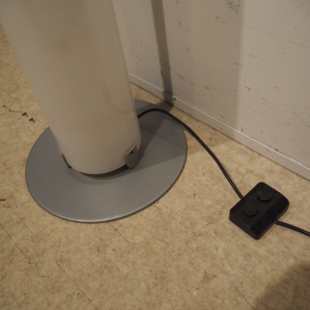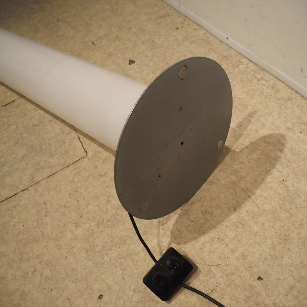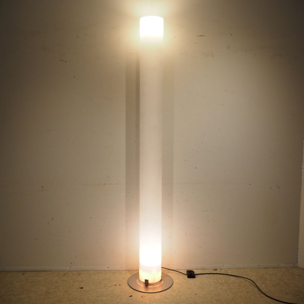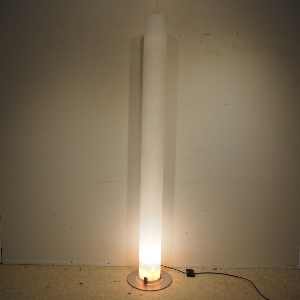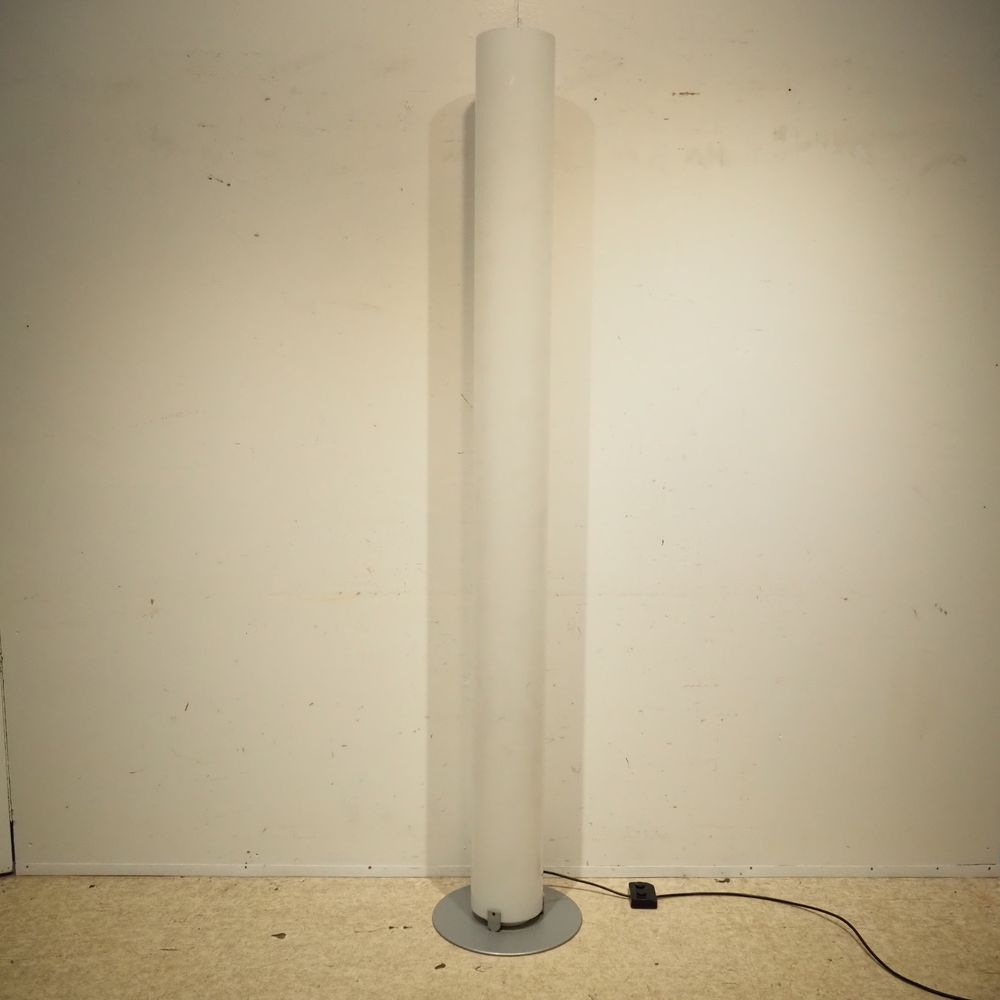 Castiglioni Pier & Achille / Flos : Lampadaire, modèle Stylos, fût cylindrique en perspex blanc laiteux fixé à un pied disque en métal laqué gris, bon état d’origine proche du neuf, H: 199 cm