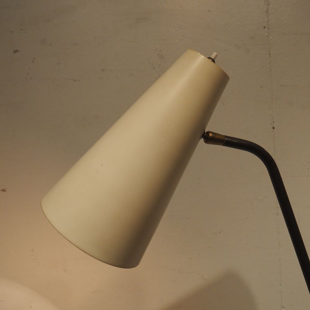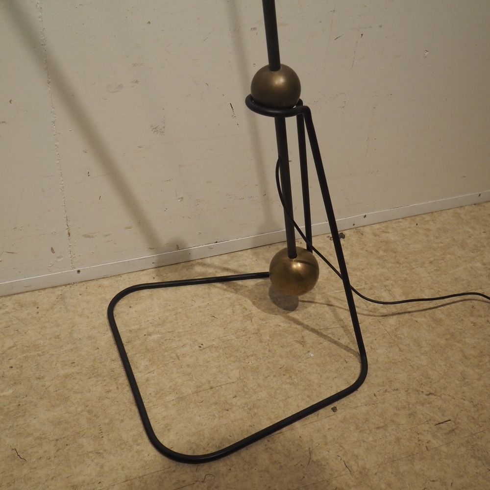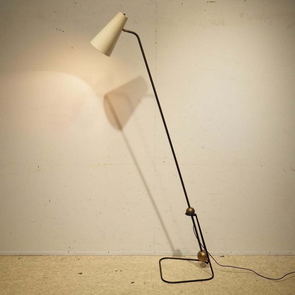 Pierre Guariche 1926-1995 / Pierre Disderot : Lampadaire vers 1951, modèle G2 equilibrium, fut en laiton doré avec contre-poids posé sur un pied en fer forgé, déflecteur conique avec rotule en métal laqué blanc, H: +/- 165 cm