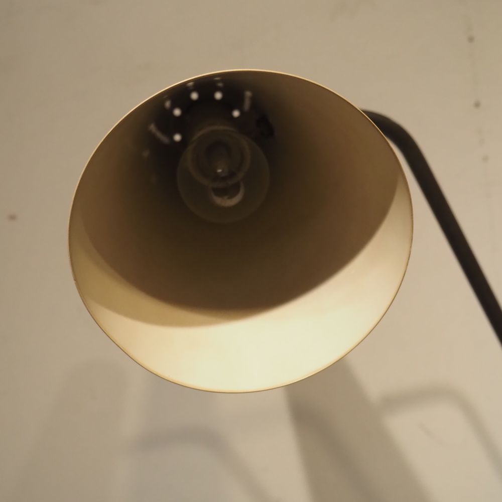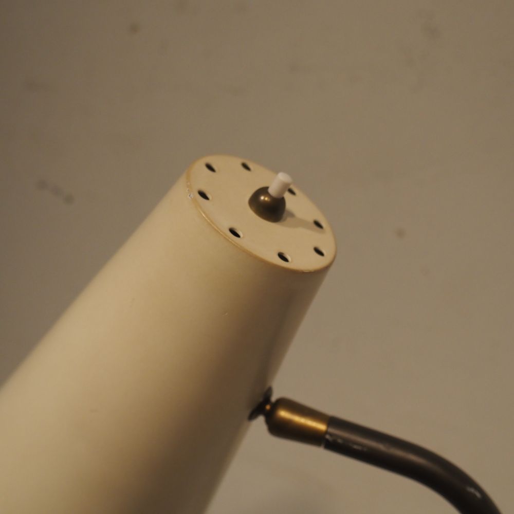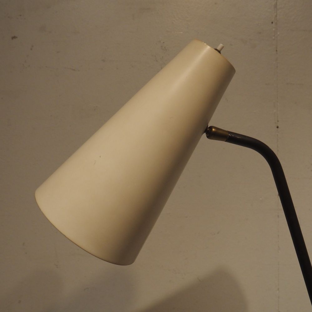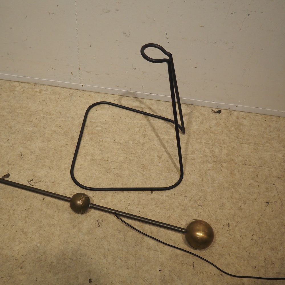 Pierre Guariche 1926-1995 / Pierre Disderot : Lampadaire vers 1951, modèle G2 equilibrium, fut en laiton doré avec contre-poids posé sur un pied en fer forgé, déflecteur conique avec rotule en métal laqué blanc, H: +/- 165 cm